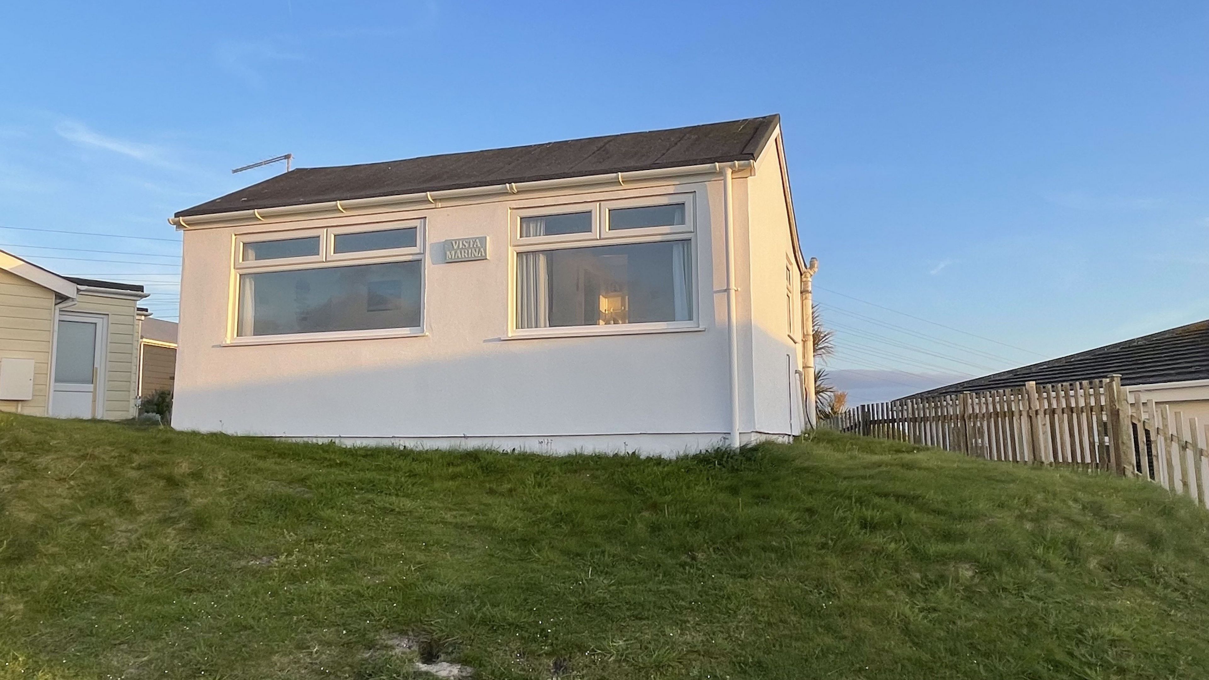 Outside: There is a picnic table from which to dine whilst enjoying the sea breezes and coastal views. Parking is in front of the chalet, there is a grassy slope to access the front door.