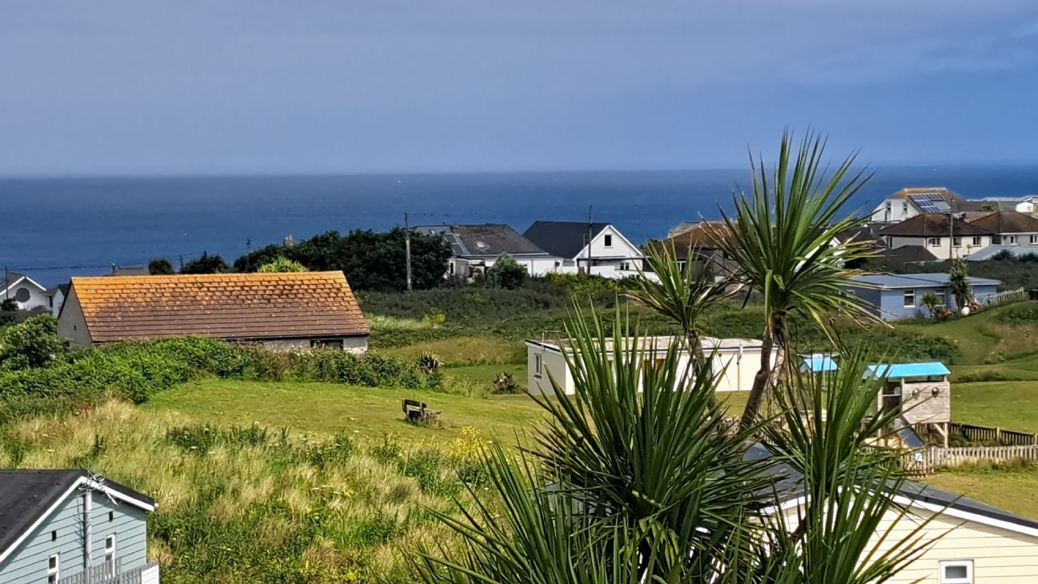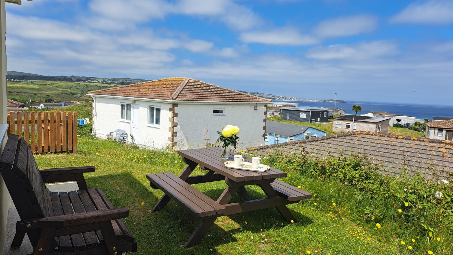 To the front of the property there is a open grass area with a bench, plus a picnic bench and panoramic sea views of St Ives Bay