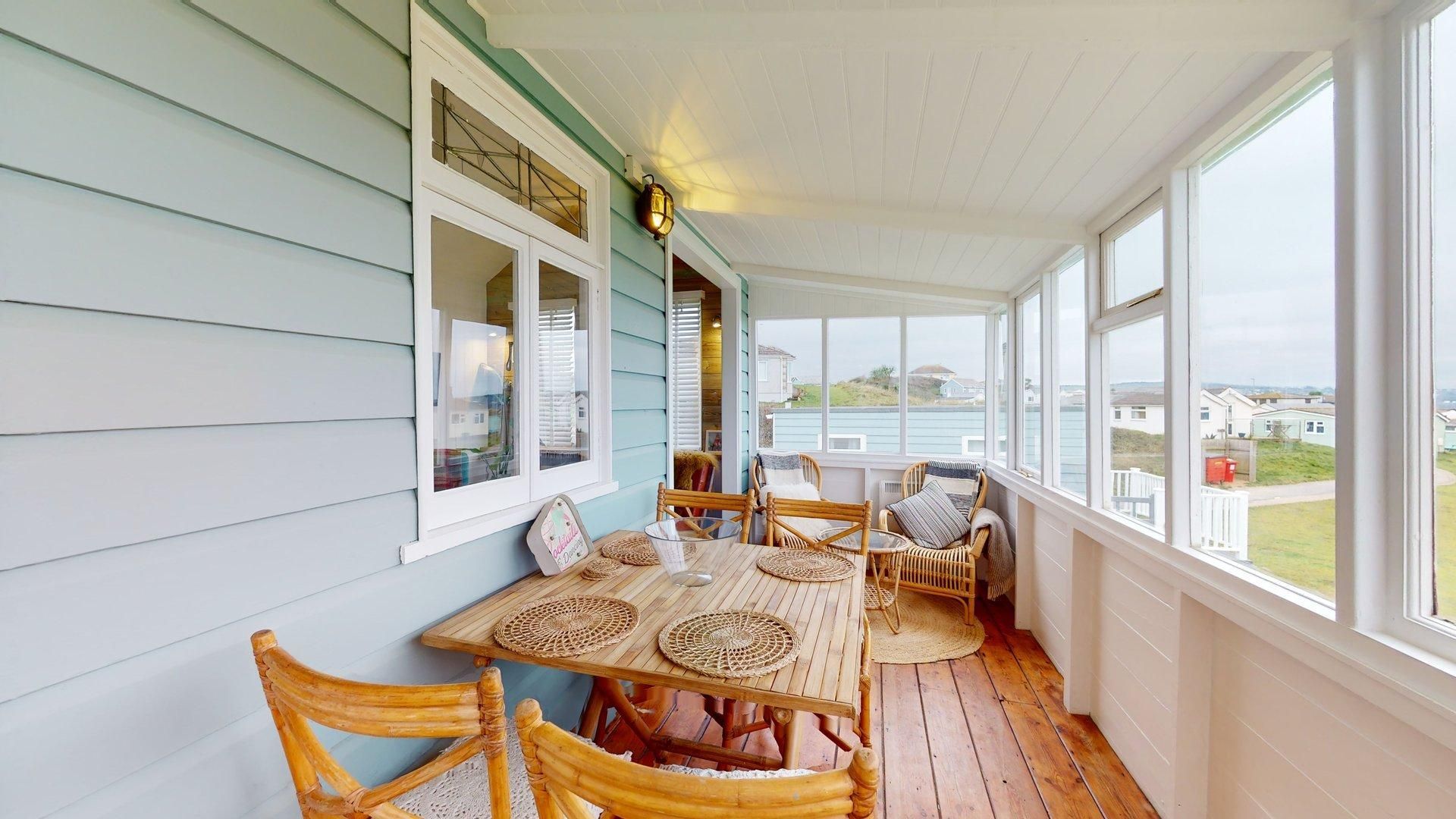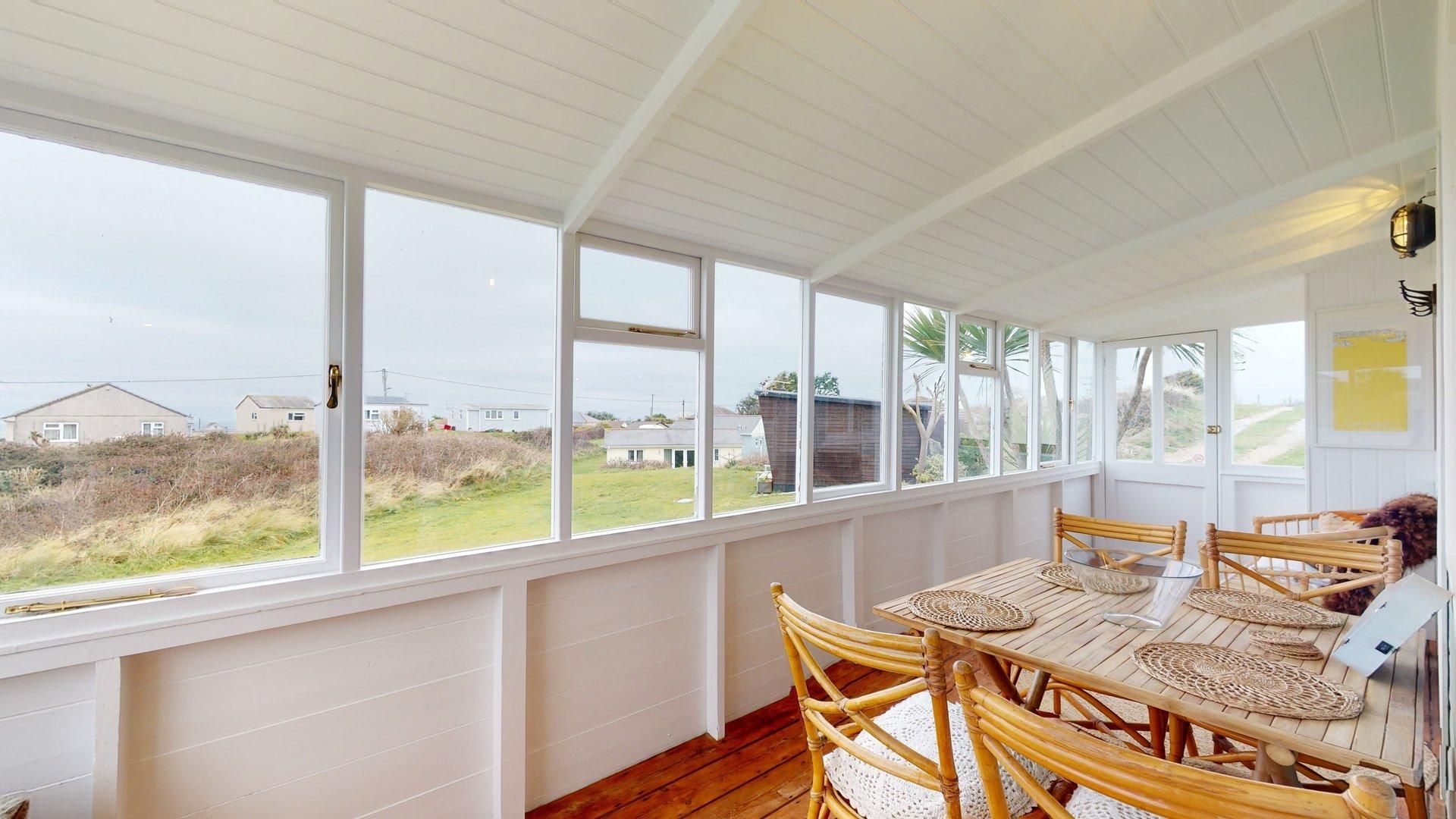 Veranda - A bright a sunny space with a sofa, two chairs, a dining table and four chairs, views across the park towards St. Ives Bay.