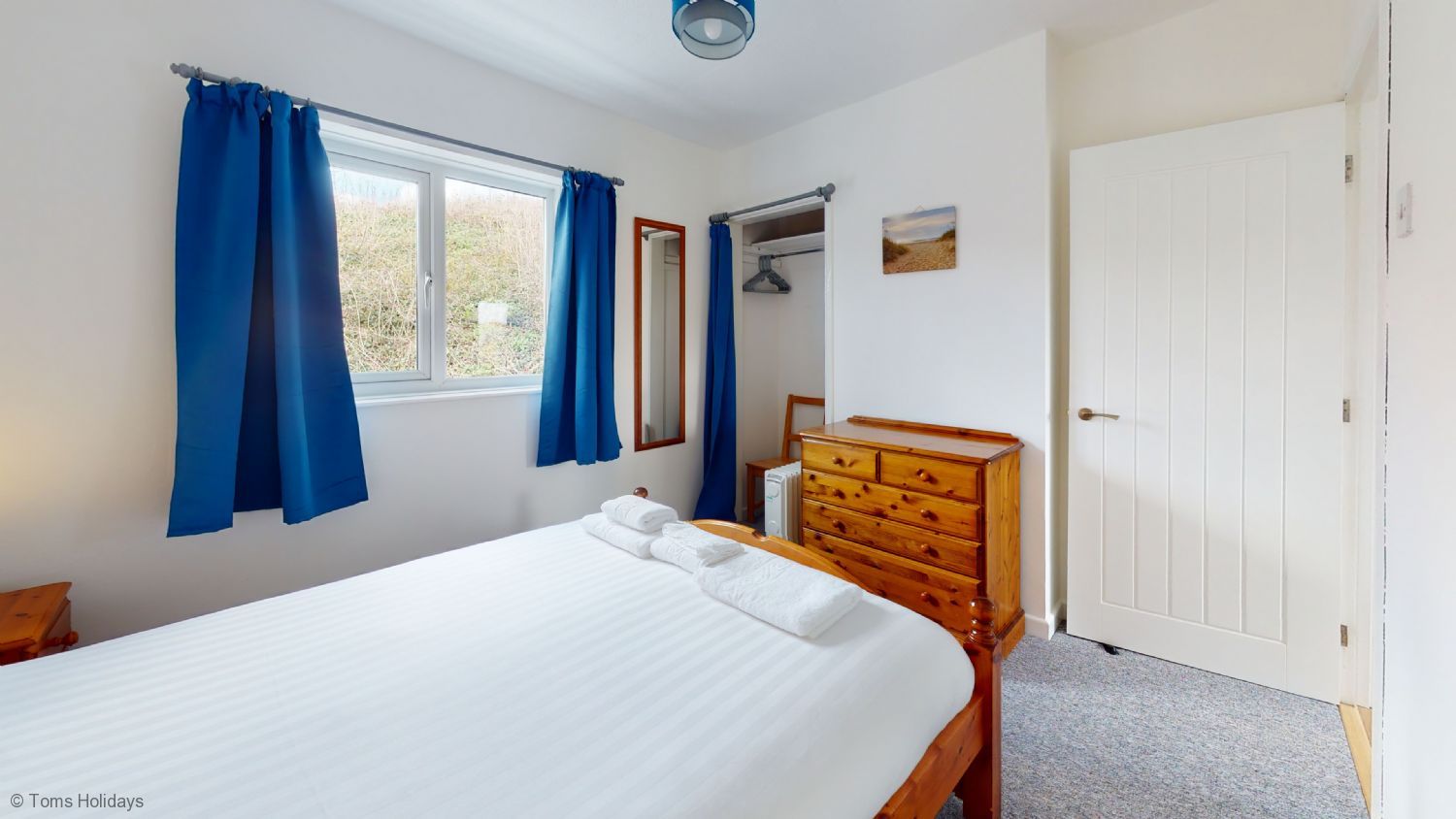 Bedroom 1- Double Bed, bedside tables, lamps, chest of drawers, built in wardrobe