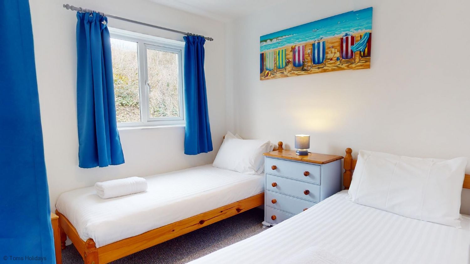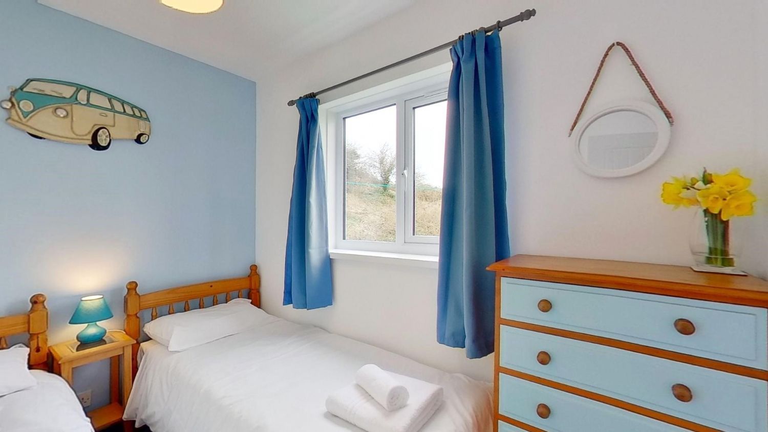 Bedroom 3 - 2 Single Beds, bedside table, lamp, chest of drawers