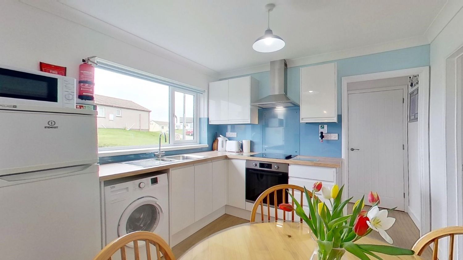Open Plan Kitchen/Dining/Living Area: Comfortable seating for 6, smart TV, nest of tables, dining table with seating available for 6. Fitted kitchen with built in oven and hob, microwave, fridge freezer and washing machine.