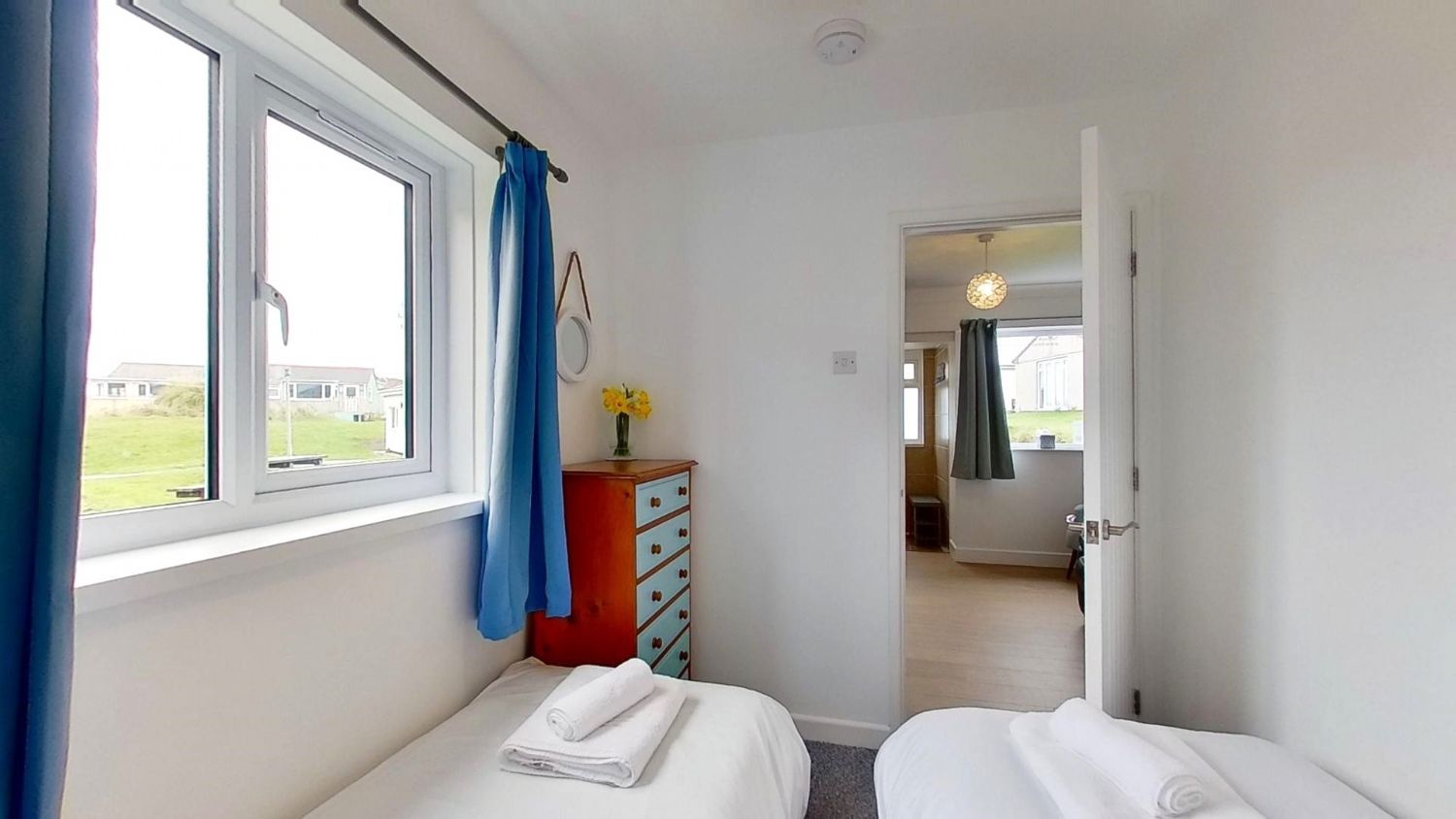 Bedroom 2 - 2 Single Beds, chest of drawers, lamp, built in wardrobe