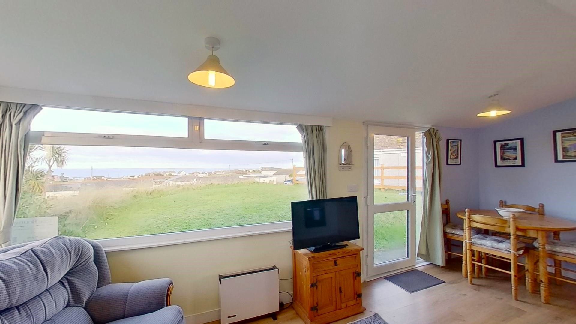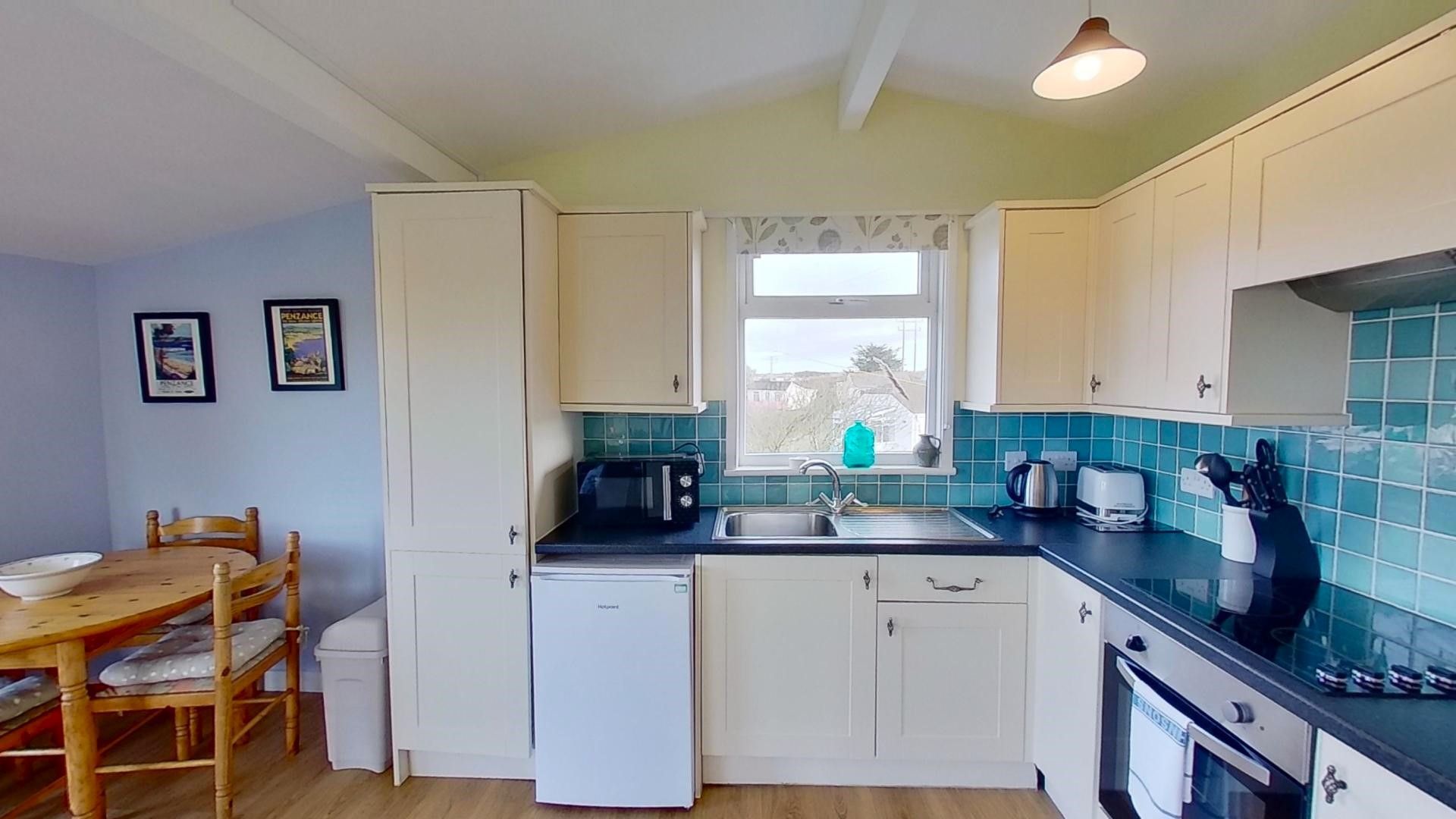 Living/Kitchen/Dining Area - Attractive, characterful open plan space with views across the bay to St Ives. There is a sofa and easy chairs, TV, dining table and chairs, fitted kitchen with electric oven and hob, fridge, microwave, plus good work surface and cupboard space.