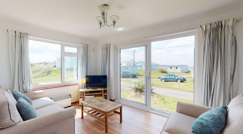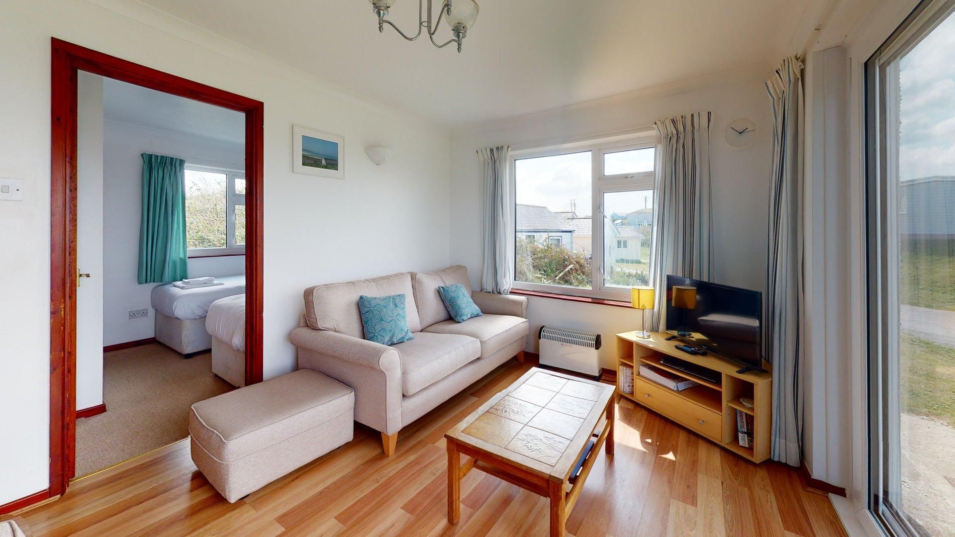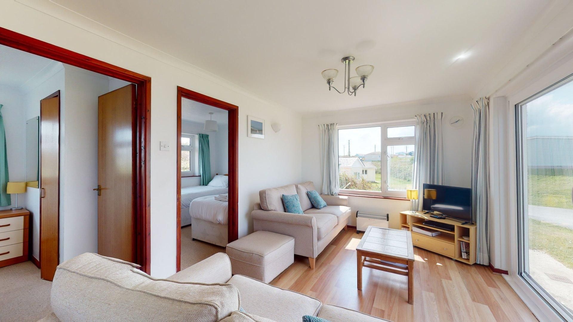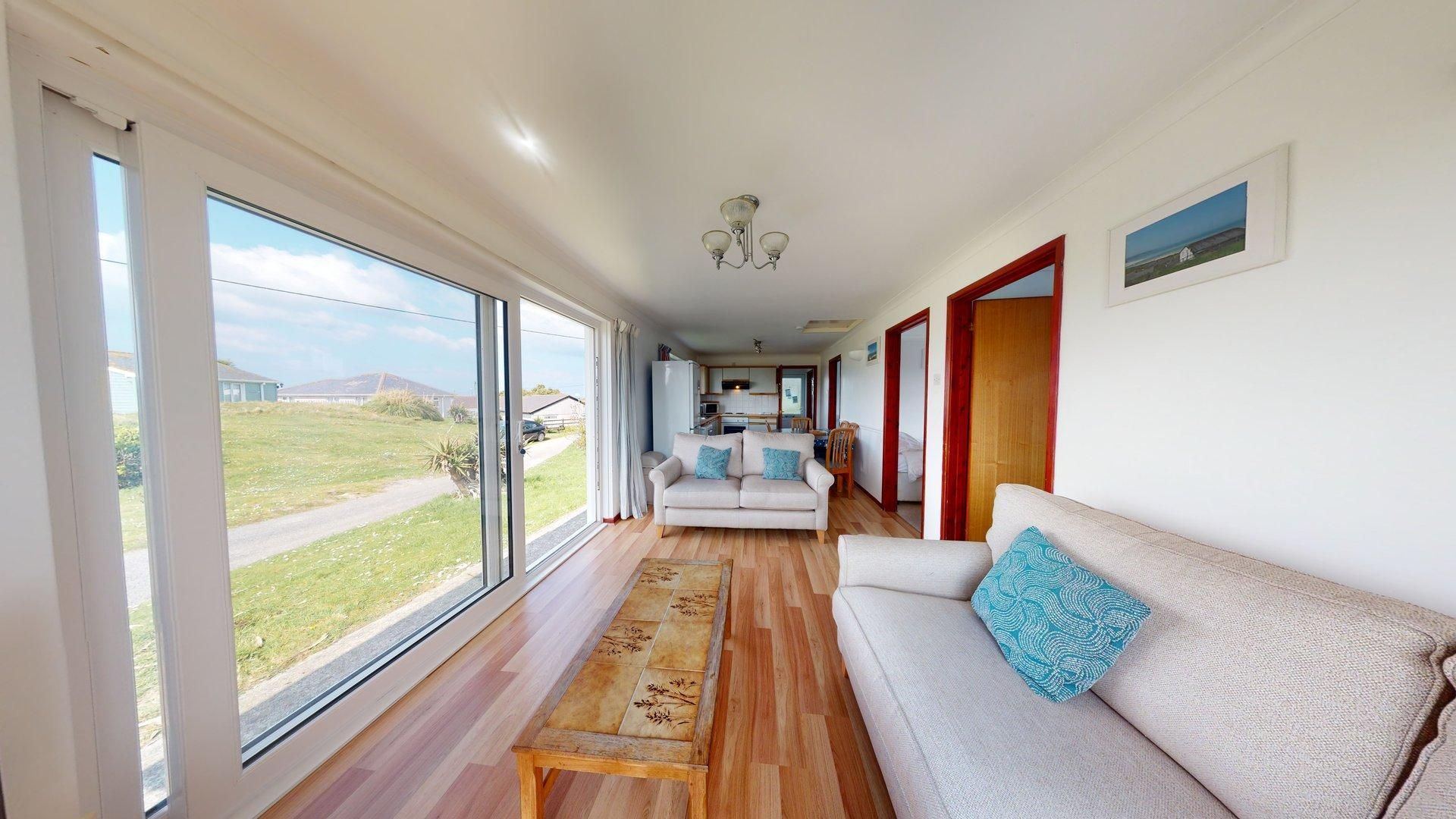 Living Area- Two comfy sofas, a TV and patio doors with view across to St. Ives.