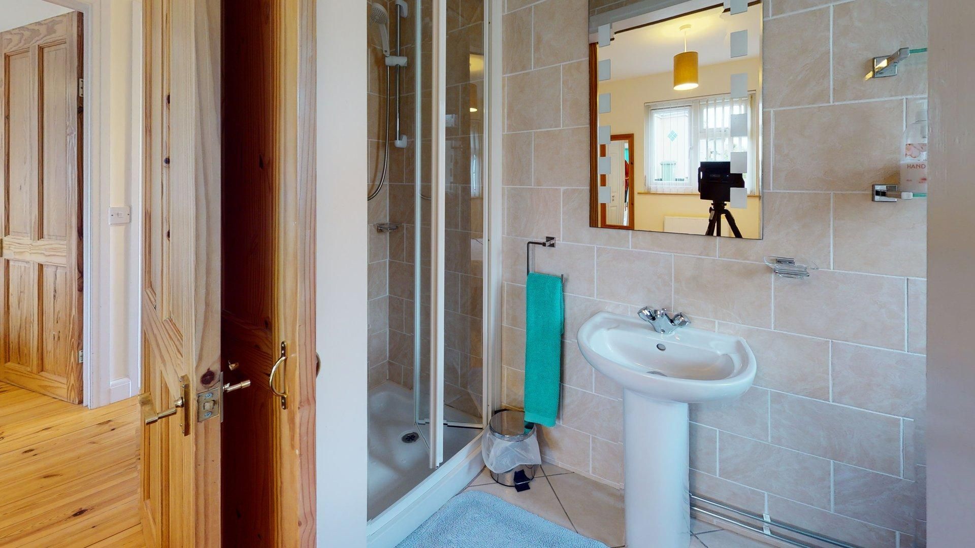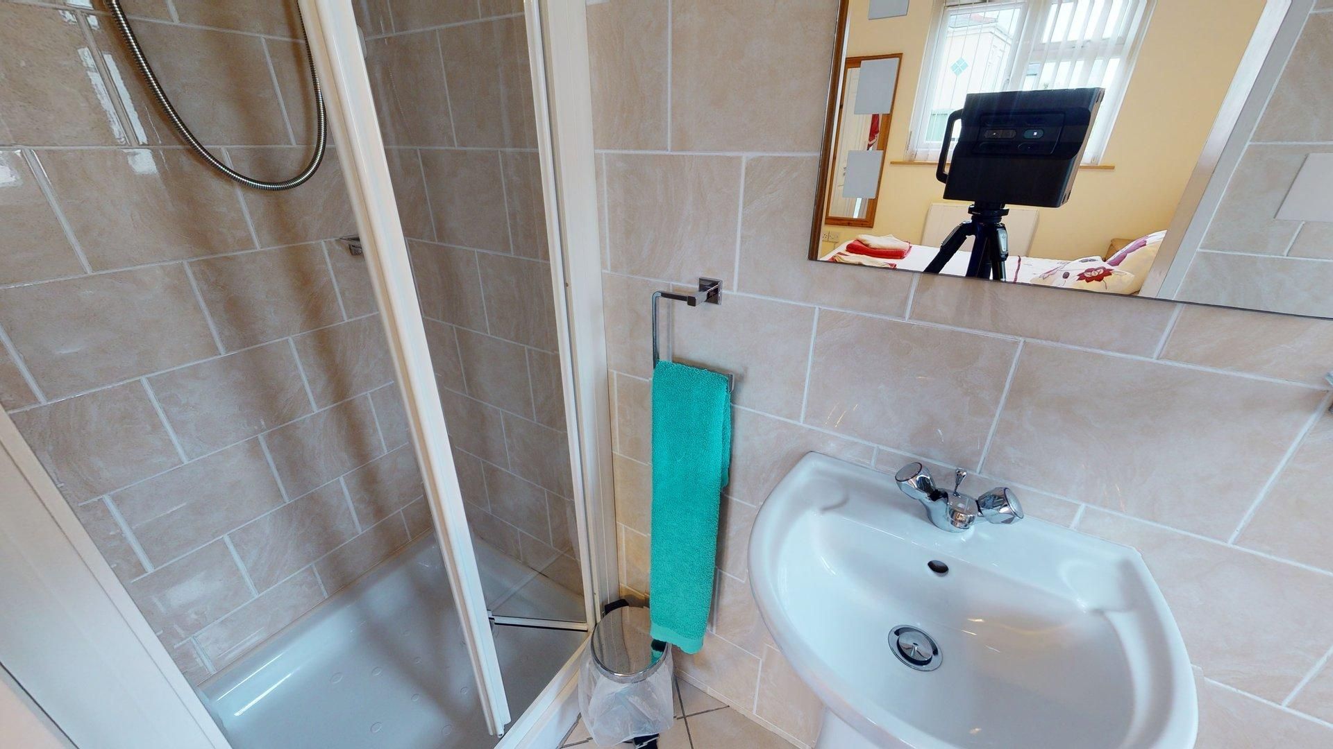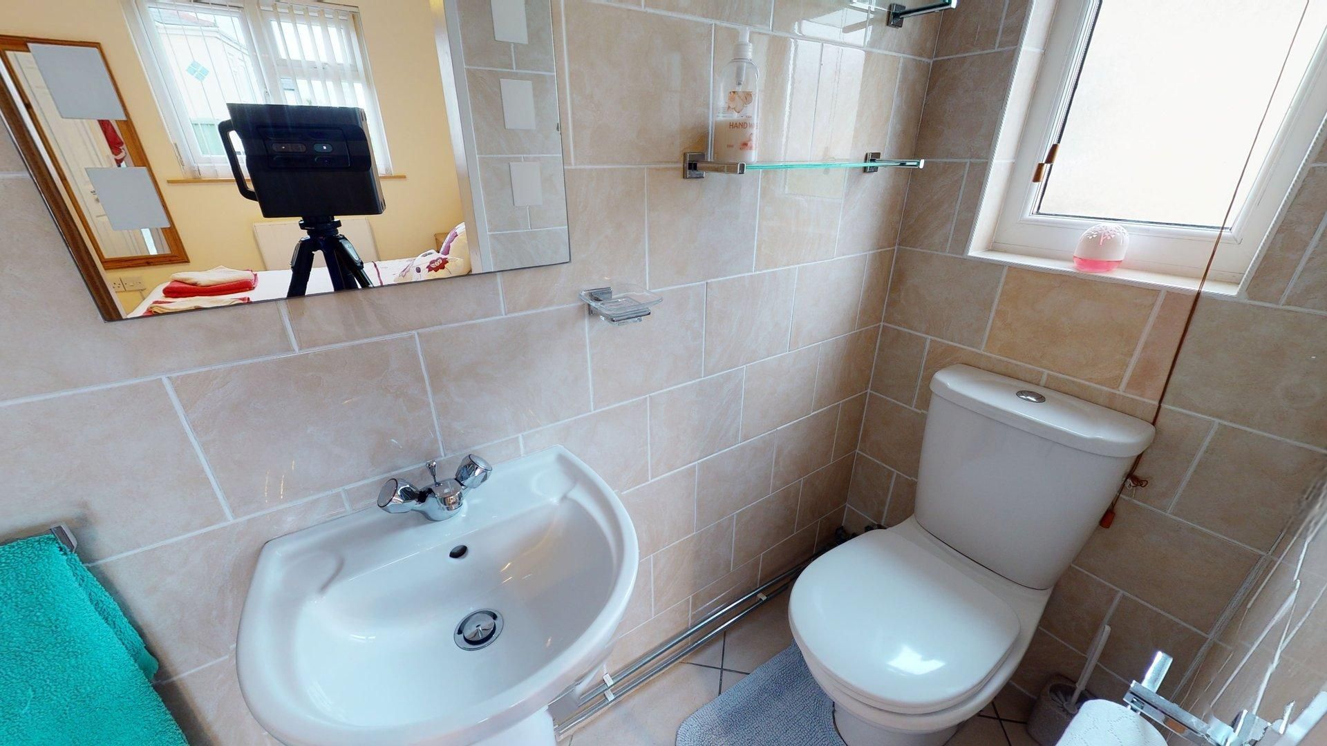 Shower Room - Modern room with large shower cubicle, W.H.B., W.C. Fully tiled with useful storage.
