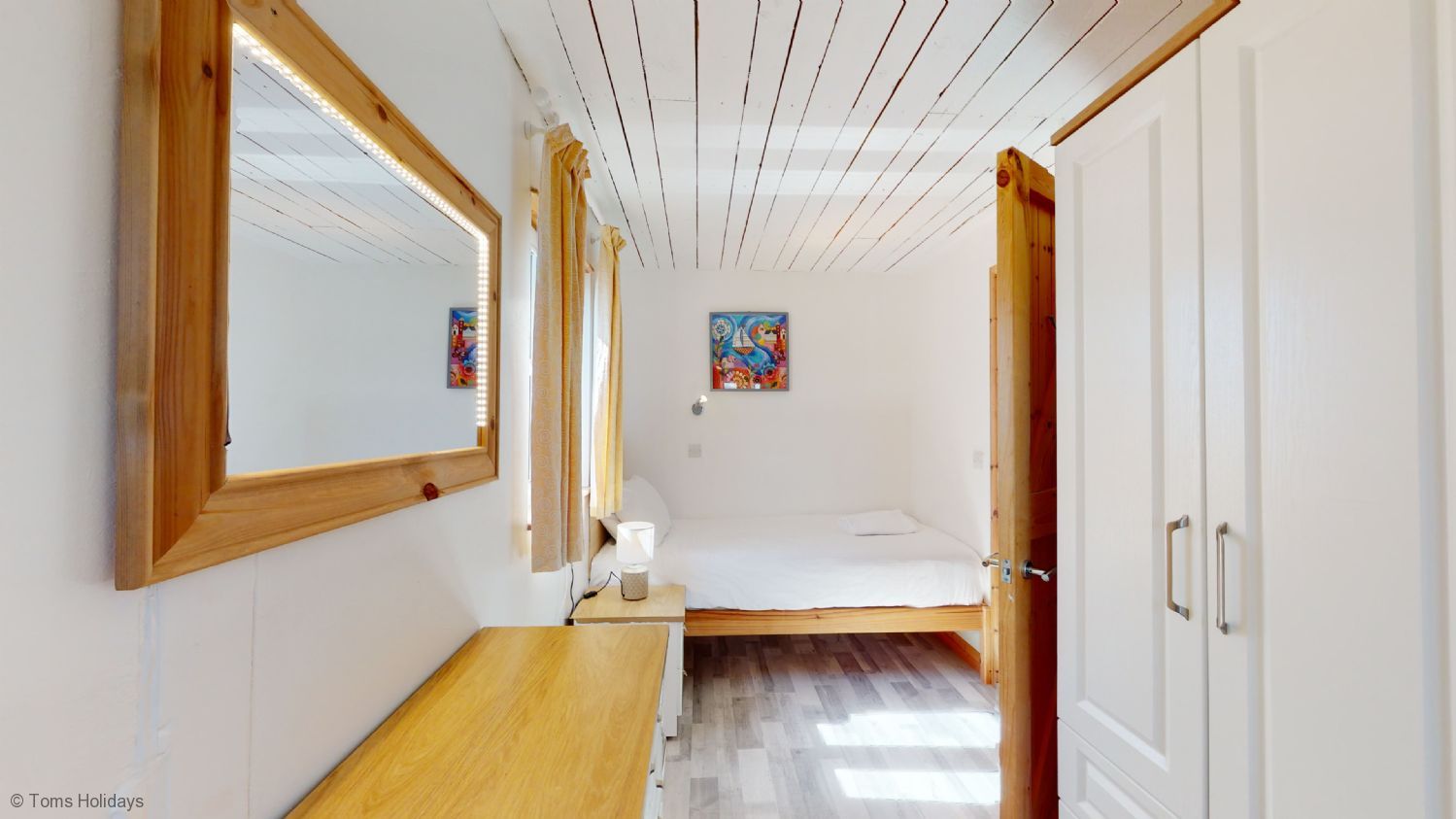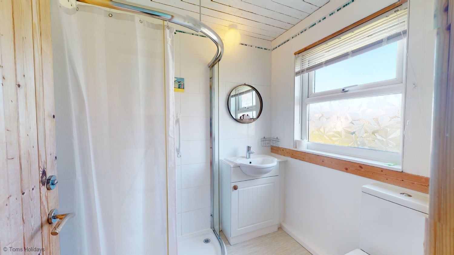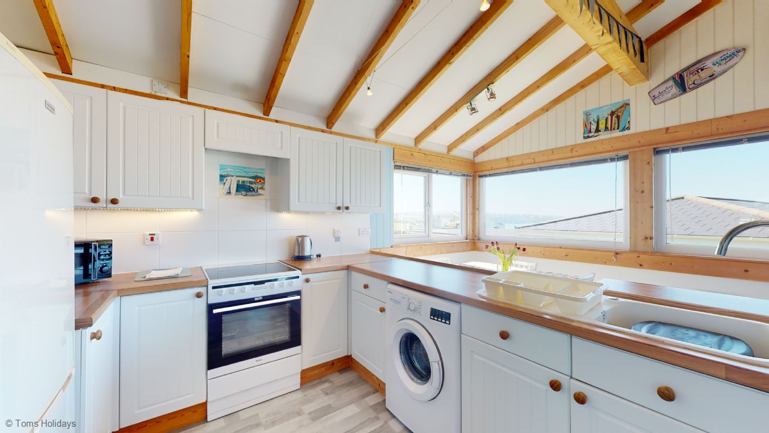 The famous ‘St. Ives Light’ fills the spacious and airy, open plan living space at Holiday Haunt. With a beautiful pitched ceiling, views across the park and towards St. Ives Bay, and traditionally clad in Cornish blue and white, your beach chalet holiday awaits.