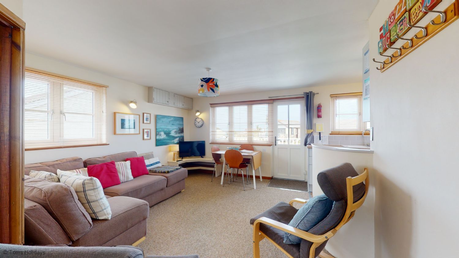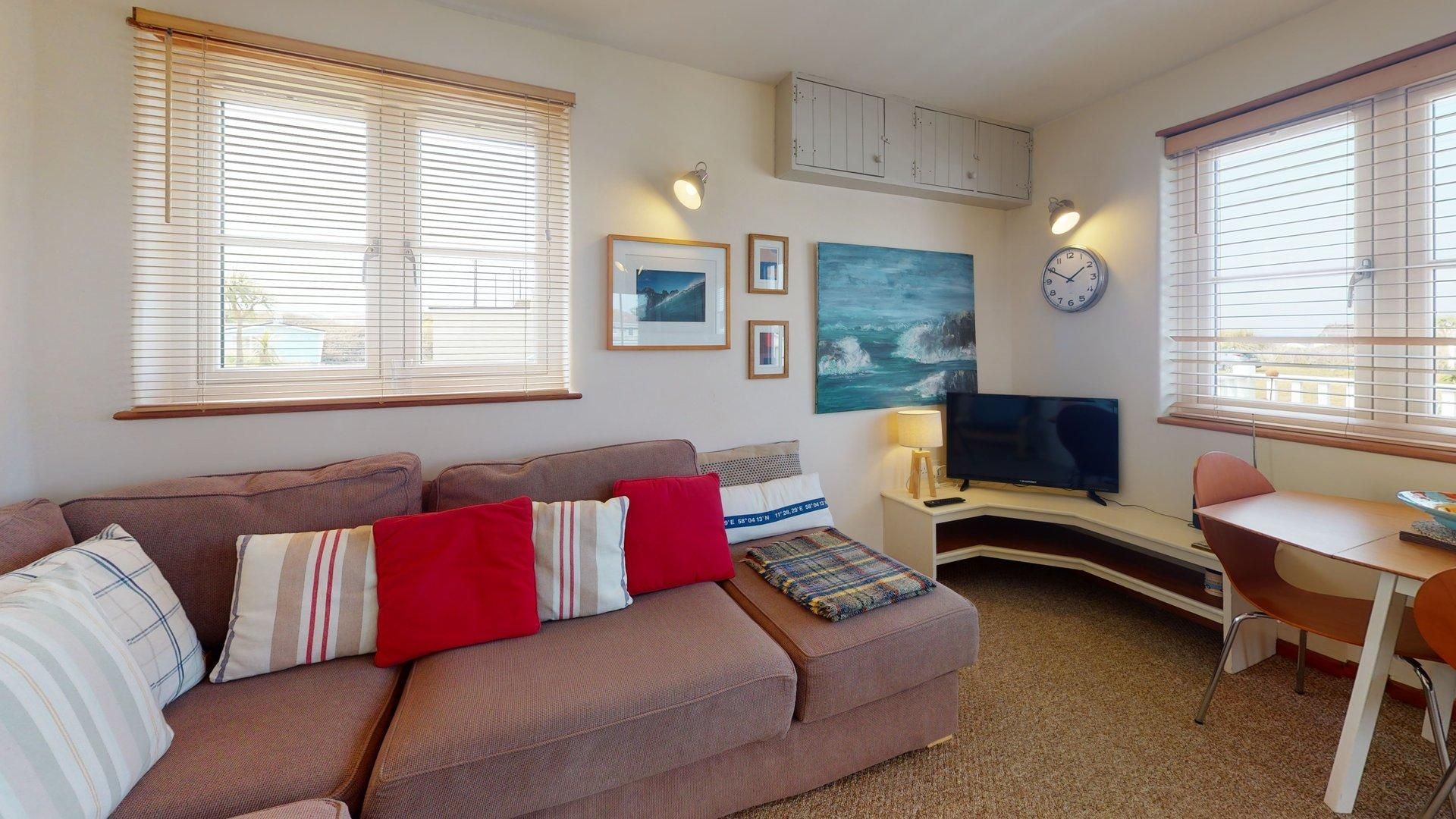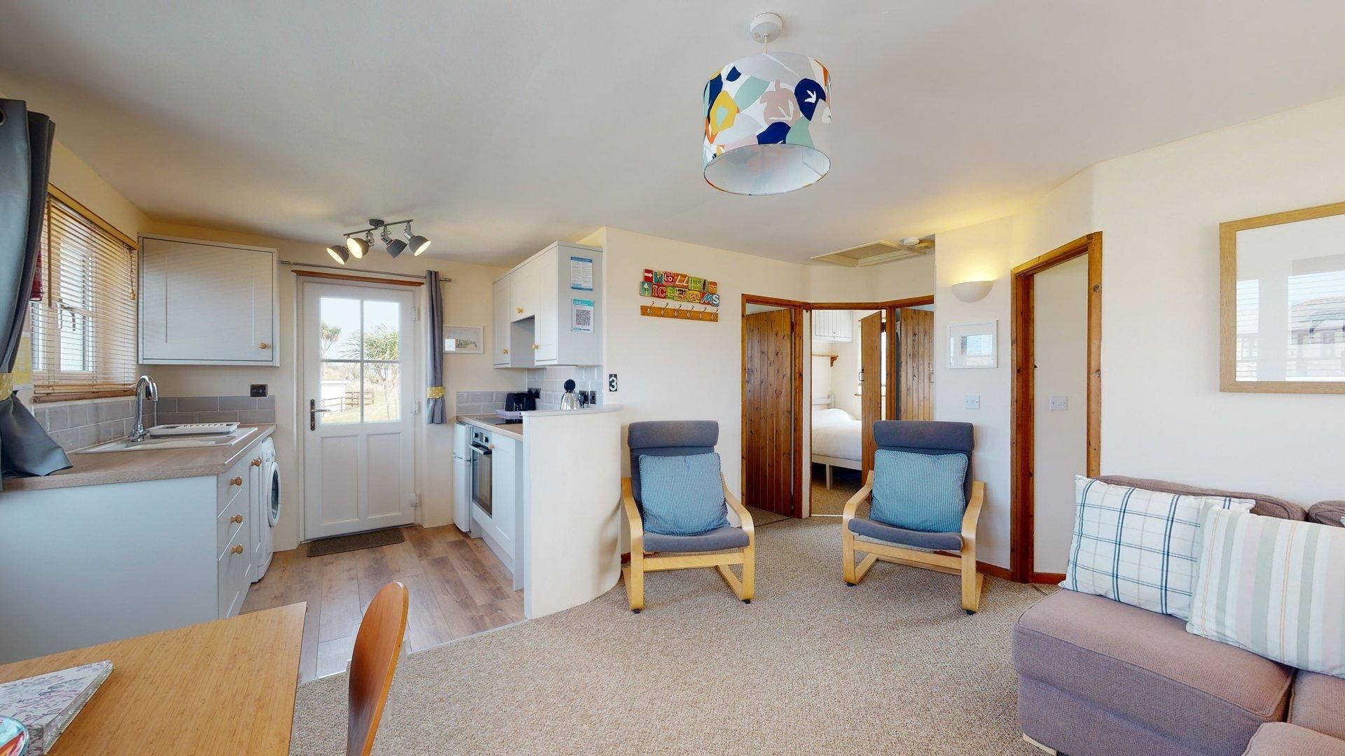 Fresh, modern comforts in a charming beach bungalow, Lanteglos sits toward the back of the Riviere Towans chalet park and sleeps up to six. Inside, an open- plan living space feels bright and airy, with an L-shaped sofa and two comfy armchairs for unwinding after beach days or adventures around West Cornwall. Full, dedicated fibre broadband keeps everyone connected between outings.
