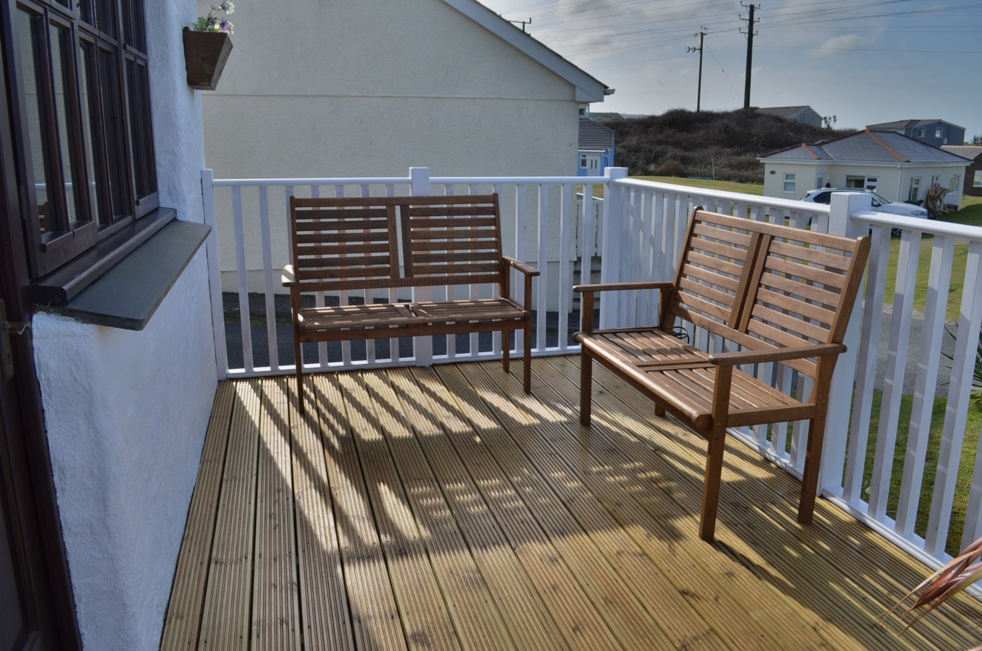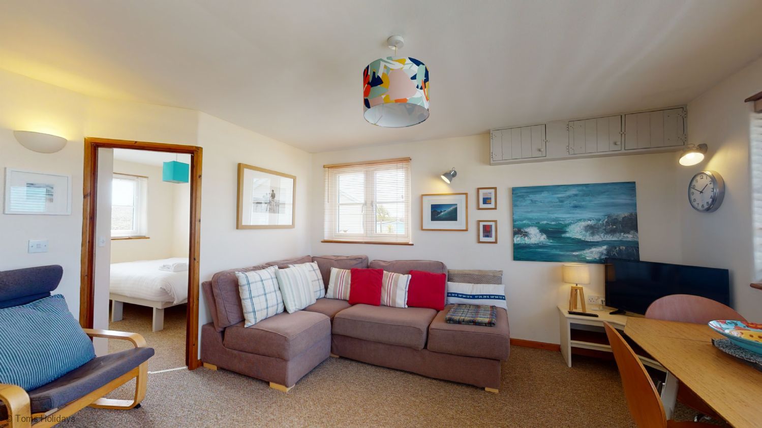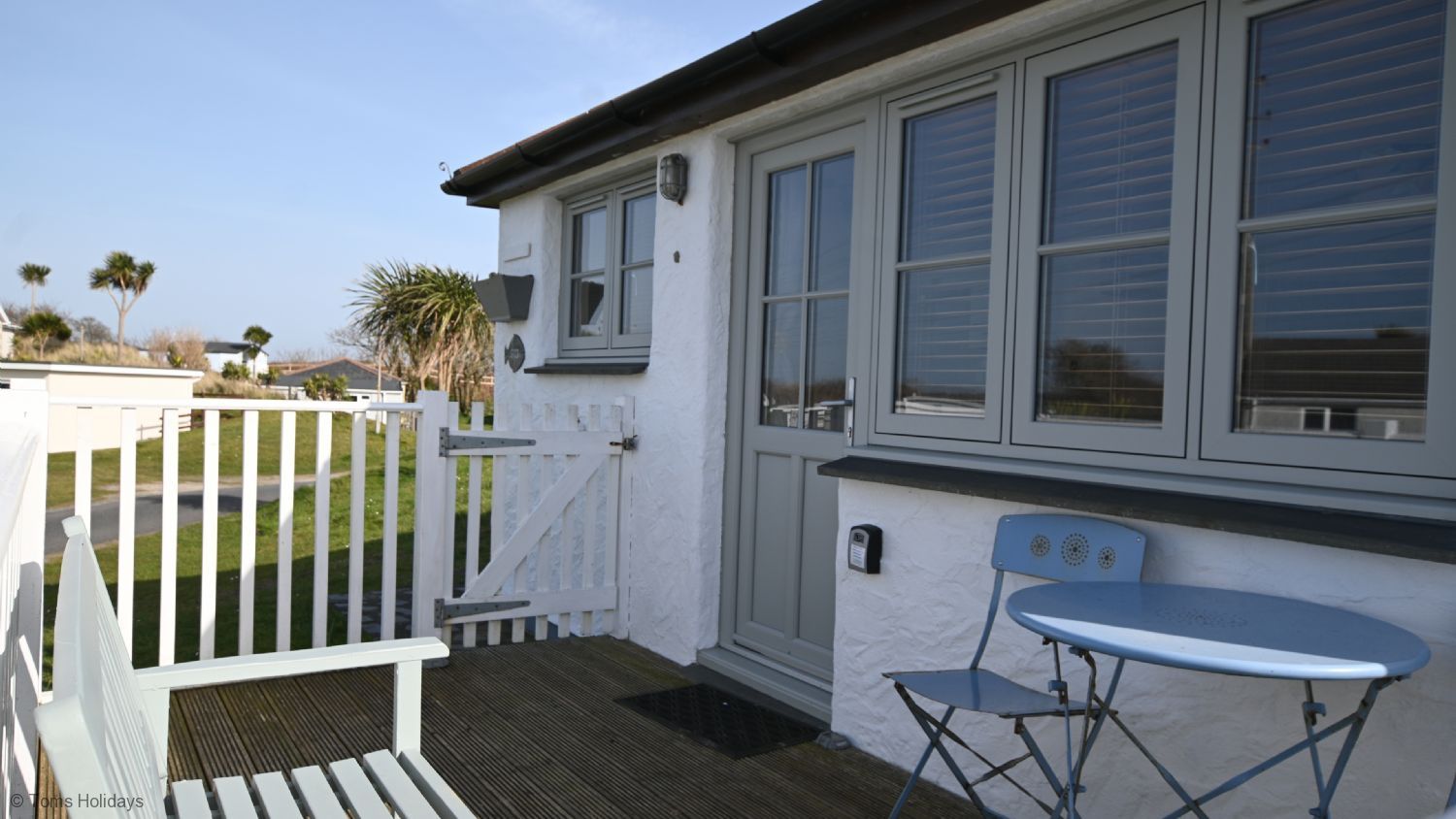 Fresh, modern comforts in a charming beach bungalow, Lanteglos sits toward the back of the Riviere Towans chalet park and sleeps up to six. Inside, an open- plan living space feels bright and airy, with an L-shaped sofa and two comfy armchairs for unwinding after beach days or adventures around West Cornwall. Full, dedicated fibre broadband keeps everyone connected between outings.