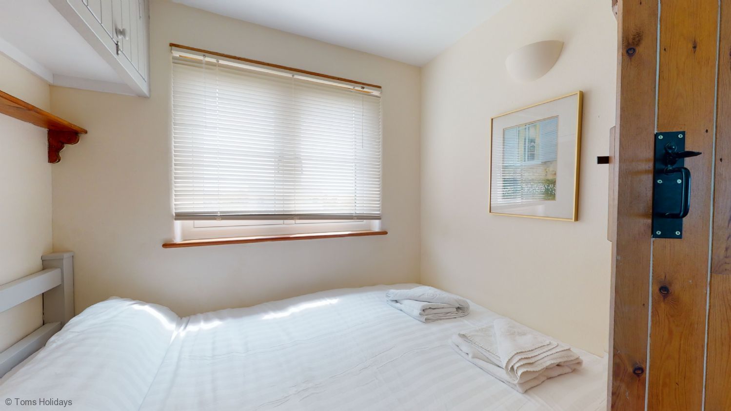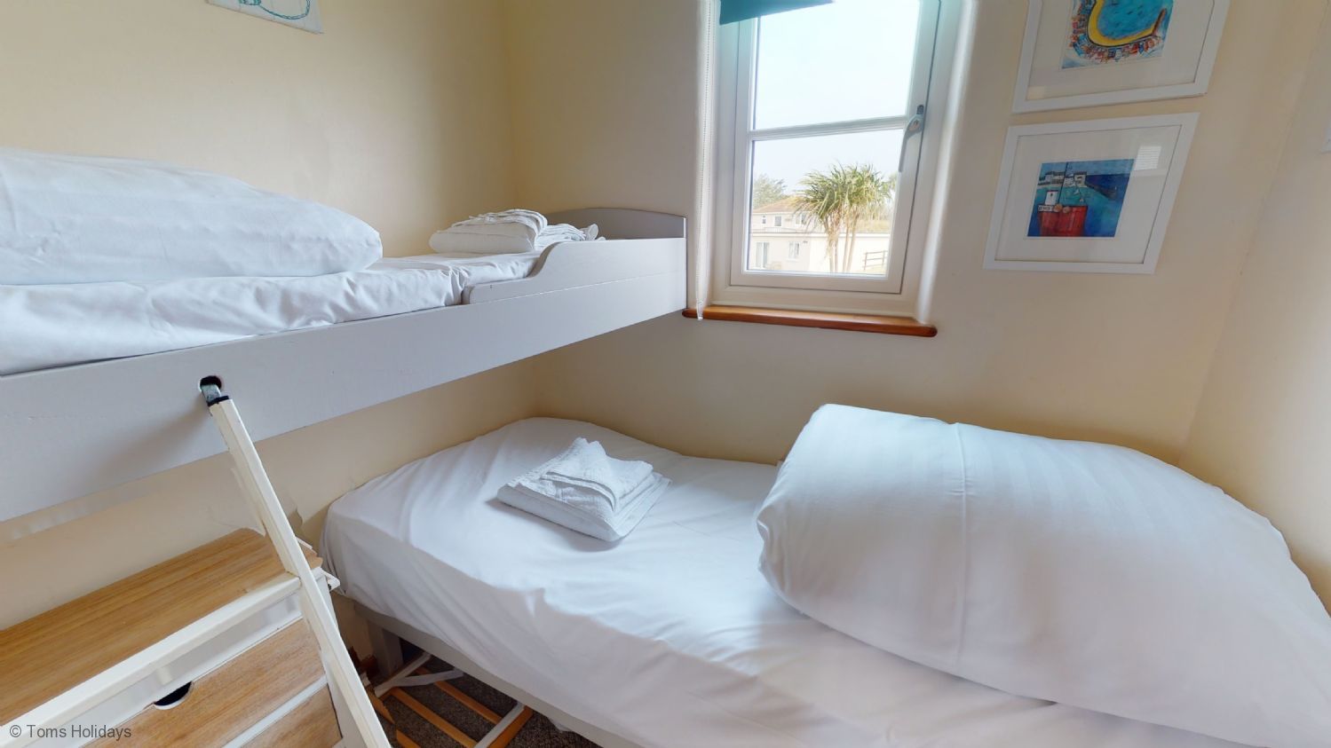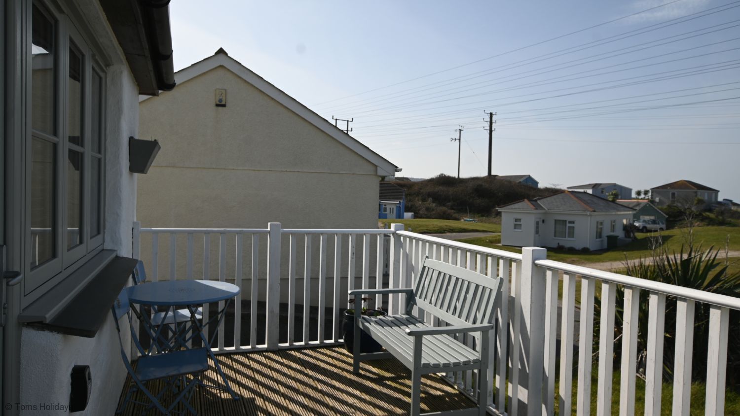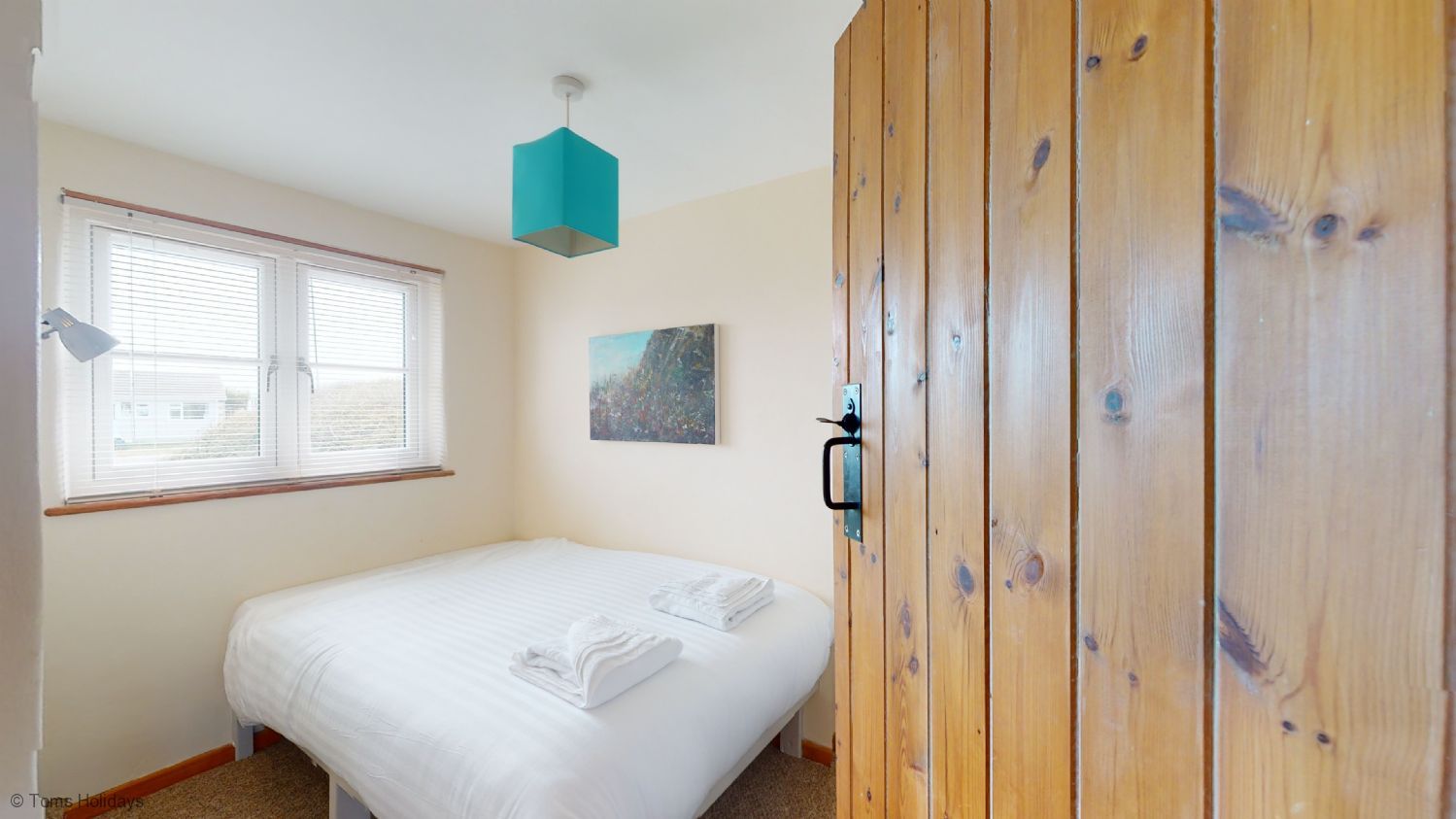 Rooms - Kitchen — Fitted and well equipped: washing machine; fridge with small freezer compartment; electric fan oven and grill; electric hob with overhead extractor fan/light; microwave (stored in a cupboard if preferred), kettle and toaster; full set of crockery, cutlery, glasses, pots, pans and utensils. Dining table seats six comfortably (additional folding chairs available) and folds down when not in use. - Living Room — Corner sofa and two occasional chairs, coffee table and lamp, 32" television, wireless speaker; door to enclosed balcony. - Bedroom 1 — Double bed with comfy mattress, fitted wardrobe, generous storage. - Bedroom 2 — Double bed with comfy mattress, fitted wardrobe, generous storage. - Bedroom 3 — Bunk room with one full-size single bed and one child-size (65cm x 150cm) bunk; bedside cabinet. - Shower Room — Shower cubicle with electric thermostatic shower, electric fan, shaver socket and mirror, WC, basin and heated towel rail. - Additional Info — Large airing cupboard above the hot-water tank; fold-down clothes dryer plus outside washing/drying line; electric immersion hot water (around 15–20 minutes to heat); thermostatic electric convection heaters available for every room (stored in bedroom cupboards) if needed; iron, ironing board, vacuum cleaner and picnic chairs available to use and take to the beach; rotary clothes dryer outside; spare lightbulbs, torch, batteries and appliance instructions stored in cupboards for easy reference.