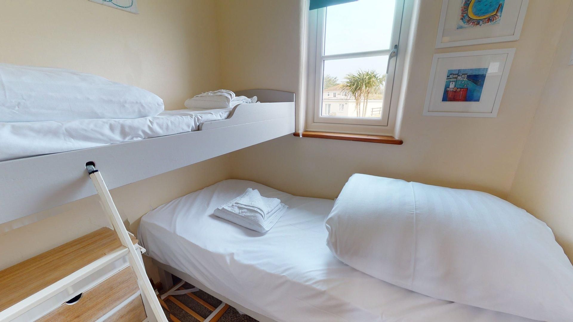 - Bedroom 3 - Bunk room with one full-size single bed and one child-size (65cm x 150cm) bunk; bedside cabinet.