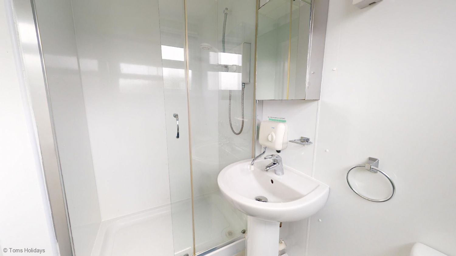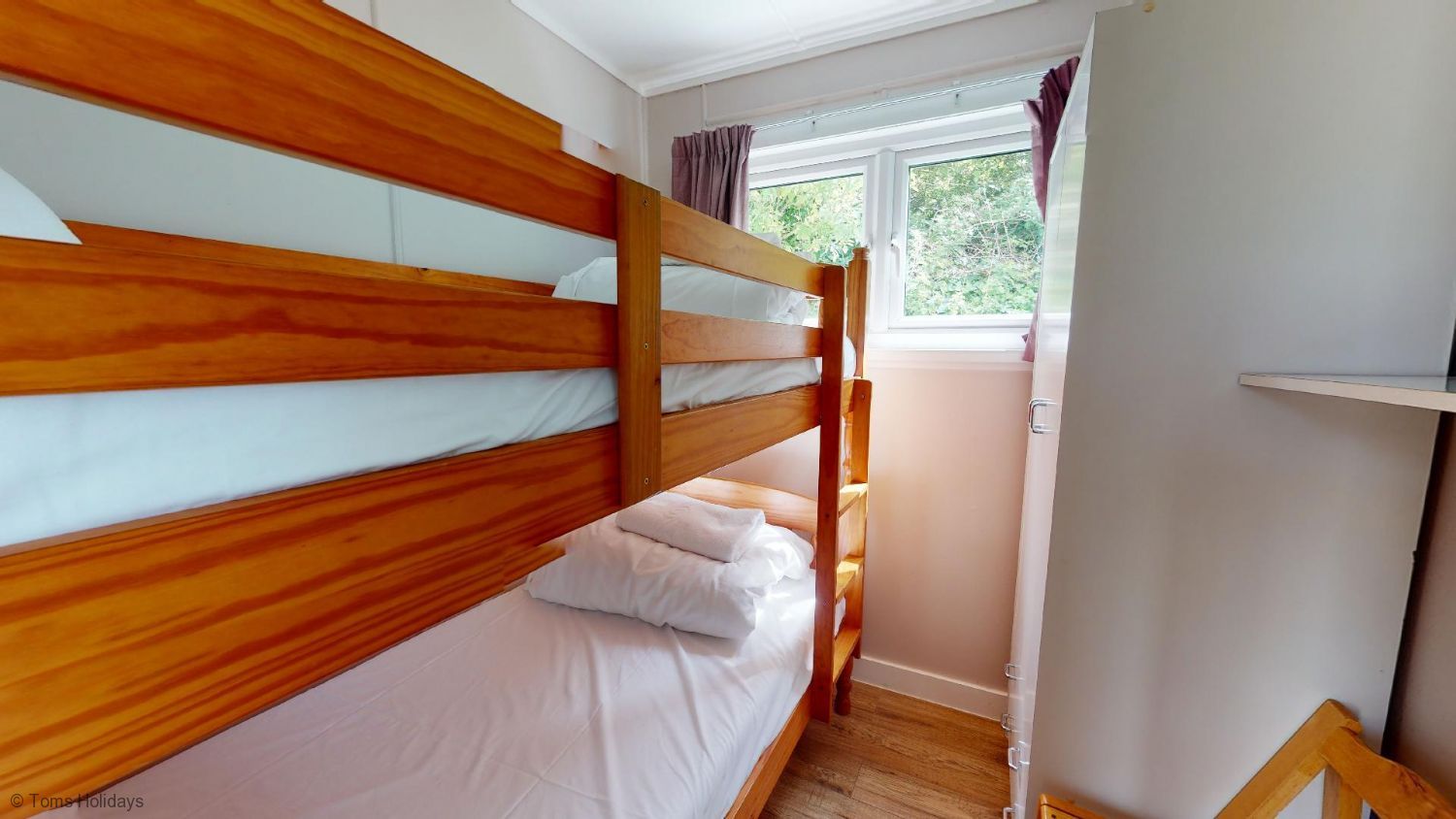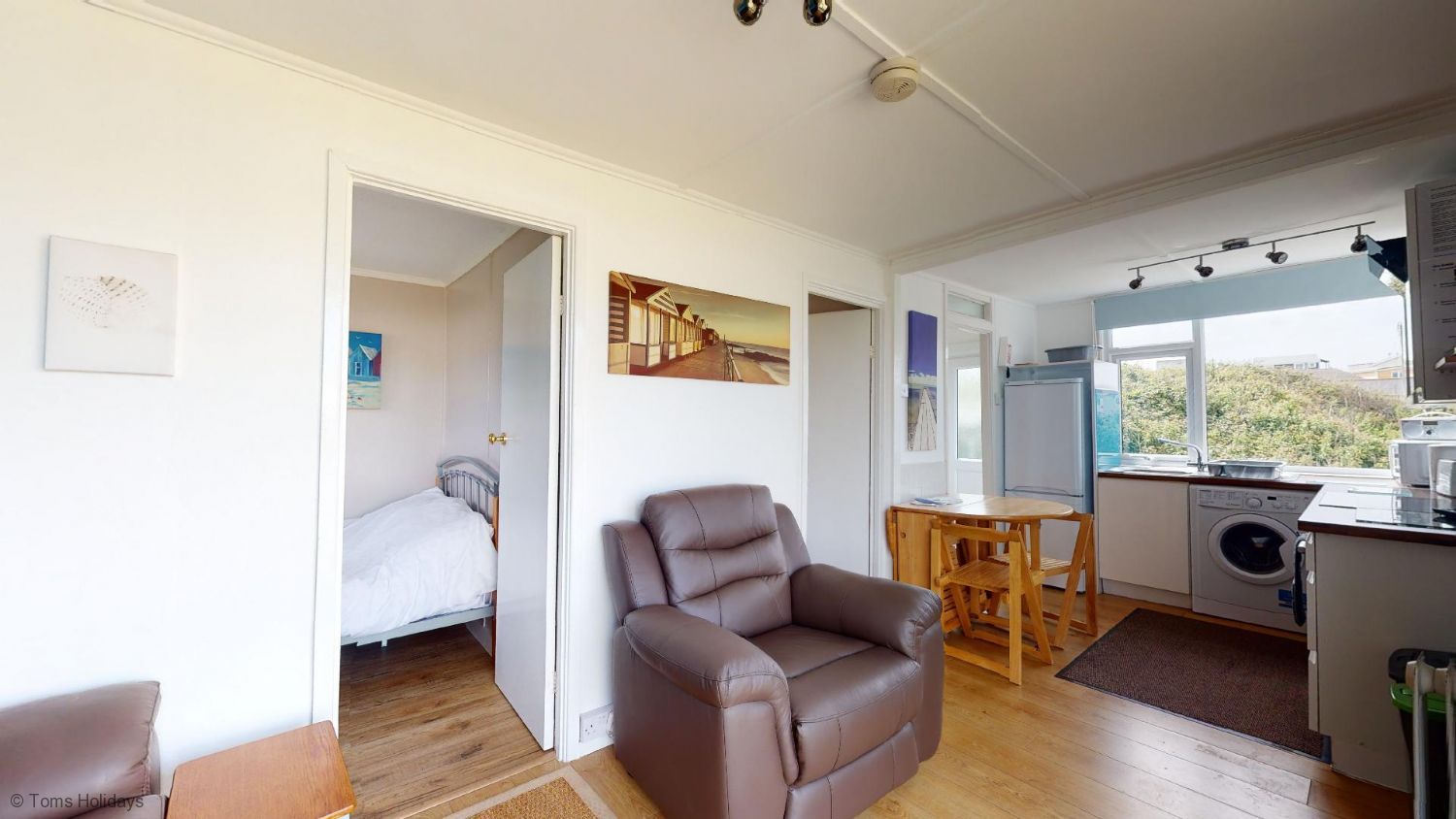 Rooms - Bedroom 1 - One double bed, wardrobe, chest of drawers. - Bedroom 2 - One set of full-size bunk beds, combination wardrobe. - Lounge - Leather sofa and matching armchair, nest of tables, wall-mounted digital flatscreen TV, electric heater. - Kitchen / Diner - Newly fitted kitchen with built-in hob and oven, large fridge-freezer, washing machine, microwave, folding dining table and chairs. - Shower Room - Fitted shower cubicle, washbasin, WC.