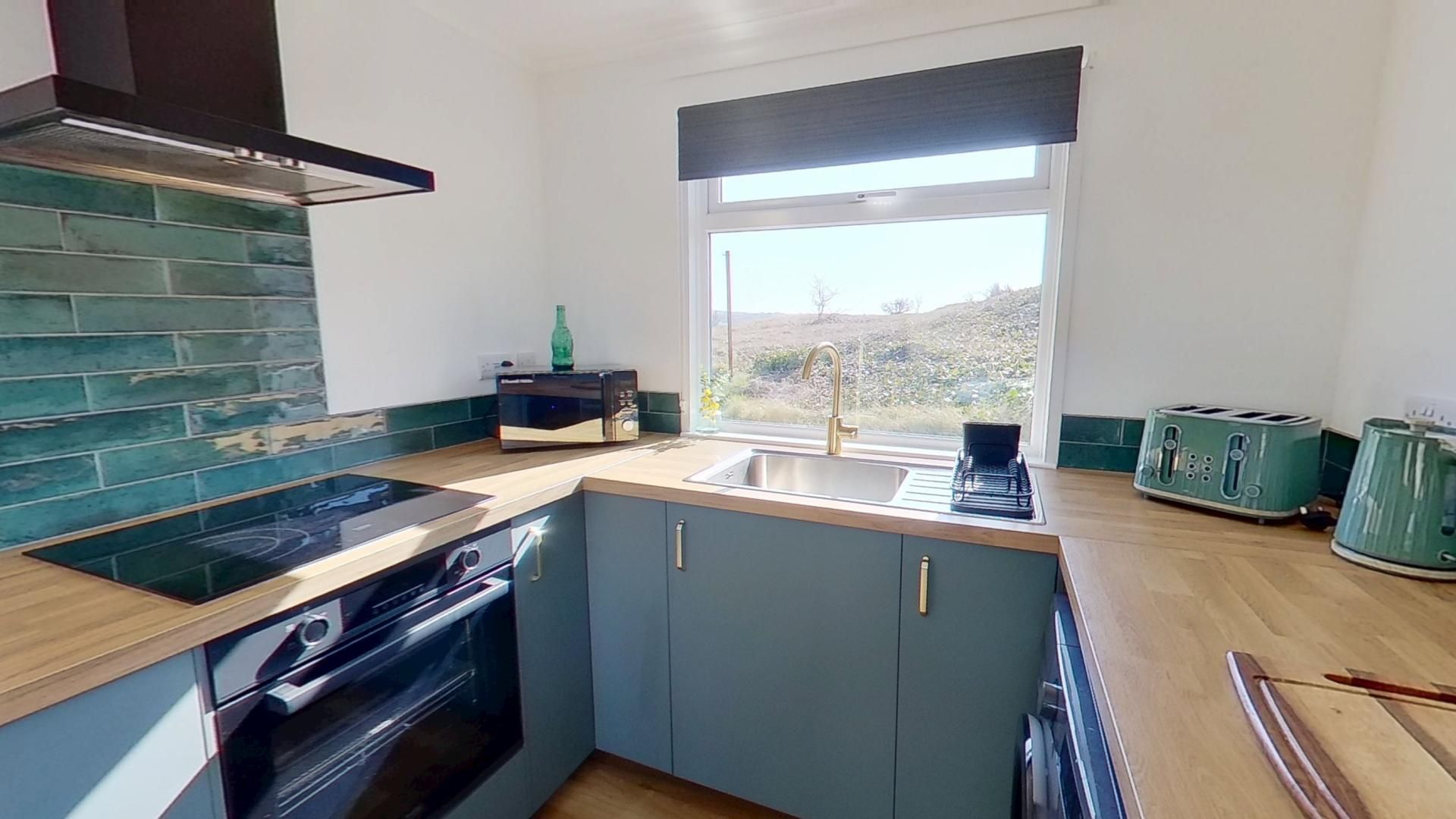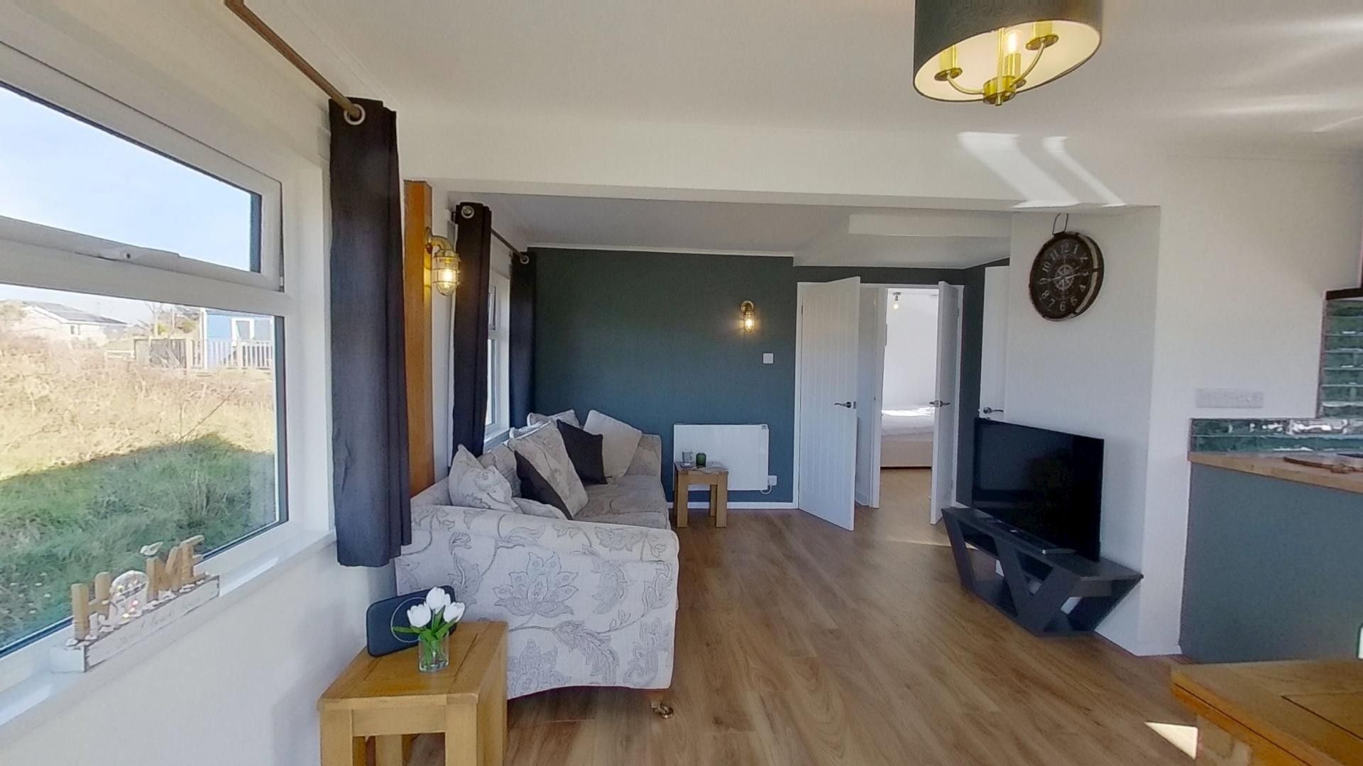 Living / Dining / Kitchen Area - Open-plan space with large four-seater sofa, Smart TV and French doors to the Towans. Kitchen with electric hob and oven, microwave, fridge with ice compartment, wine cooler and washing machine. Dining table seating for up to four guests.