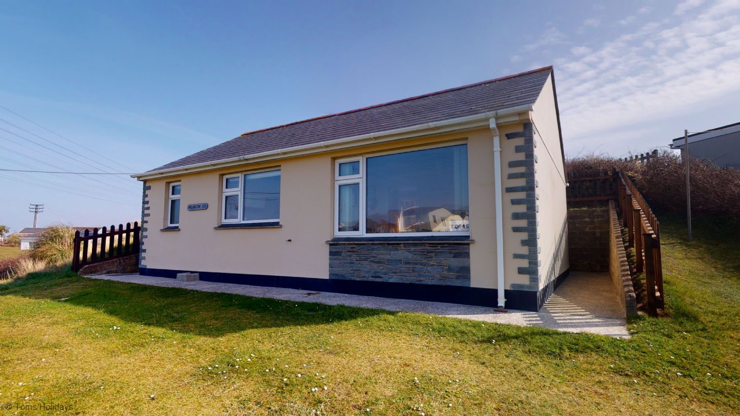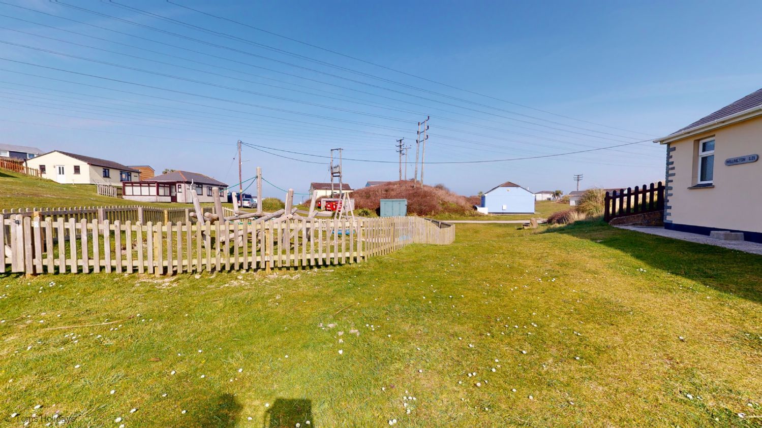 - Lounge — Large picture window with views over green dunes and the children’s play area; small TV; comfy seating area.