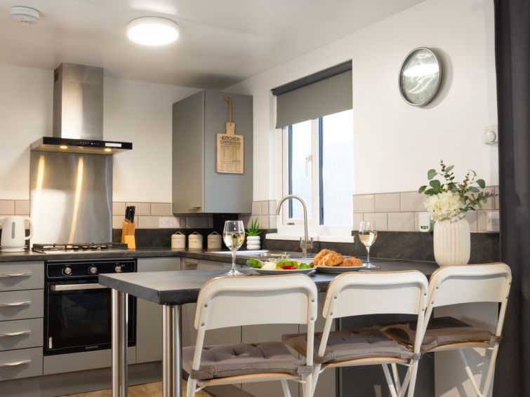 3-room chalet. Spacious and bright, modern and luxurious furnishings: open living room with 1 double sofabed and TV (flat screen). Exit to the garden. 1 double bedroom with 1 double bed. 1 room with 1 x 2 bunk beds (90 cm, length 190 cm). Open kitchen (4 hot plates, oven, toaster, kettle, microwave).