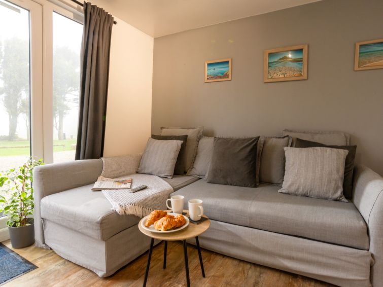 3-room chalet. Spacious and bright, modern and luxurious furnishings: open living room with 1 double sofabed and TV (flat screen). Exit to the garden. 1 double bedroom with 1 double bed. 1 room with 1 x 2 bunk beds (90 cm, length 190 cm). Open kitchen (4 hot plates, oven, toaster, kettle, microwave).