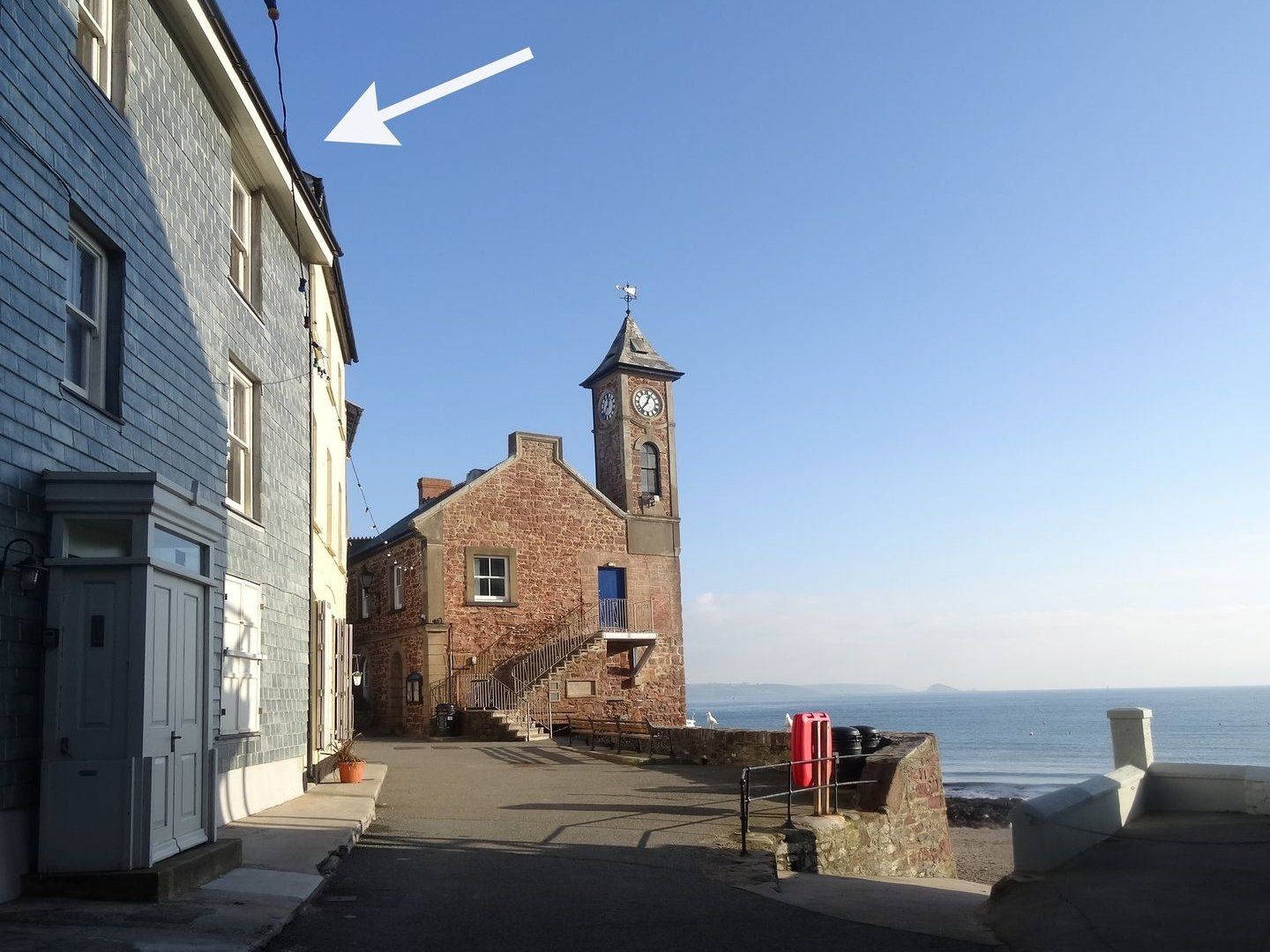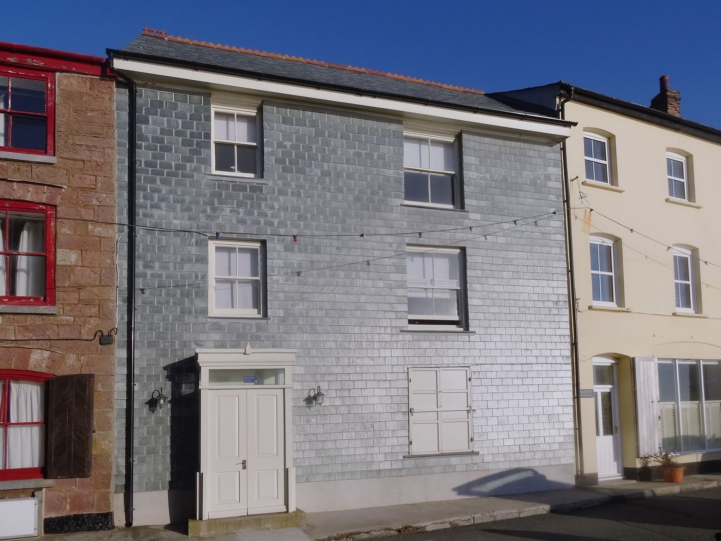 Holiday home In Kingsand, opposite the beach, a handsome, Grade II listed, Georgian house on three levels with splendid out-to-sea views. A lovely, spacious home, with its quirky origins cleverly dovetailed with 21st cent. comfort. It sleeps 9 in four bedrooms, three double, one en suite and a twin. Living room with wood-burning stove, and sea view; generous kitchen with dining table and chairs glazed doors to courtyard and, at the far end, a comfy sofa, and door to utility shed. Under-stairs WC. Two family bathrooms. A secure courtyard on two levels with steps up to a patio with garden furniture, back gate to a private footway. A gorgeous house beside the beach and within strolling distance of the village pubs and shops. Up to two well-behaved dogs welcome.