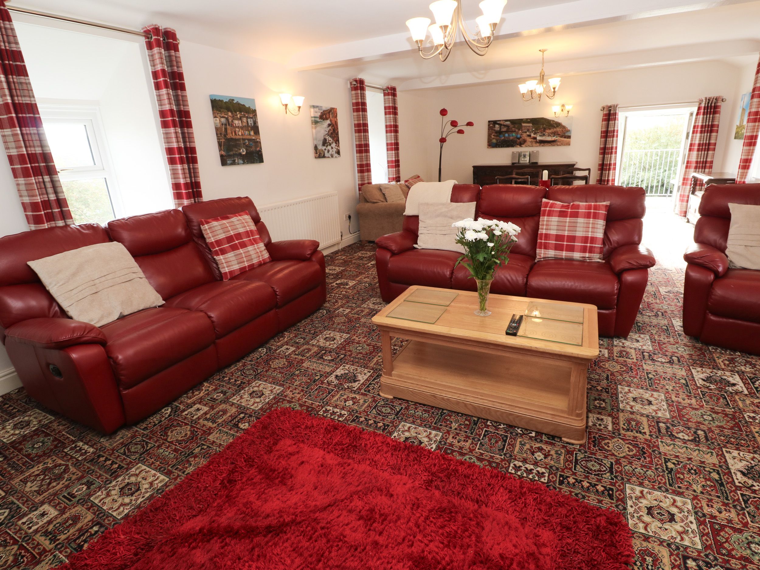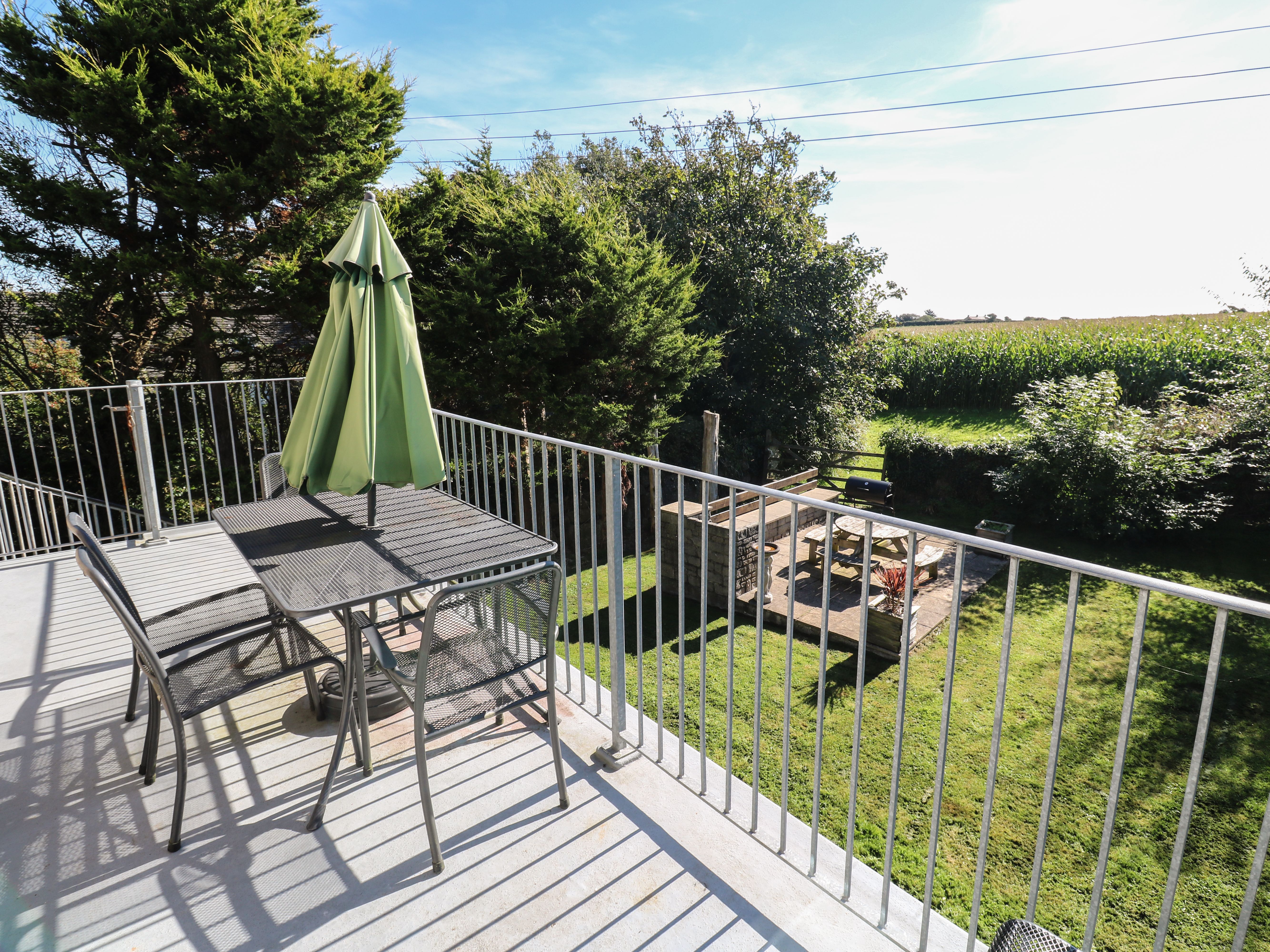 Holiday home Tremornah, a reverse-level cottage, consists of a kitchen with AGA cooker, electric oven, gas hob, microwave, fridge/freezer, washing machine, dishwasher, TV, and breakfast table, a living/dining room with Smart TV and open fire, and balcony with furniture, and a cloakroom with basin and WC. The bedrooms consist of a ground-floor double with en-suite walk-in shower, ground-floor twin, and ground-floor family room. There is a bathroom with freestanding bath, walk-in shower, basin, heated towel rail, and WC. WiFi, fuel, power, bed linen, and towels are included in the rent. Outside, there is a rear garden with patio, lawn, furniture, barbecue, and hot tub, and off-road parking for three cars. Pet-friendly. Sorry, no smoking. Shop 2.7 miles, pub 1.6 miles, beach 1.9 miles. All of this and so much more with a stay at the welcoming Tremornah. Note: Steps up to the property on the first floor. Note: Raised patio in the garden.
