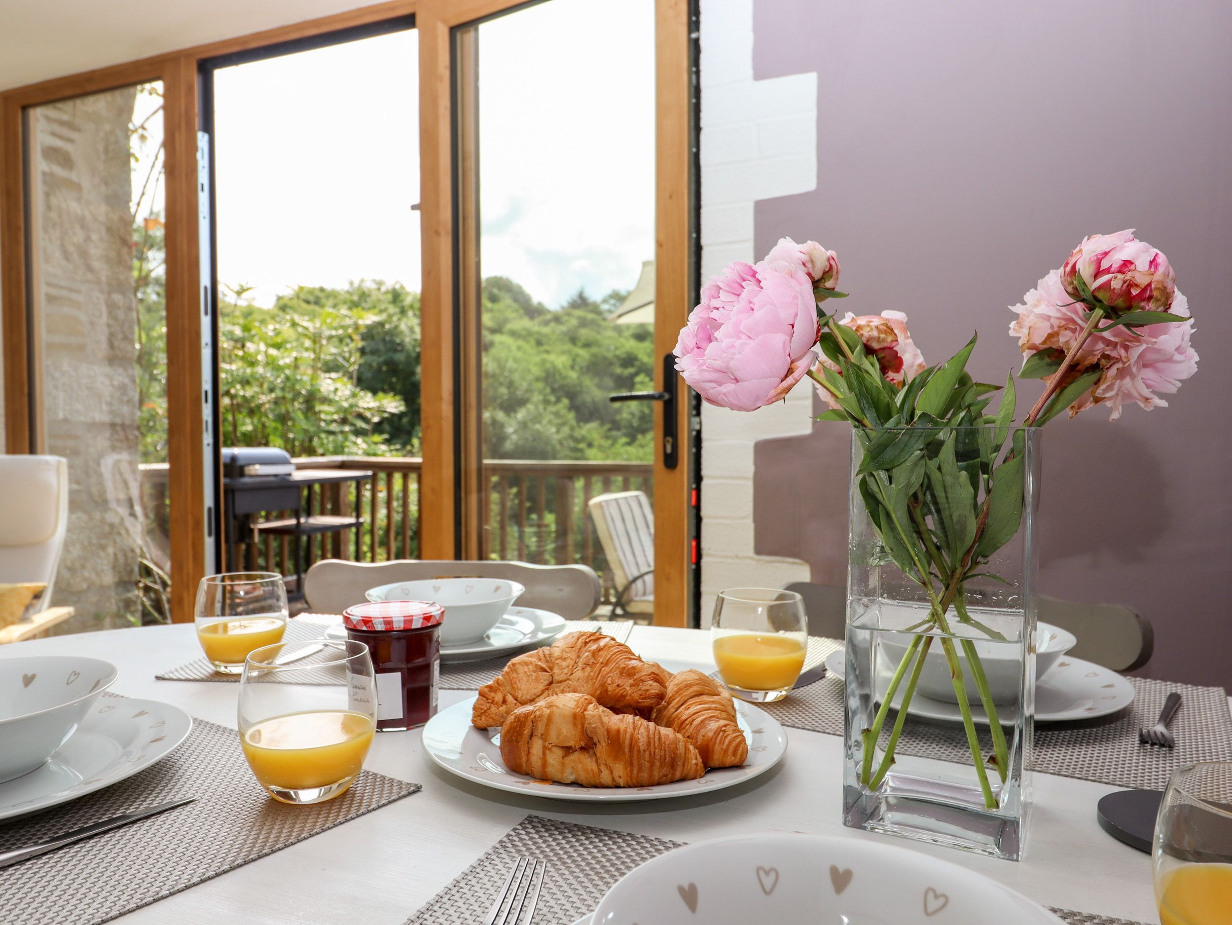 Holiday home The living areas in this home consist of an open-plan living space with kitchen, dining area and sitting area, and a balcony. Appliances include an electric oven and gas hob, microwave, fridge/freezer, washing machine, dishwasher, and a Smart TV. The bedrooms consist of a ground floor king-size and a first floor twin (accessed via an open-tread carpeted staircase), serviced by a shower room. Outside, there is an enclosed lawned garden (with pond, please take care), along with private parking for two cars. Within 1.3 miles, you will find a shop, and within 0.8 miles, a pub. Please note, this is a pet-free, non-smoking property. Wi-Fi, fuel, power, bed linen, and towels are all included in the rent. Highchair, travel cot and stairgate available on request. Enjoy an unforgettable stay in Cornwall at The Cider House. Note: Owner lives next door to the property. Note: Access is via external shallow steps, which may be unsuitable for those with mobility issues.