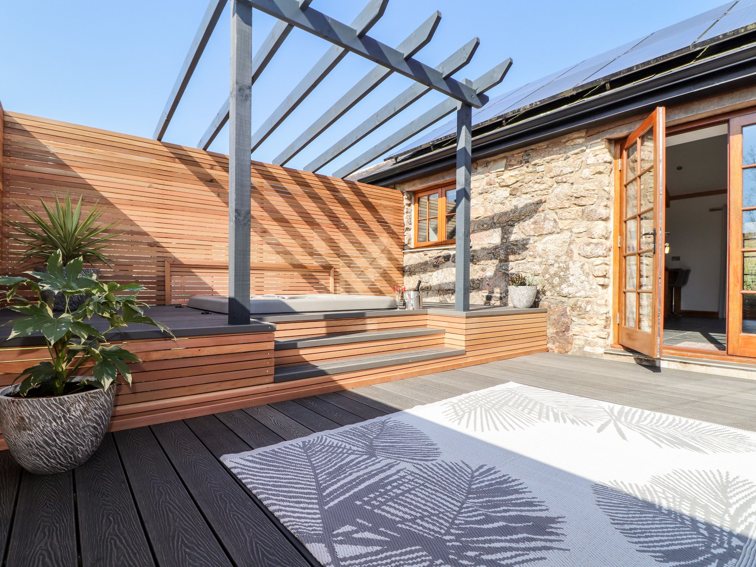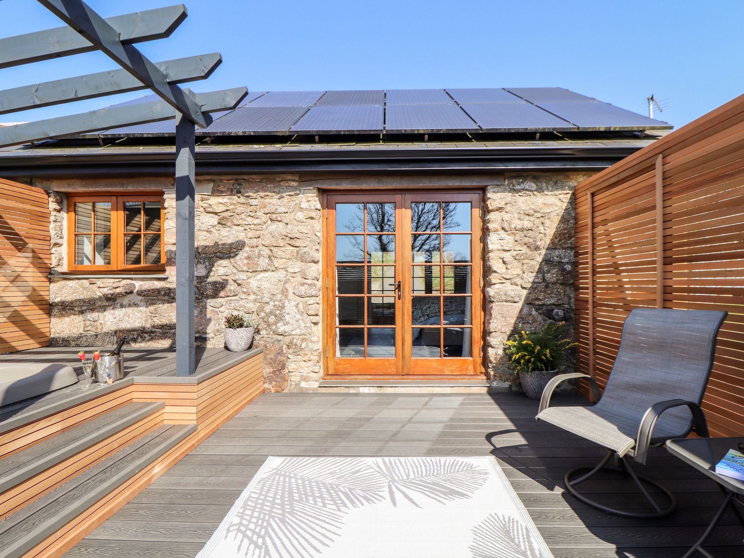 Holiday home The living areas in the semi-detache, single-storey barn conversion consist of a studio-style layout with a king-size bed, kitchen with an electric oven and hob, fridge with icebox, coffee maker, a dining area with seating for two people, and a sitting area with a Smart TV and a selection of games. There is also a shower room. Outside, there is rear enclosed decking with furniture and a hot tub. Within 1.5 miles, you'll find a shop, and within 1.6, a pub. Please be aware that this property does not accept pets or smoking. WiFi, fuel, power, bed linen, towels, a welcome pack and coffee pods are all included in the cost. Choose Rosewarrick Cottage for a romantic getaway packed with rest and relaxation. Note: Babes-in-arms are welcome at this property. Note: There are steps up in the outdoor space, please take care.