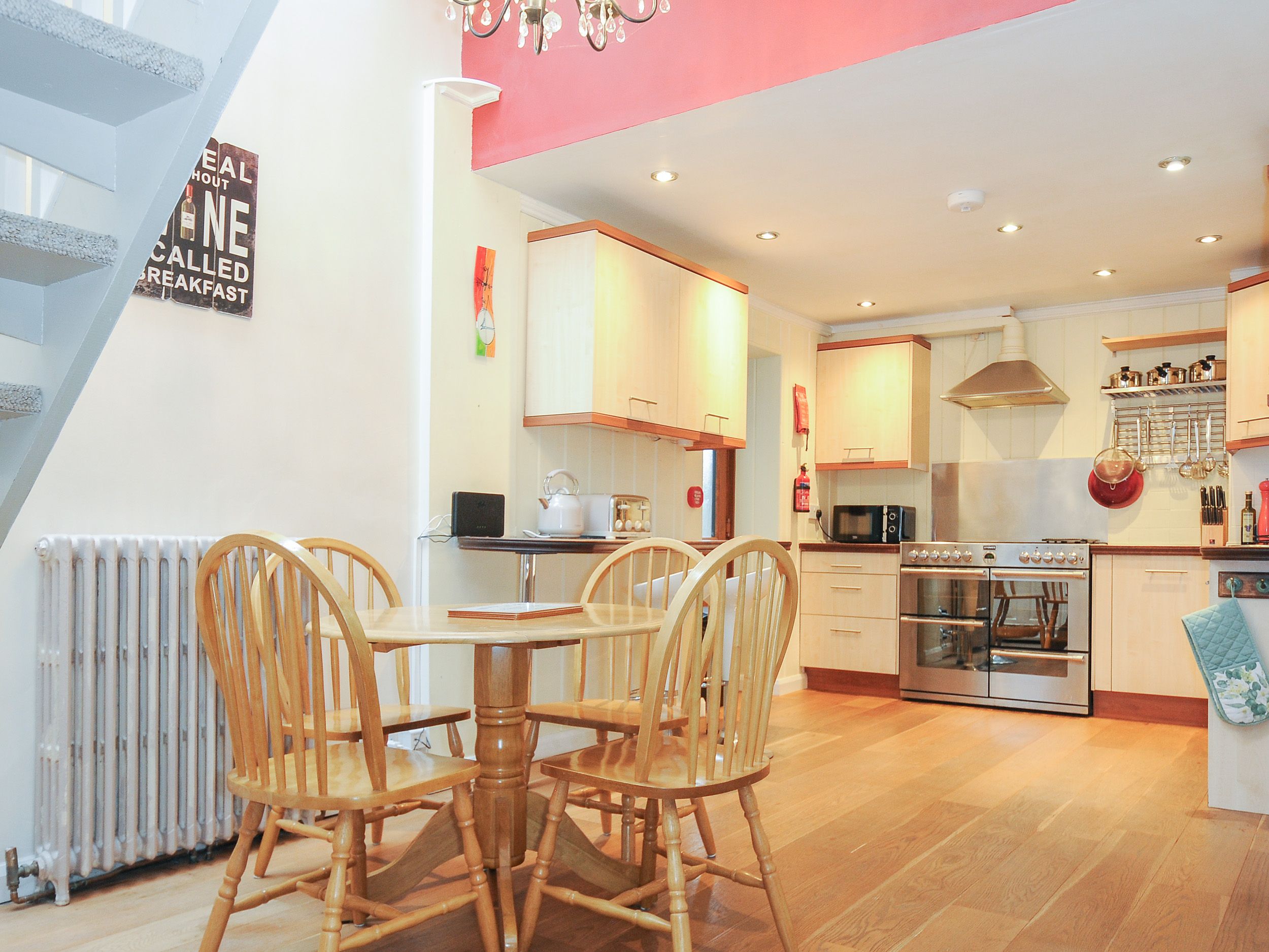 Central heating. Electric oven, gas hob, microwave, fridge, Ironing Board and Iron, freezer, washing machine, dishwasher. TV, WiFi. Fuel and power inc. in rent. Bed linen and towels inc. in rent. Roadside parking. Enclosed rear patio with furniture. Front door security camara. Sorry, no pets and no smoking. Shop and pub 0.1 miles, River Kensey 0.2 miles. Note: Steps to the exterior.