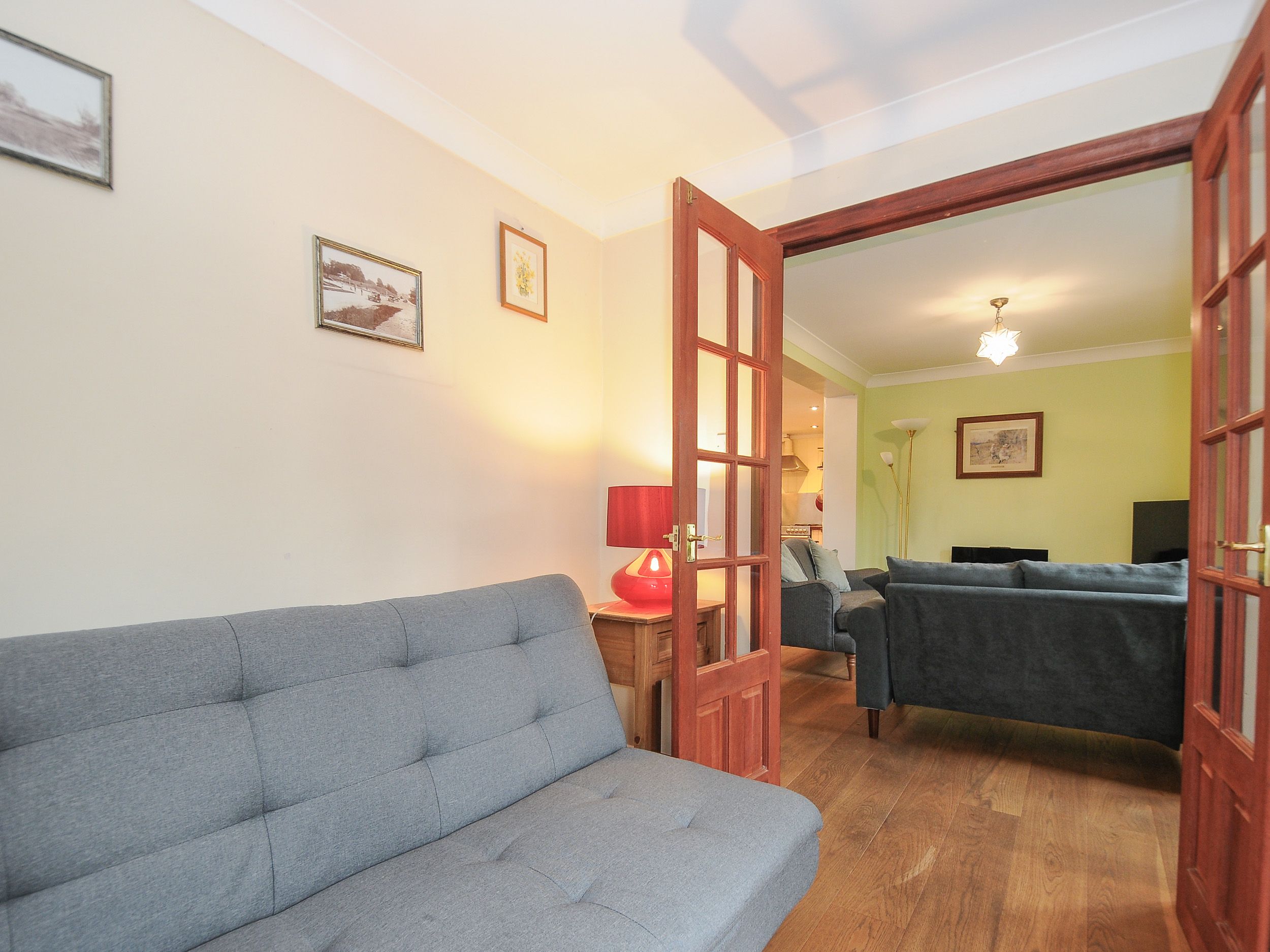 Two bedrooms: 1 x double, 1 x twin with basin. Bathroom with bath, shower over, basin, and WC. Ground-floor shower room with walk-in shower, basin, and WC. Open-plan living space with kitchen, dining area and sitting area with electric fire. Utility. Snug