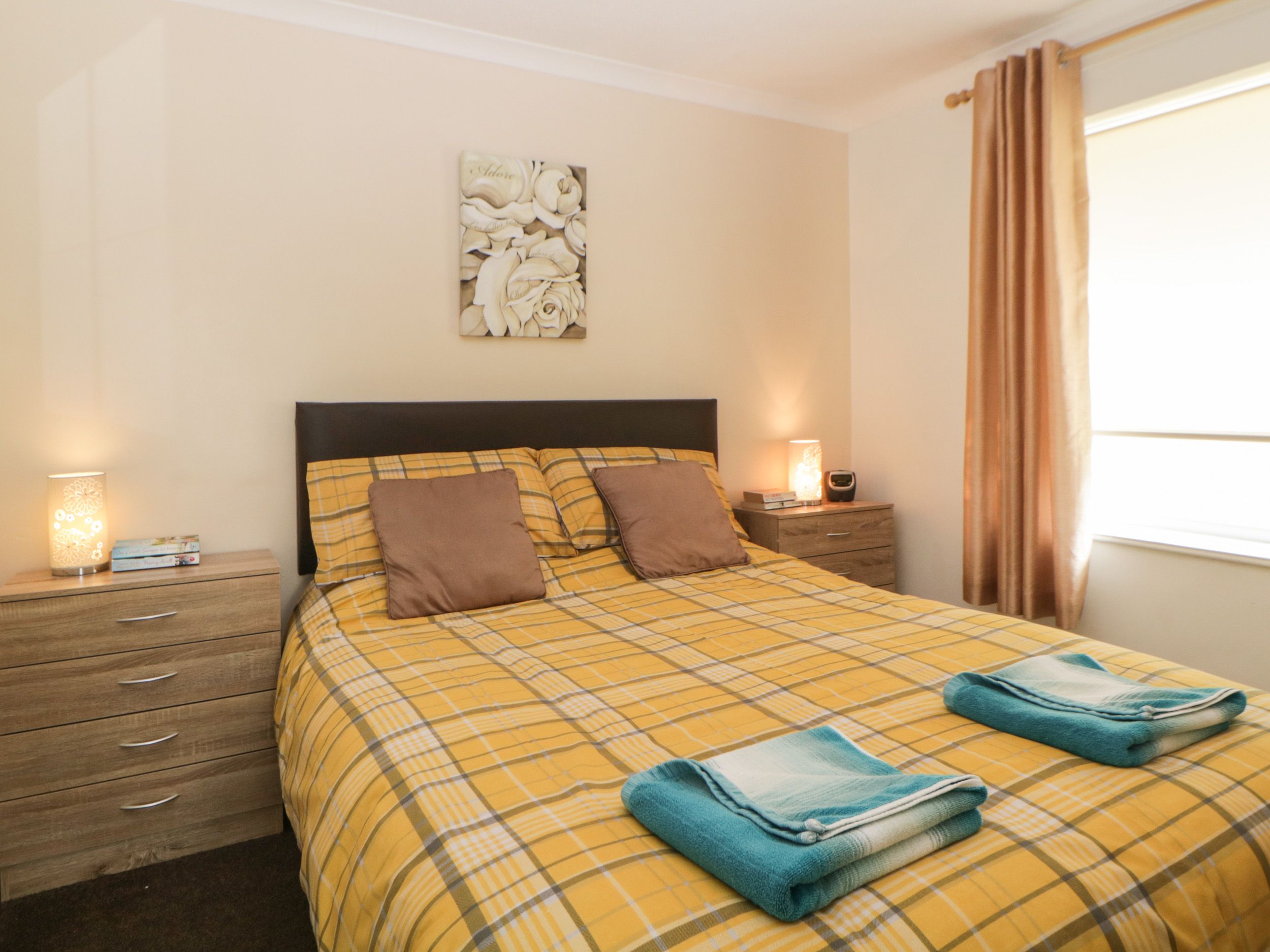 All ground floor. Two bedrooms: 1 x double, 1 x twin. Newly renovated bathroom with shower cubicle, seat in shower and grab rail, basin and WC. Open-plan living area with kitchen, dining area and sitting area.