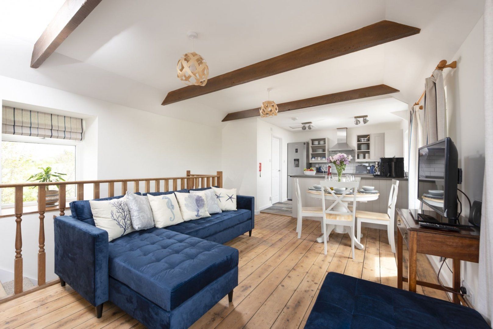 Arrive at this Cornish stone home and find yourself immediately drawn out onto the balcony – overlook the grassy fields straight to the sparkling ocean. With the patio set and barbecue, you’ll probably spend a lot of your holiday out here – it’s hard to pull yourself away from that view. Inside though is nearly as pleasing, white-washed walls and wooden beams complementing a bright space with farmhouse furniture. Prepare breakfast in the decked-out kitchen to enjoy out on the patio before exploring the surrounding town of Marazion, a historic coastal town with an artisan feel and a causeway to the gorgeous St Michael’s Mount. Take a tranquil evening walk along Praa Sands Beach or watch a show at the stunning Minnack Theatre – an open-air theatre jutting out onto the Atlantic sea.