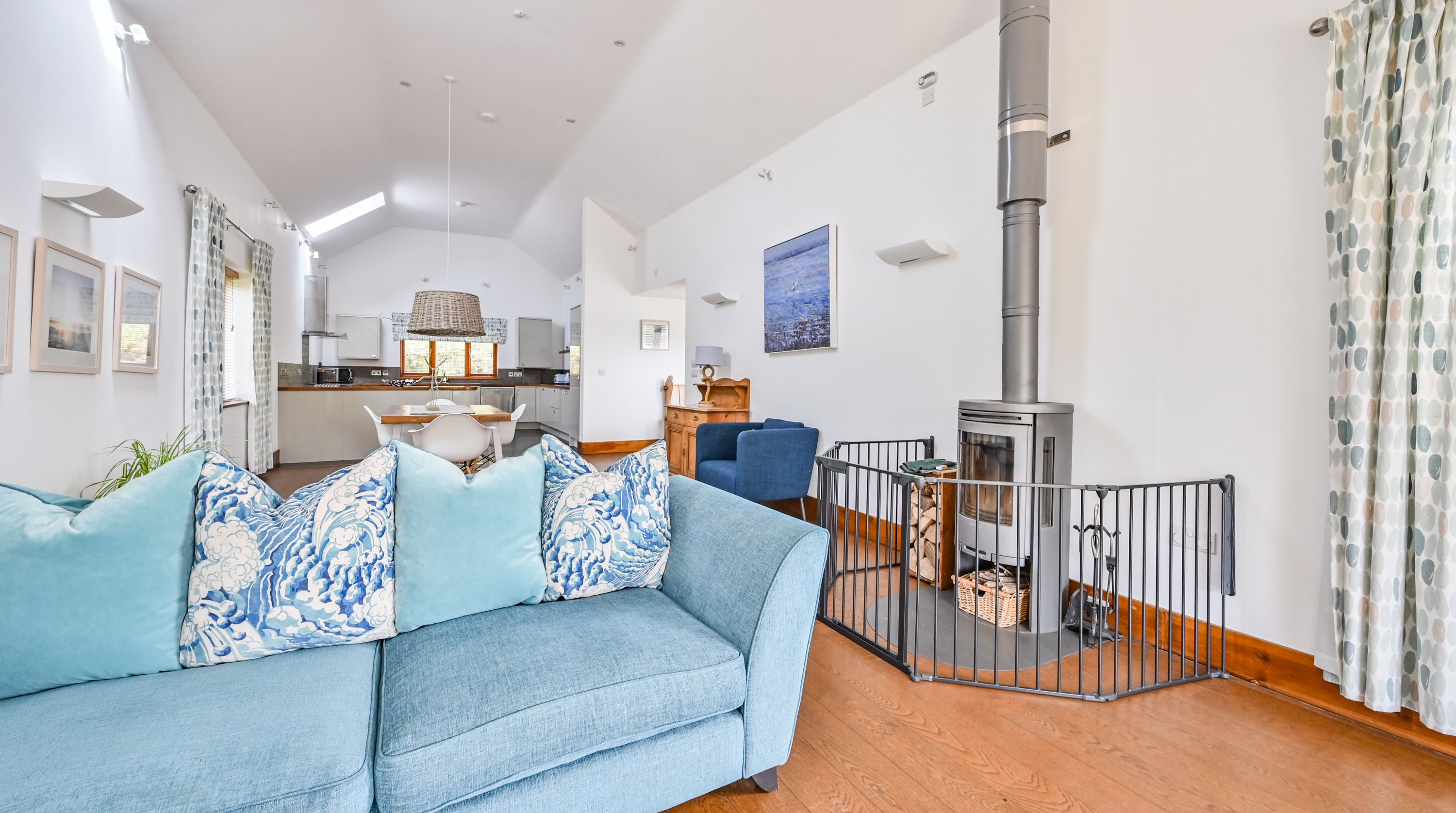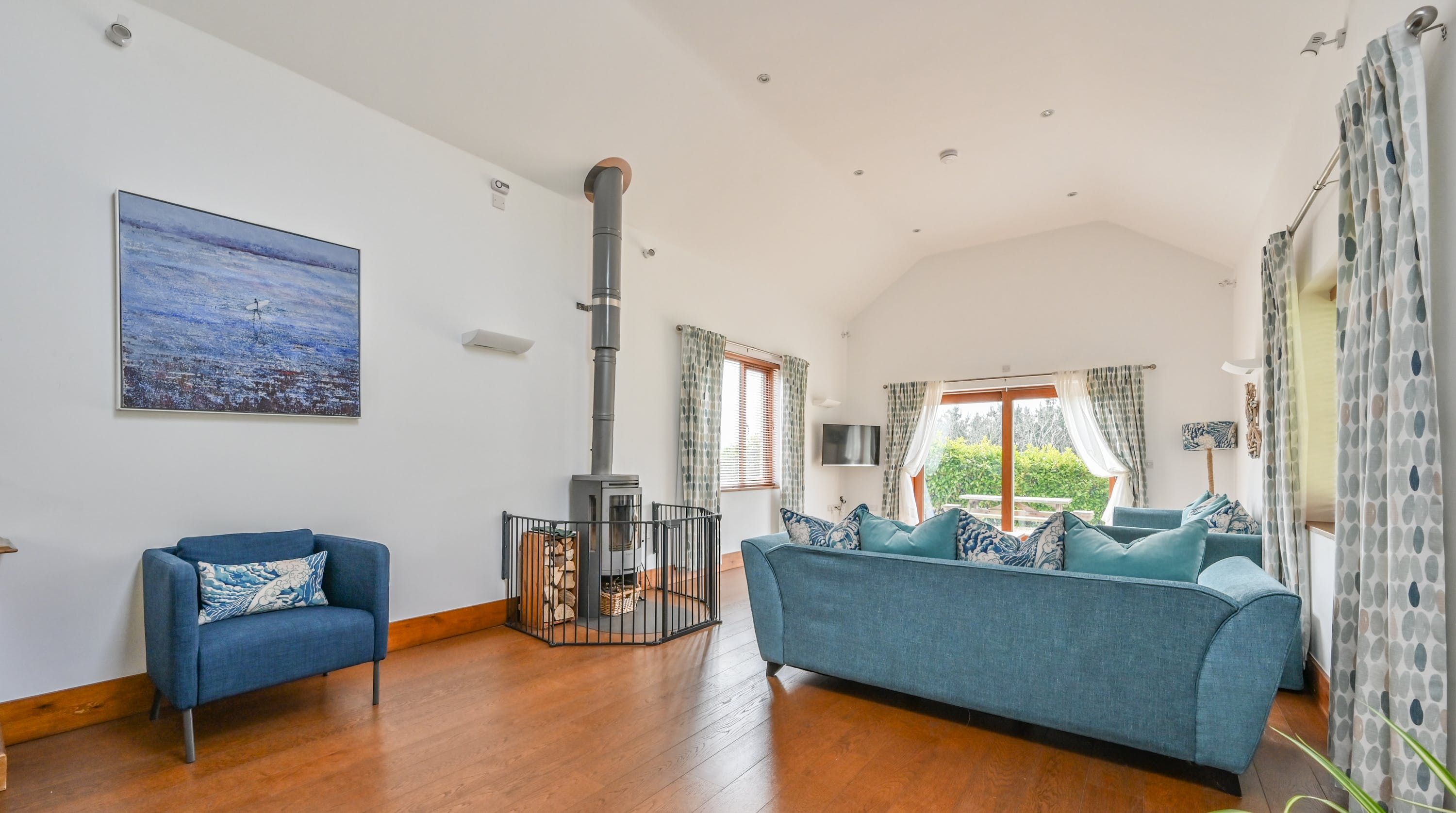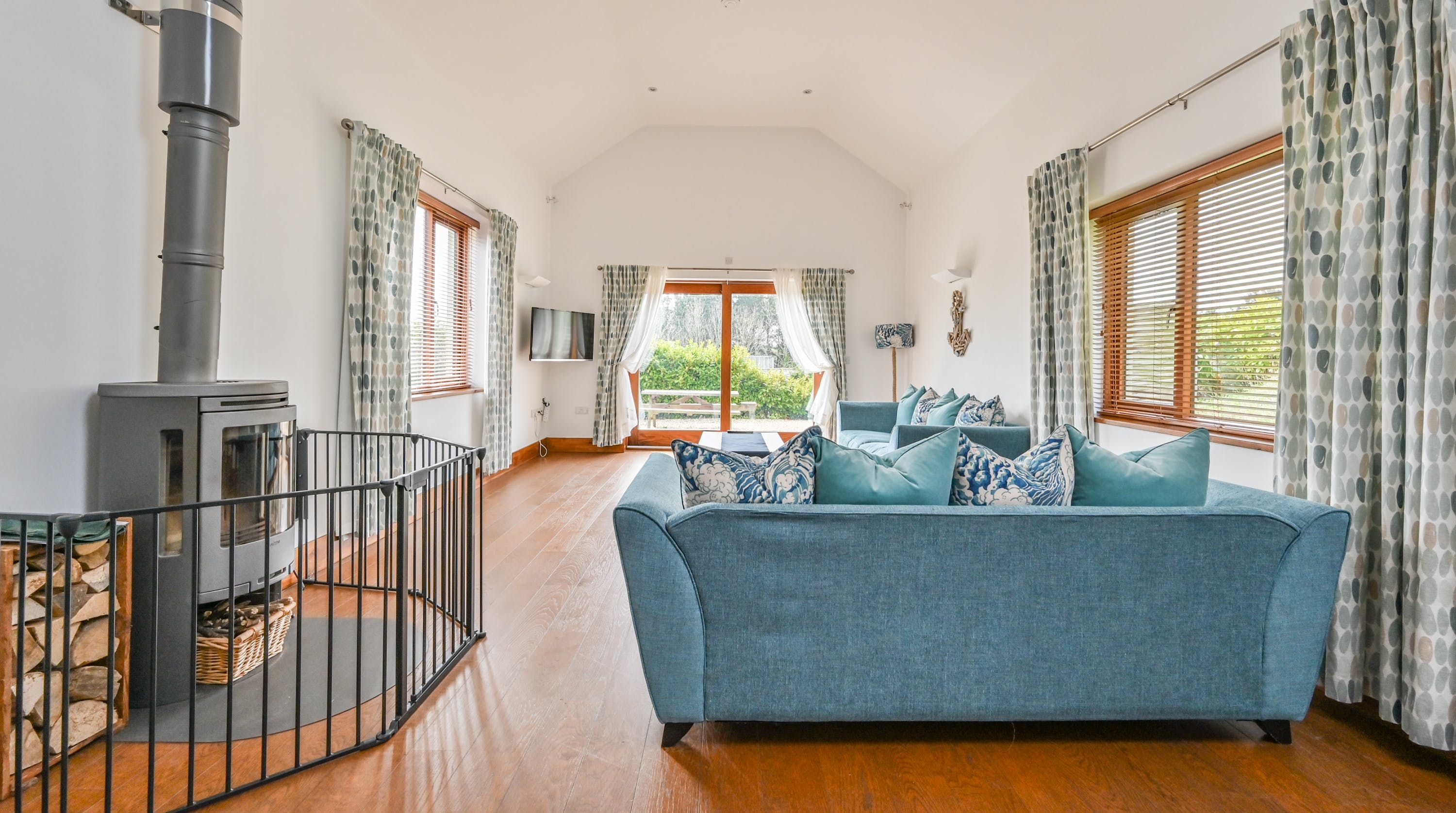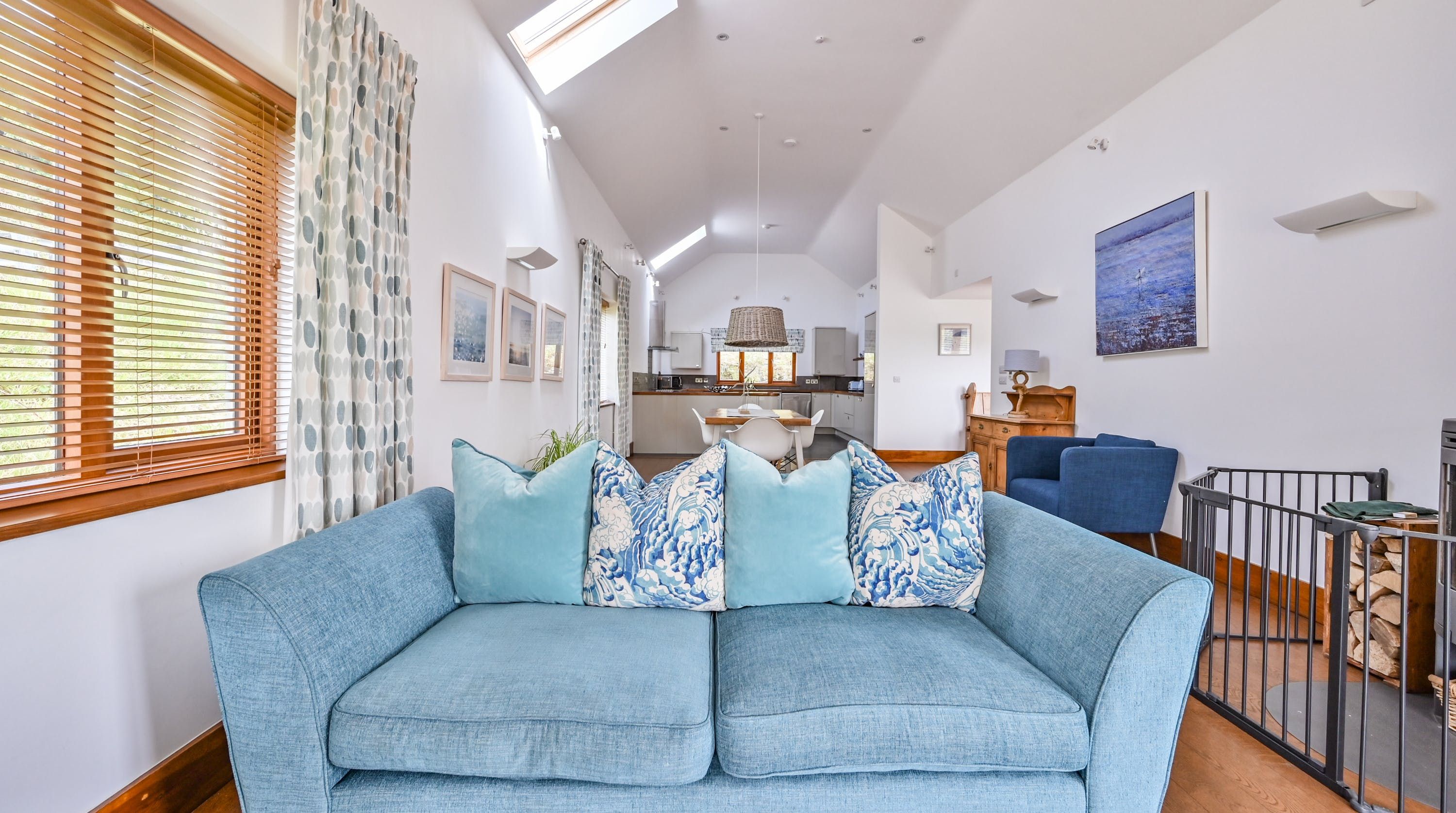 The soothing interior, cloaked in blue tones and natural textures, is a haven where you can truly relax. Fire up the wood-burner on chilly evenings and curl up with a good movie. And, on sunny days, you'll be delighted that there's a large lawn where the kids can play while you sit at the picnic table with a cool drink and breathe in the fresh air.