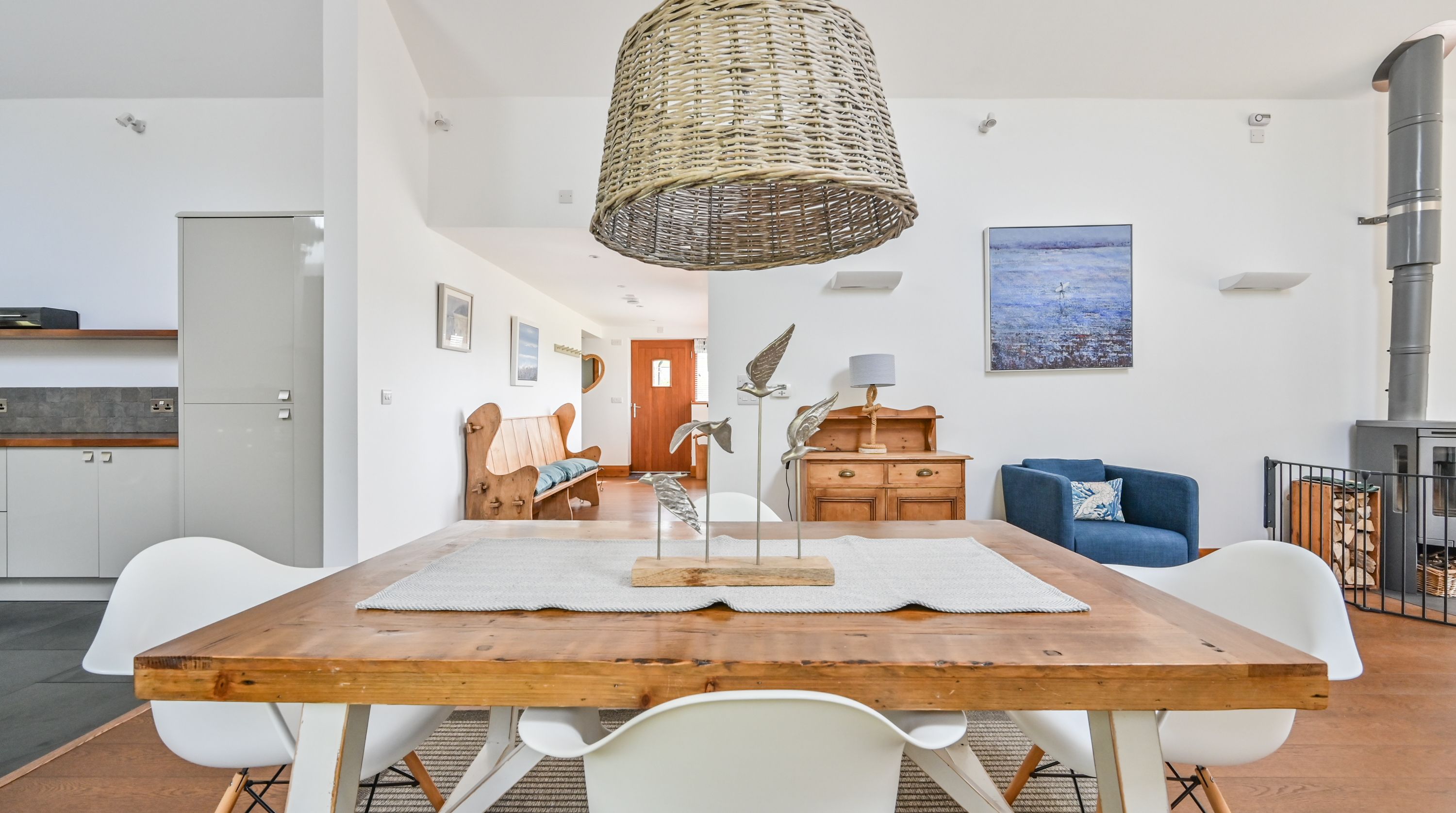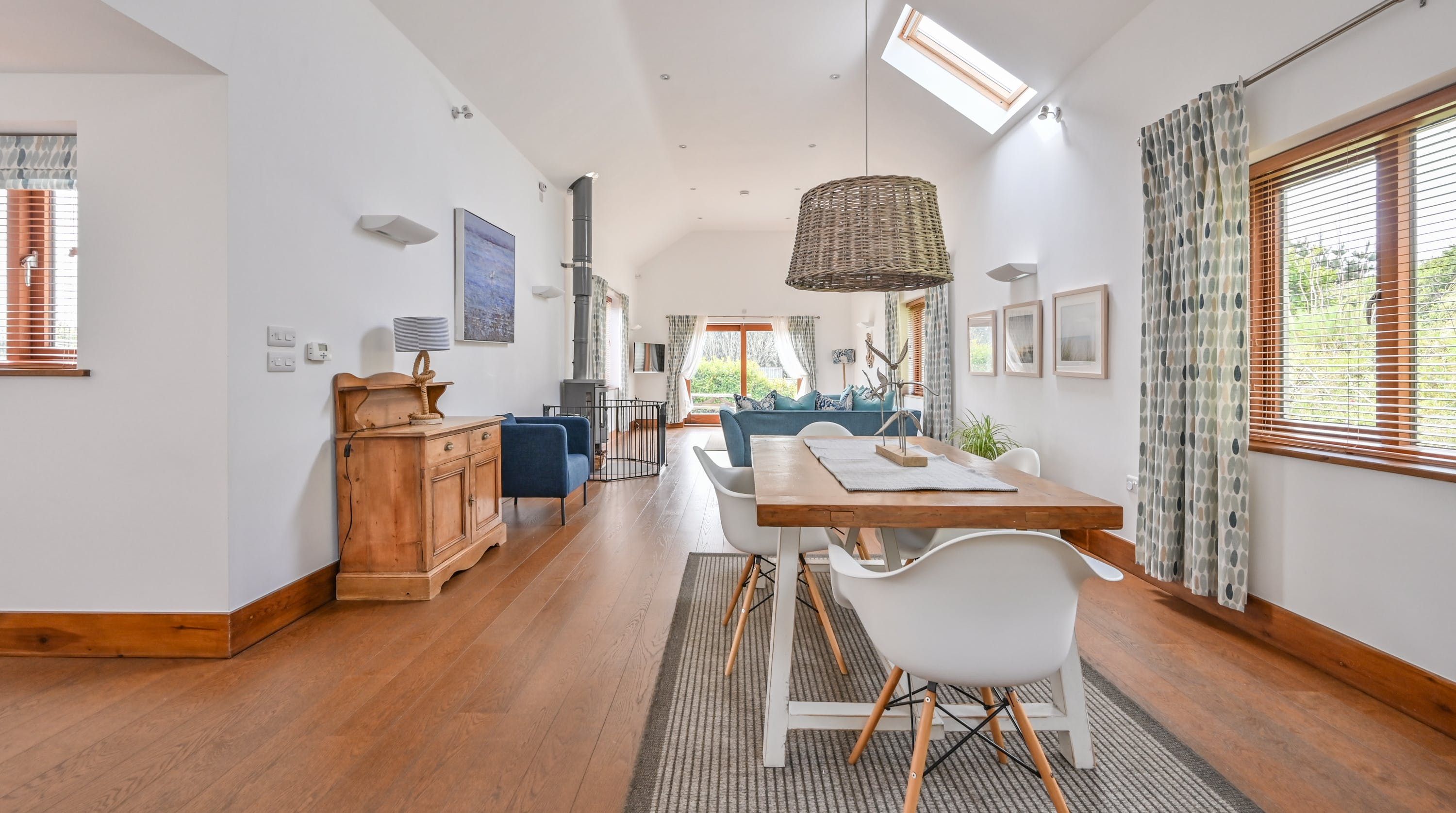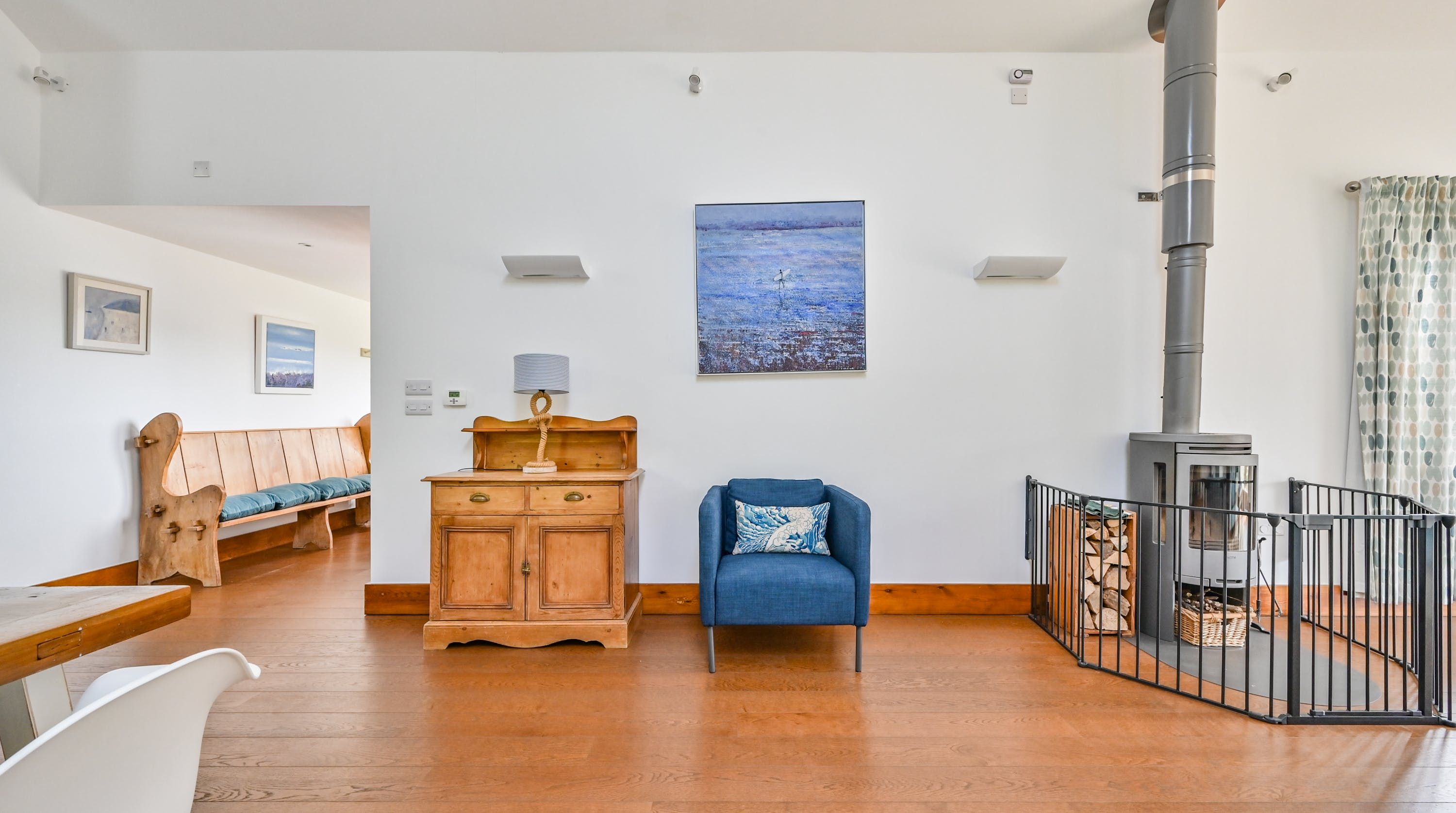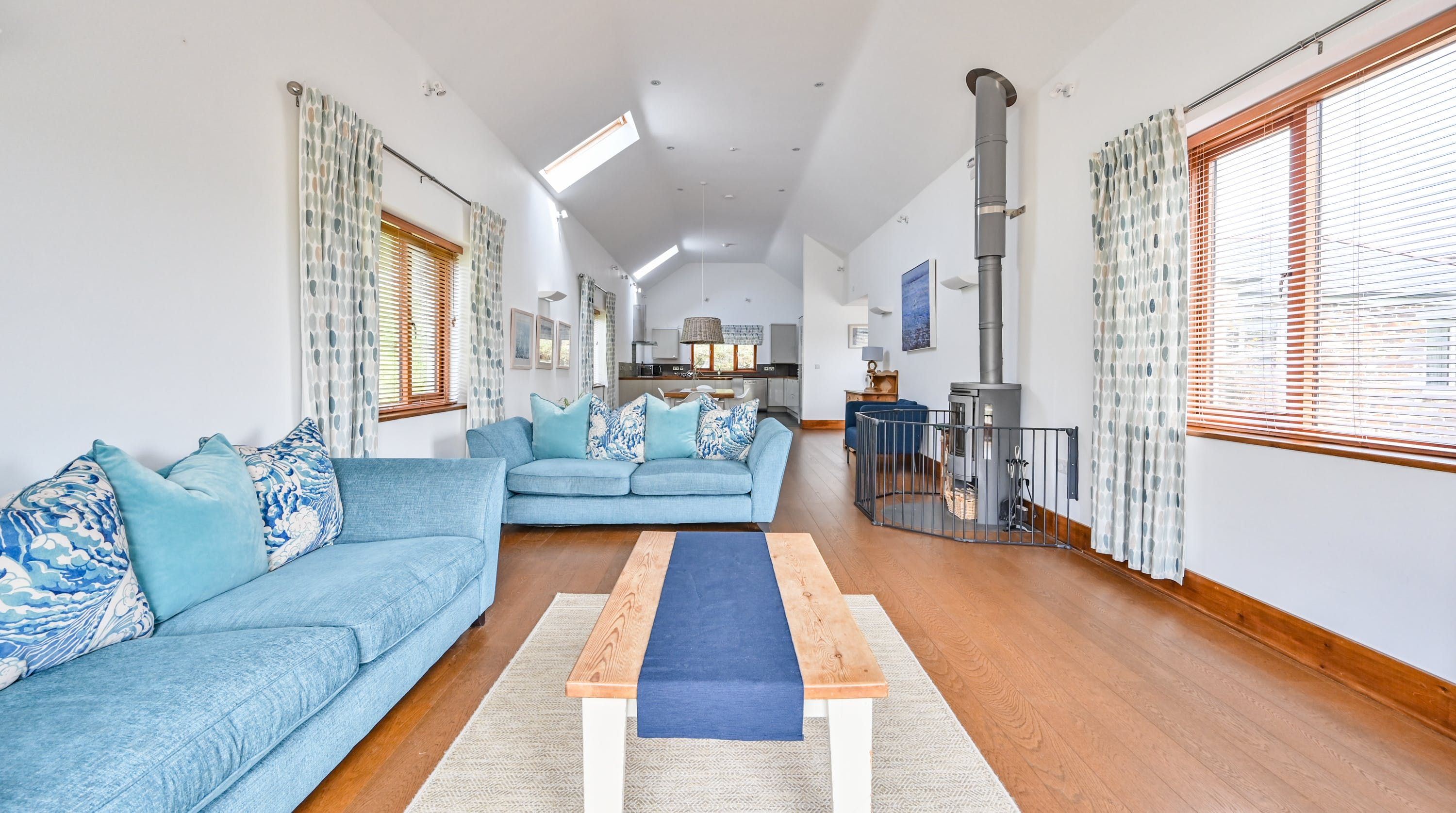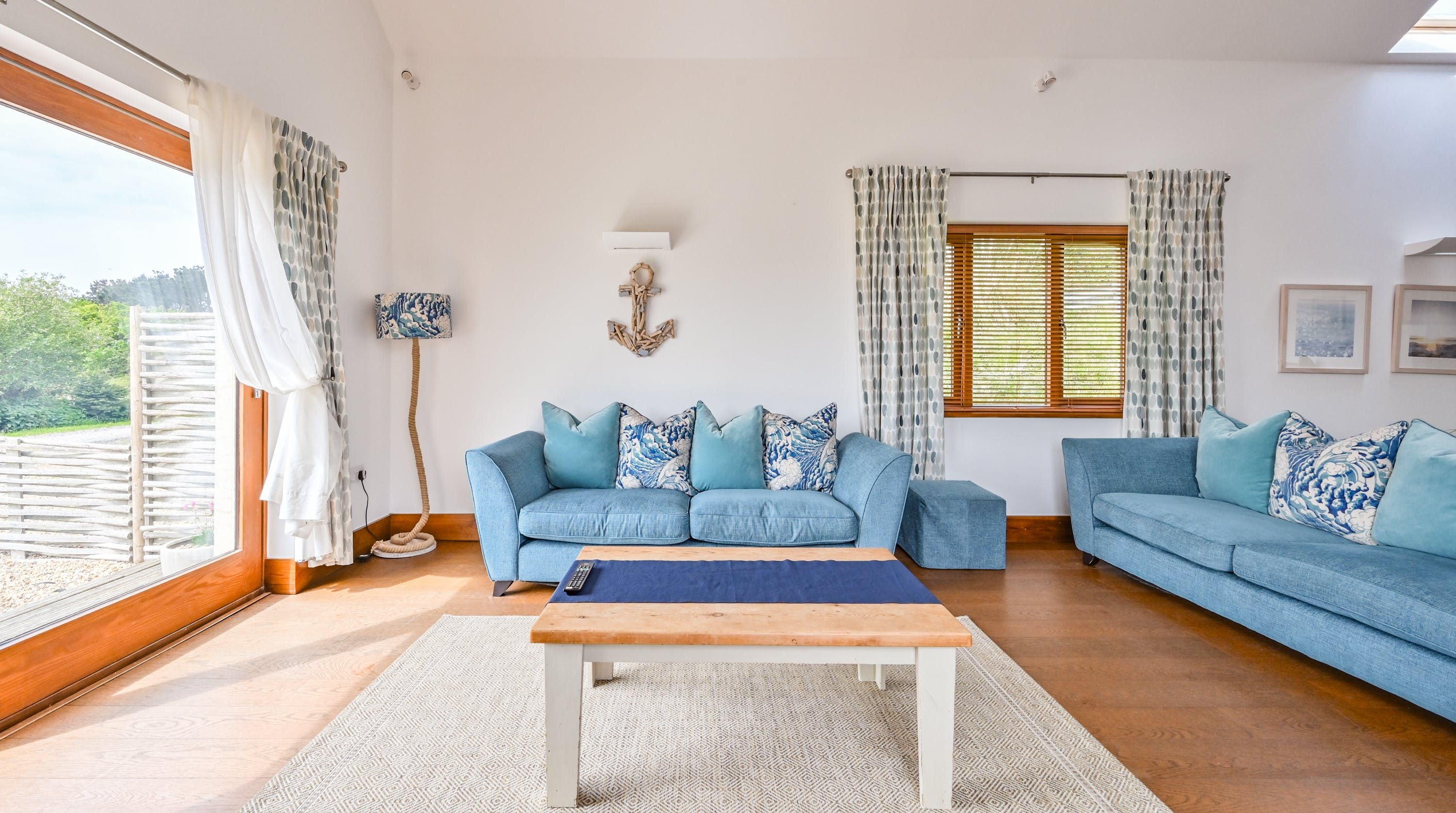 The soothing interior, cloaked in blue tones and natural textures, is a haven where you can truly relax. Fire up the wood-burner on chilly evenings and curl up with a good movie. And, on sunny days, you'll be delighted that there's a large lawn where the kids can play while you sit at the picnic table with a cool drink and breathe in the fresh air.