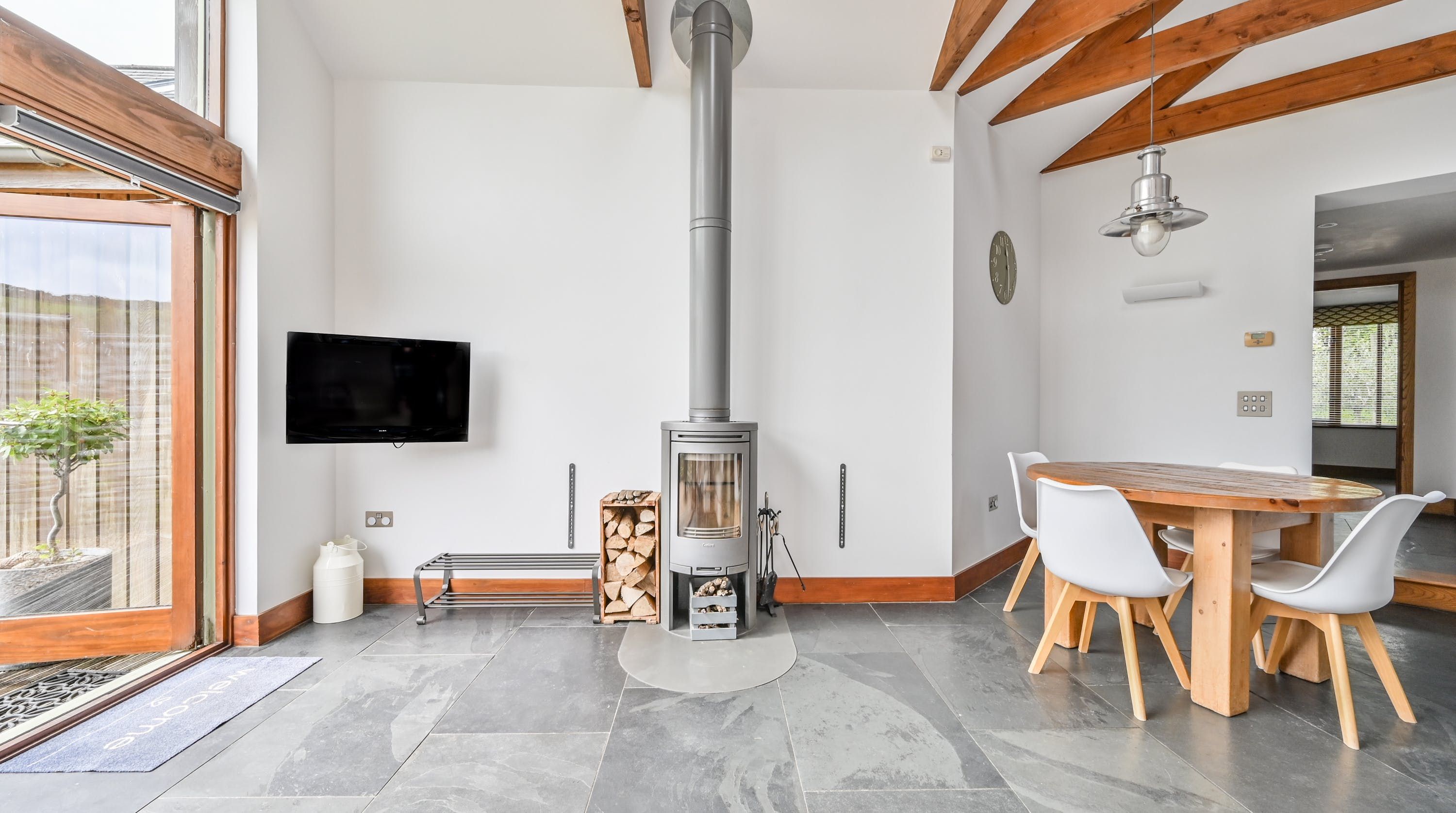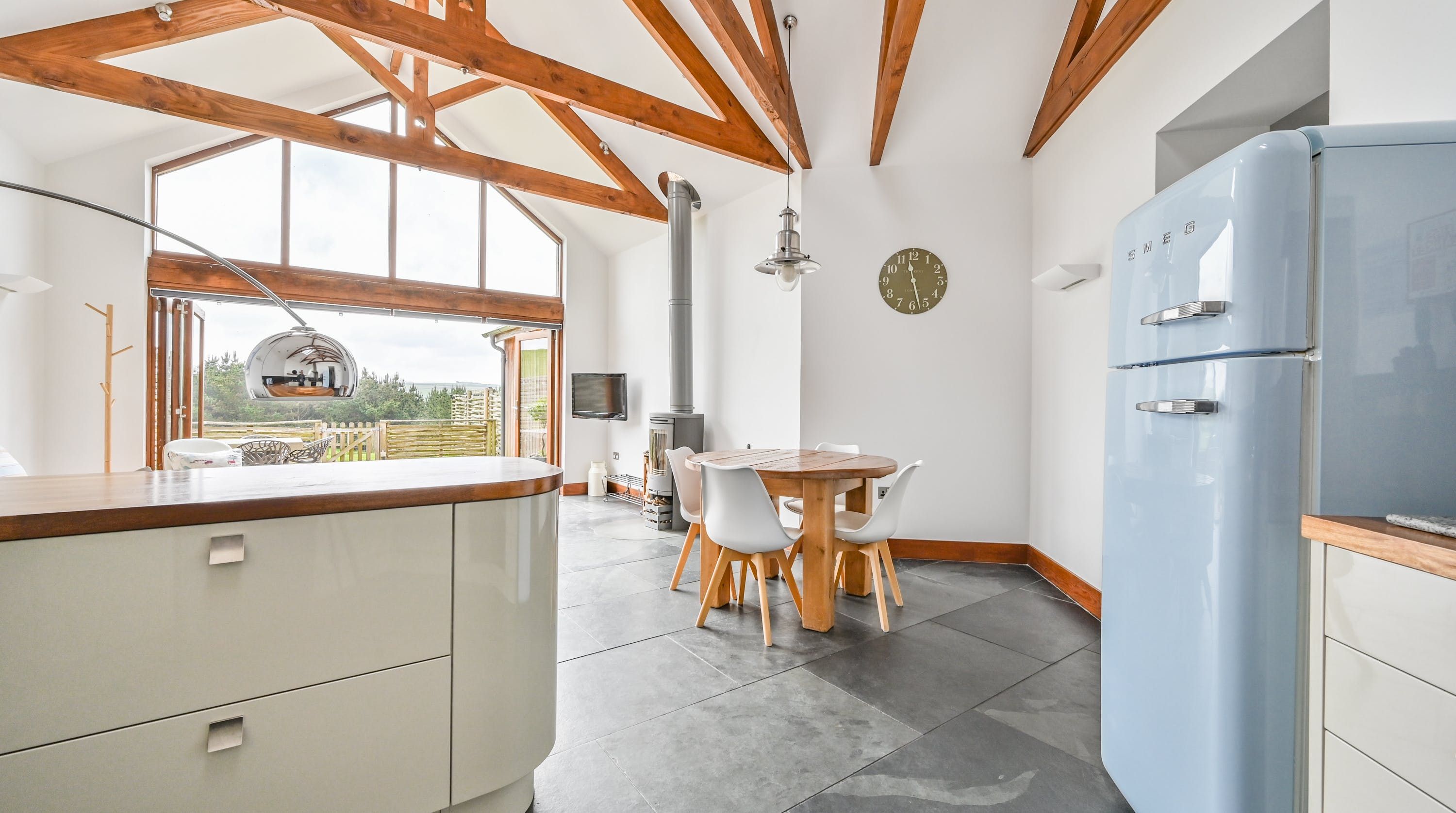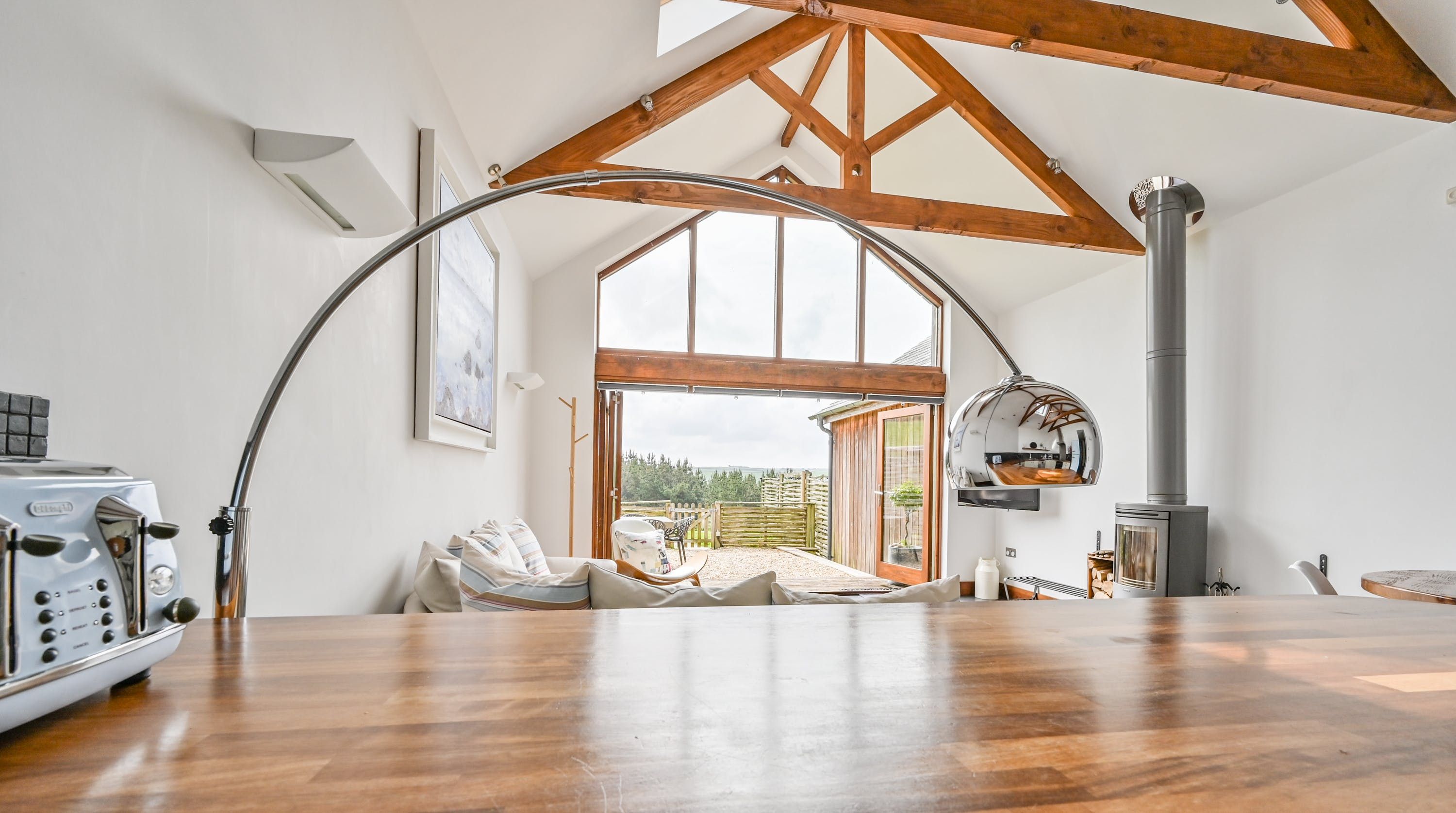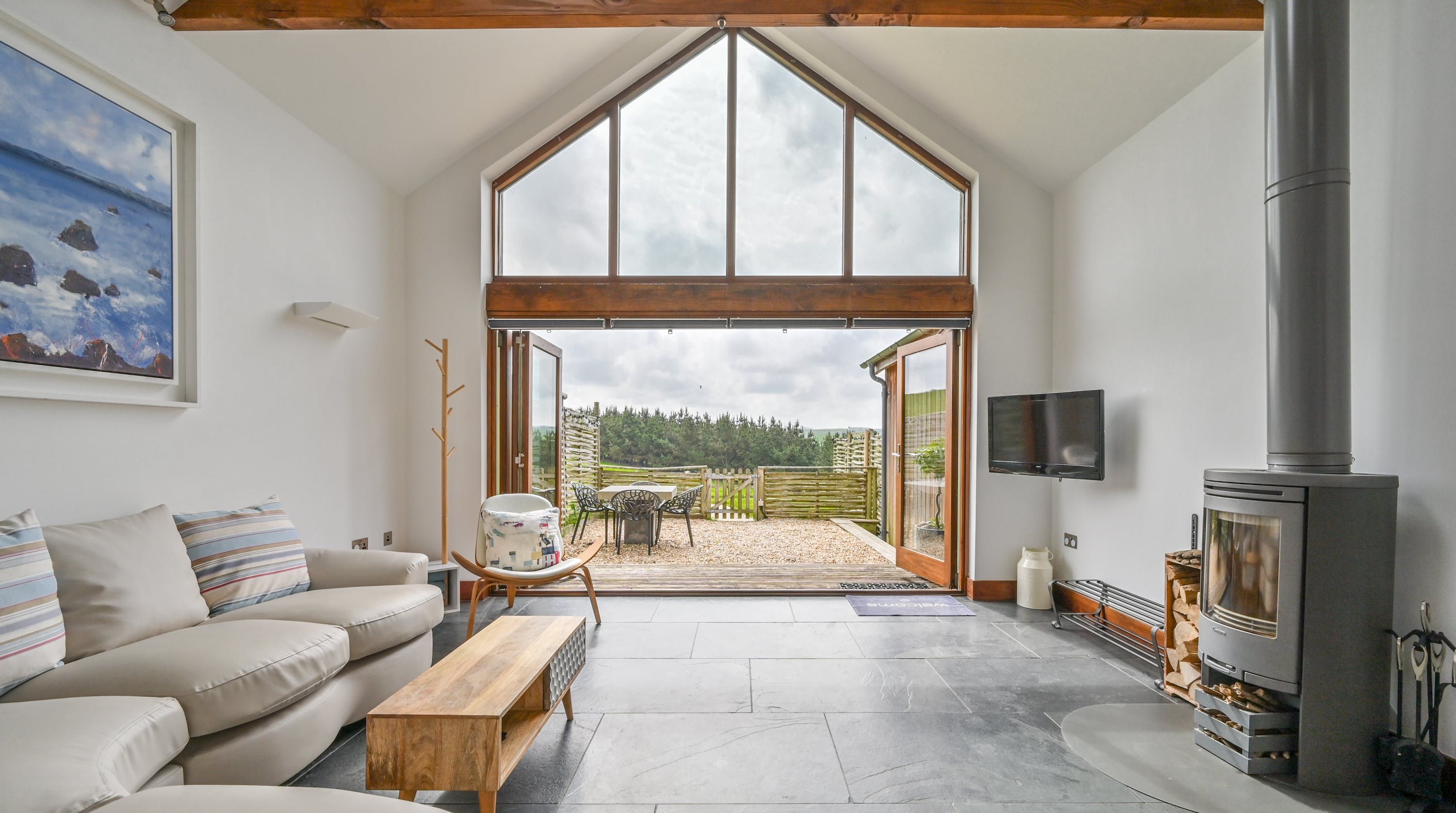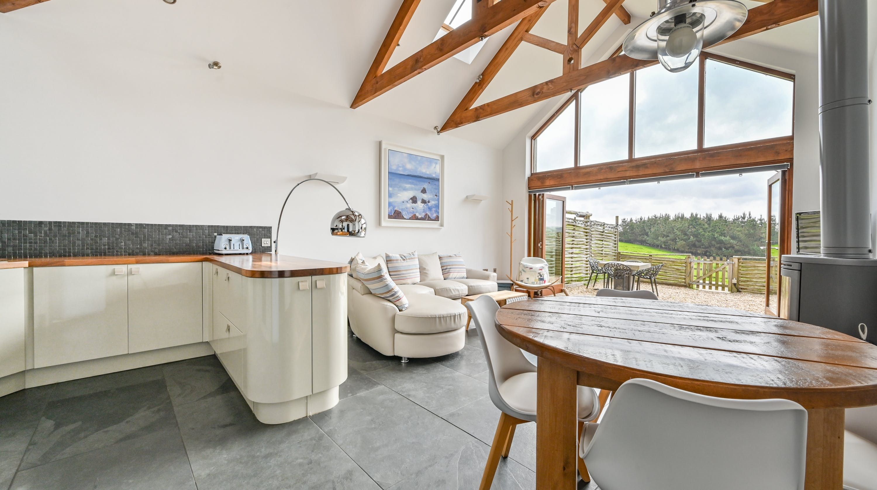 Step inside, and your eyes will instantly be drawn to the vaulted ceiling and double-height window framing the gorgeous rural views outside. On chilly evenings you can light up the wood-burning stove and get cosy with a good movie, while in the summer months, you can head outside to the patio for an alfresco meal in the sunshine.