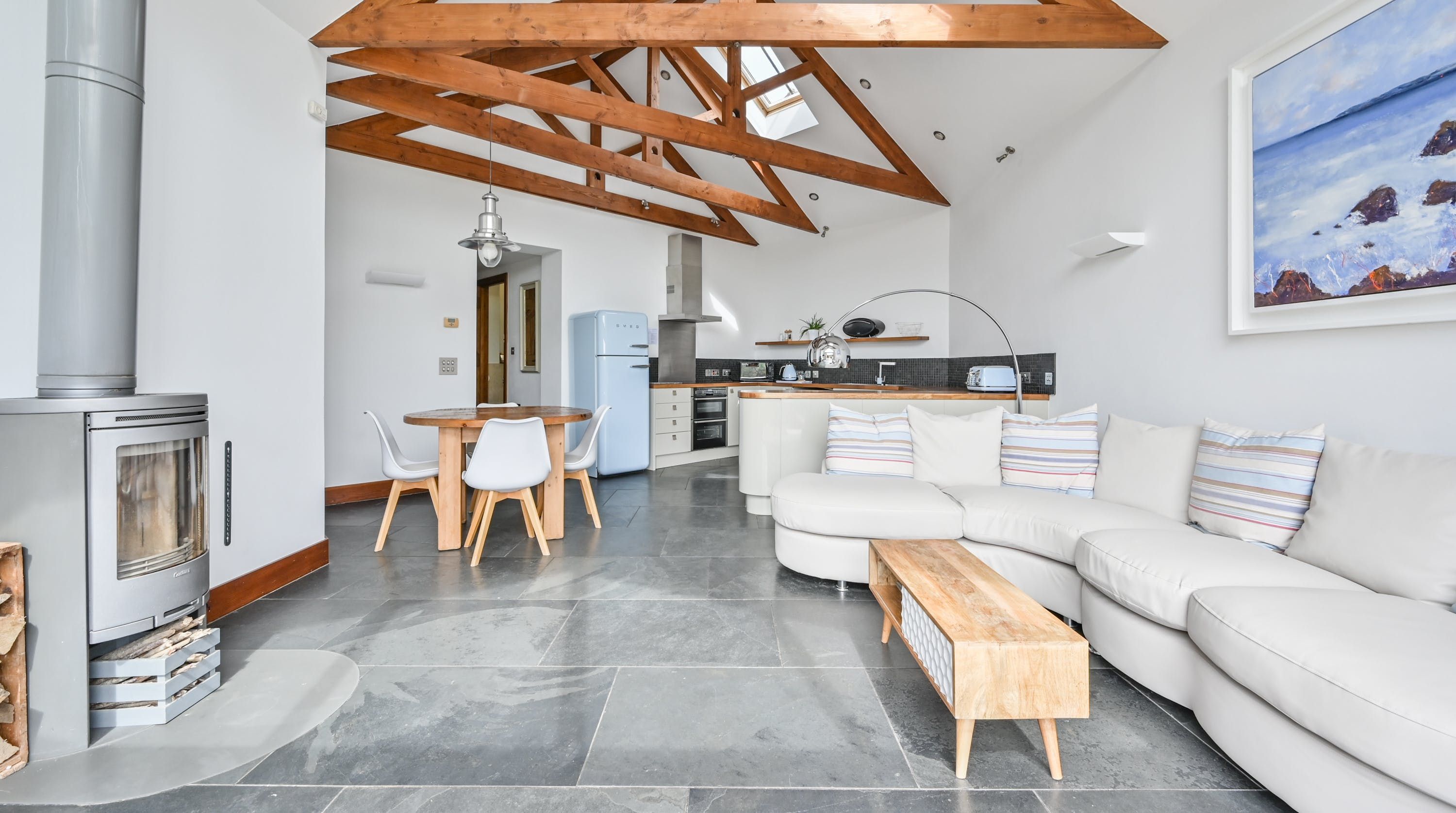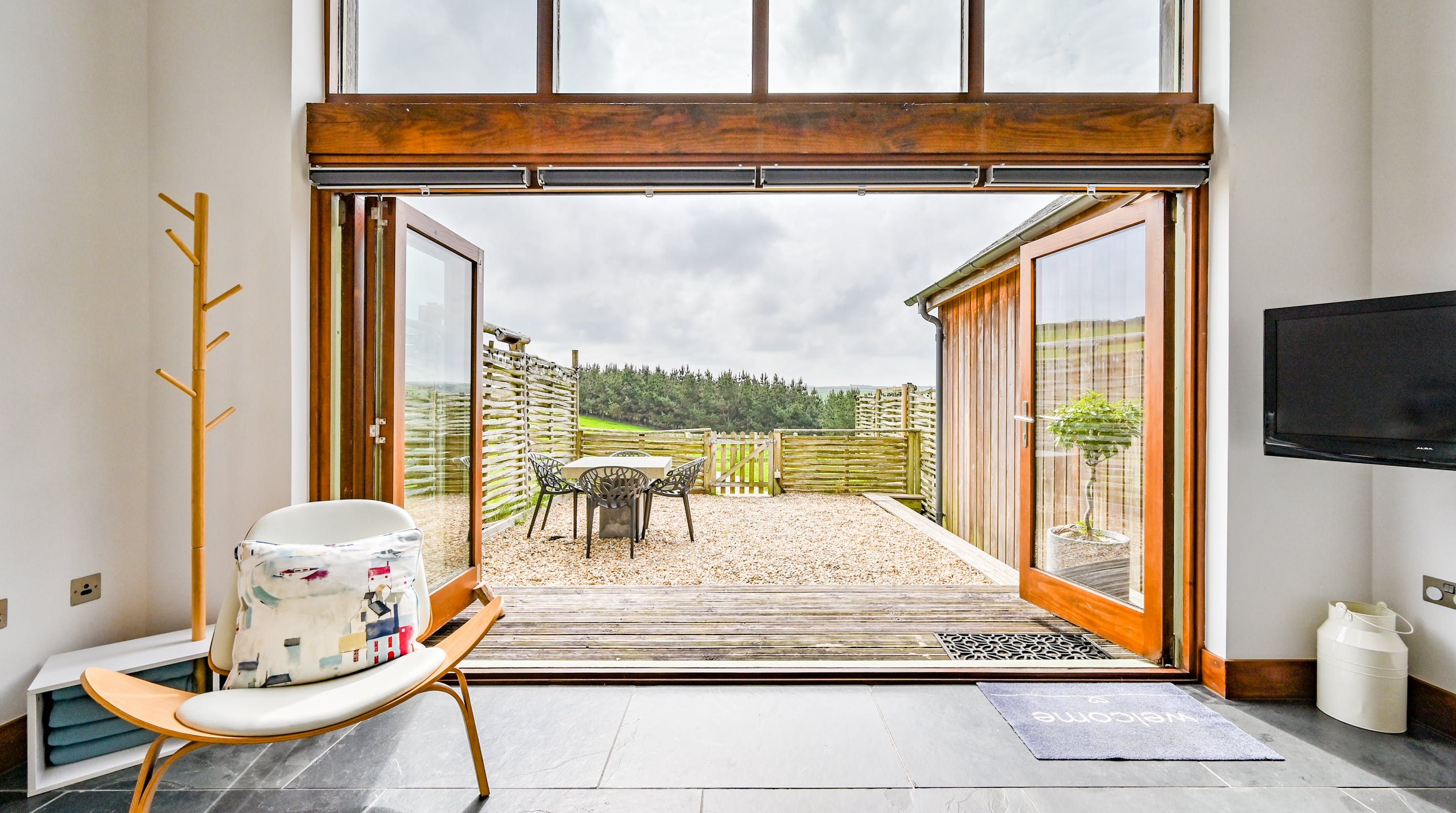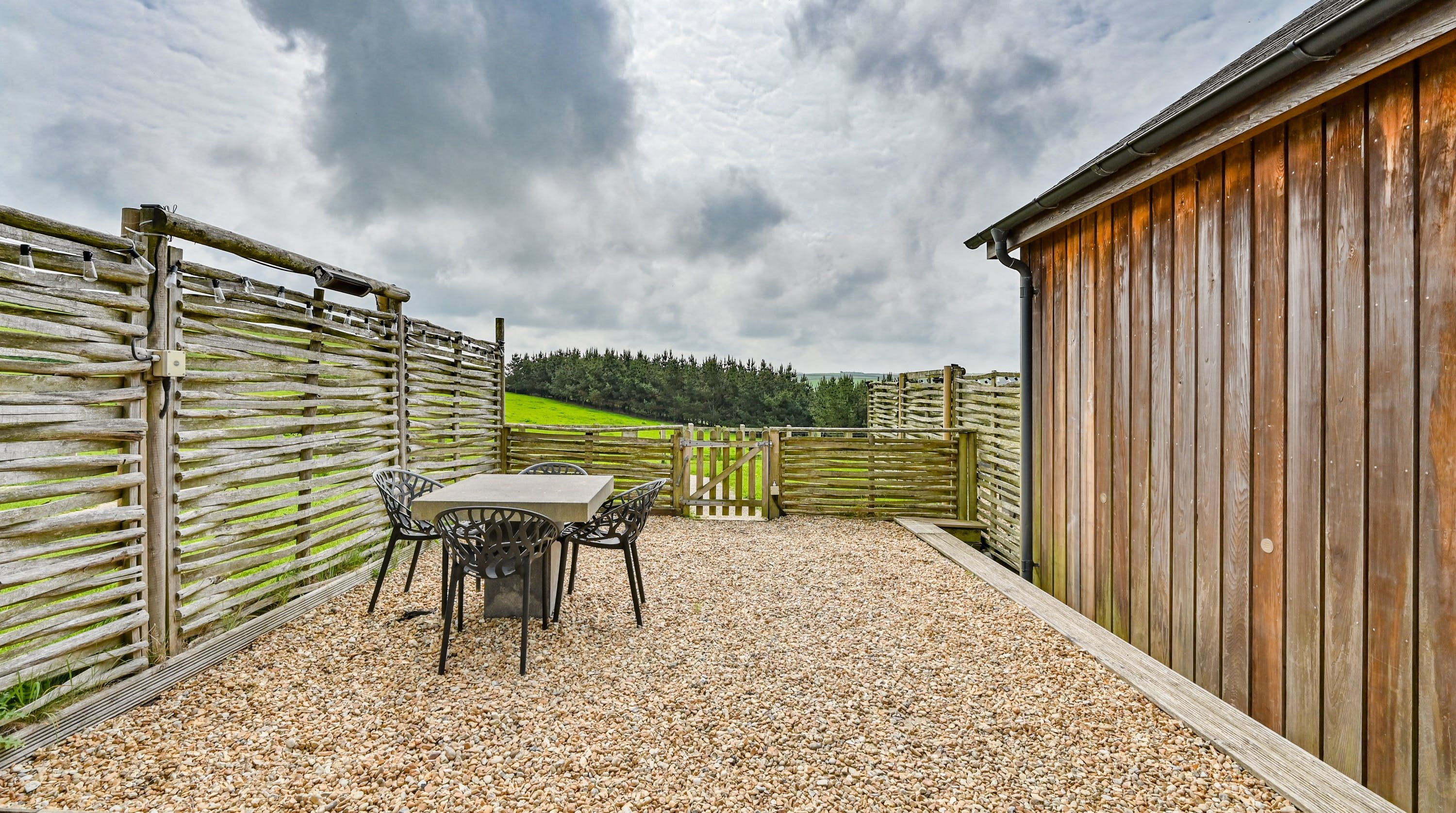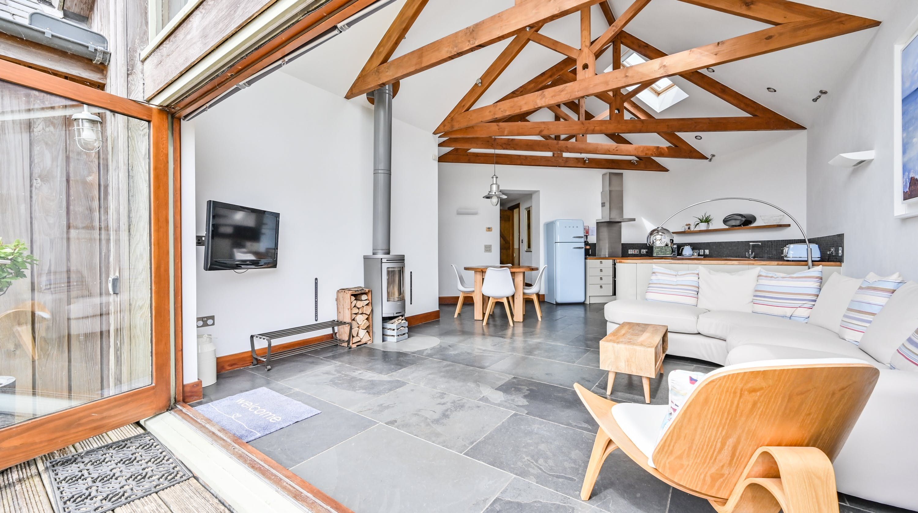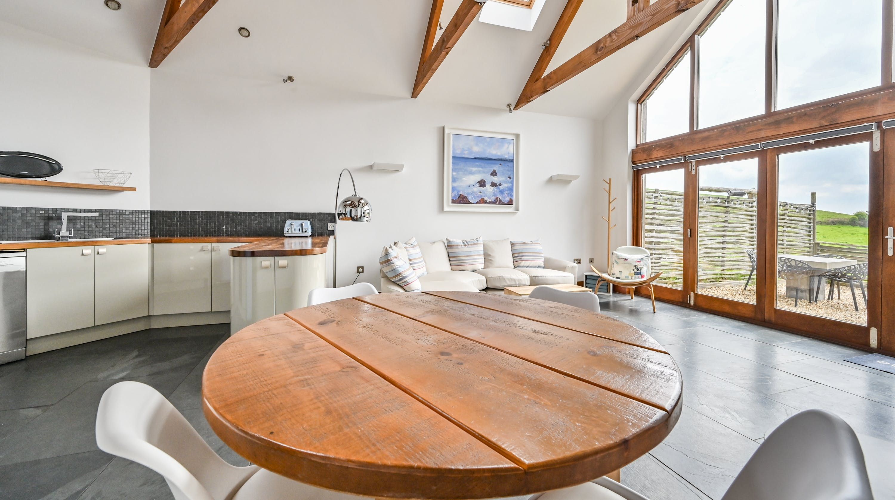 Step inside, and your eyes will instantly be drawn to the vaulted ceiling and double-height window framing the gorgeous rural views outside. On chilly evenings you can light up the wood-burning stove and get cosy with a good movie, while in the summer months, you can head outside to the patio for an alfresco meal in the sunshine.