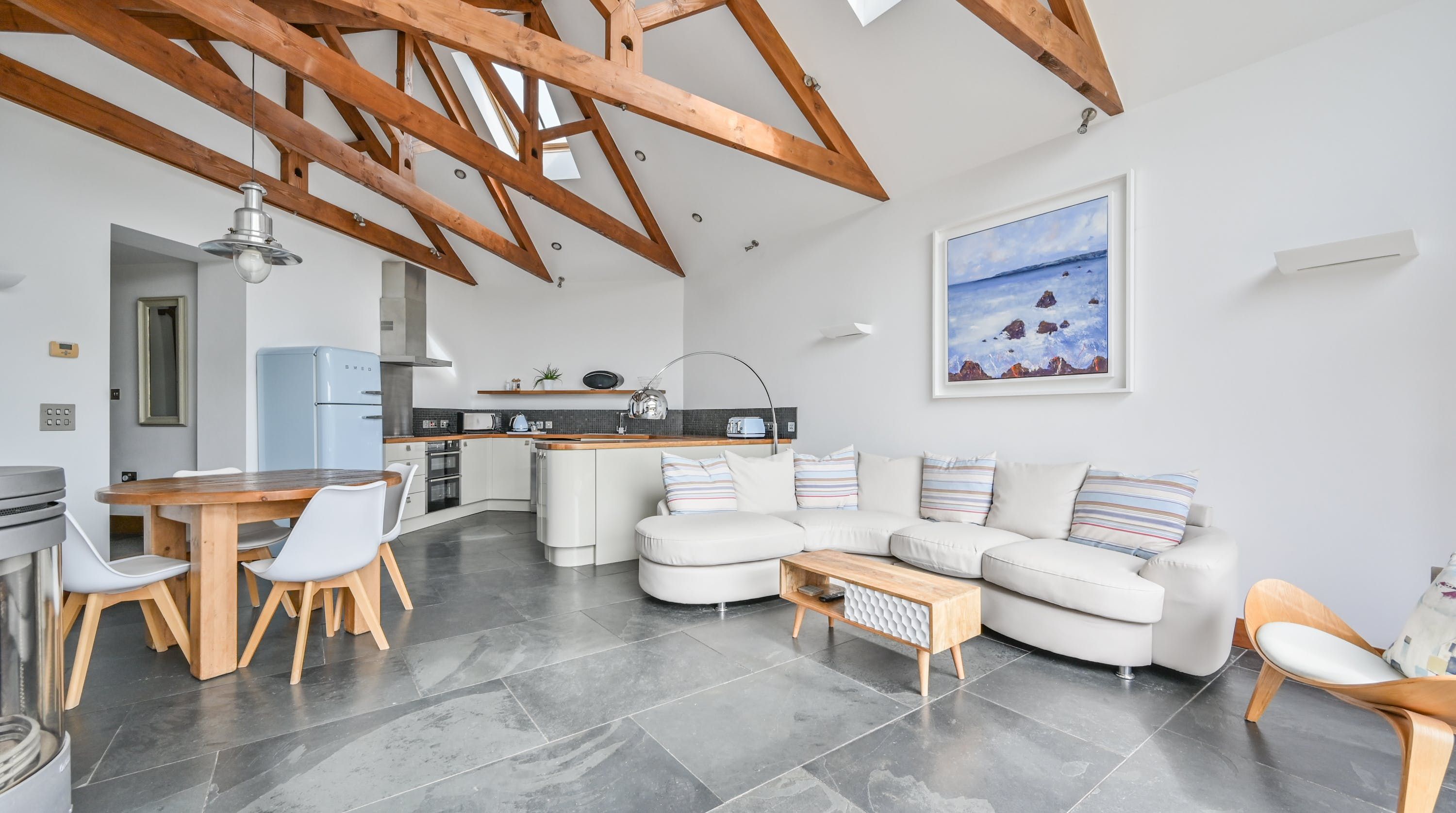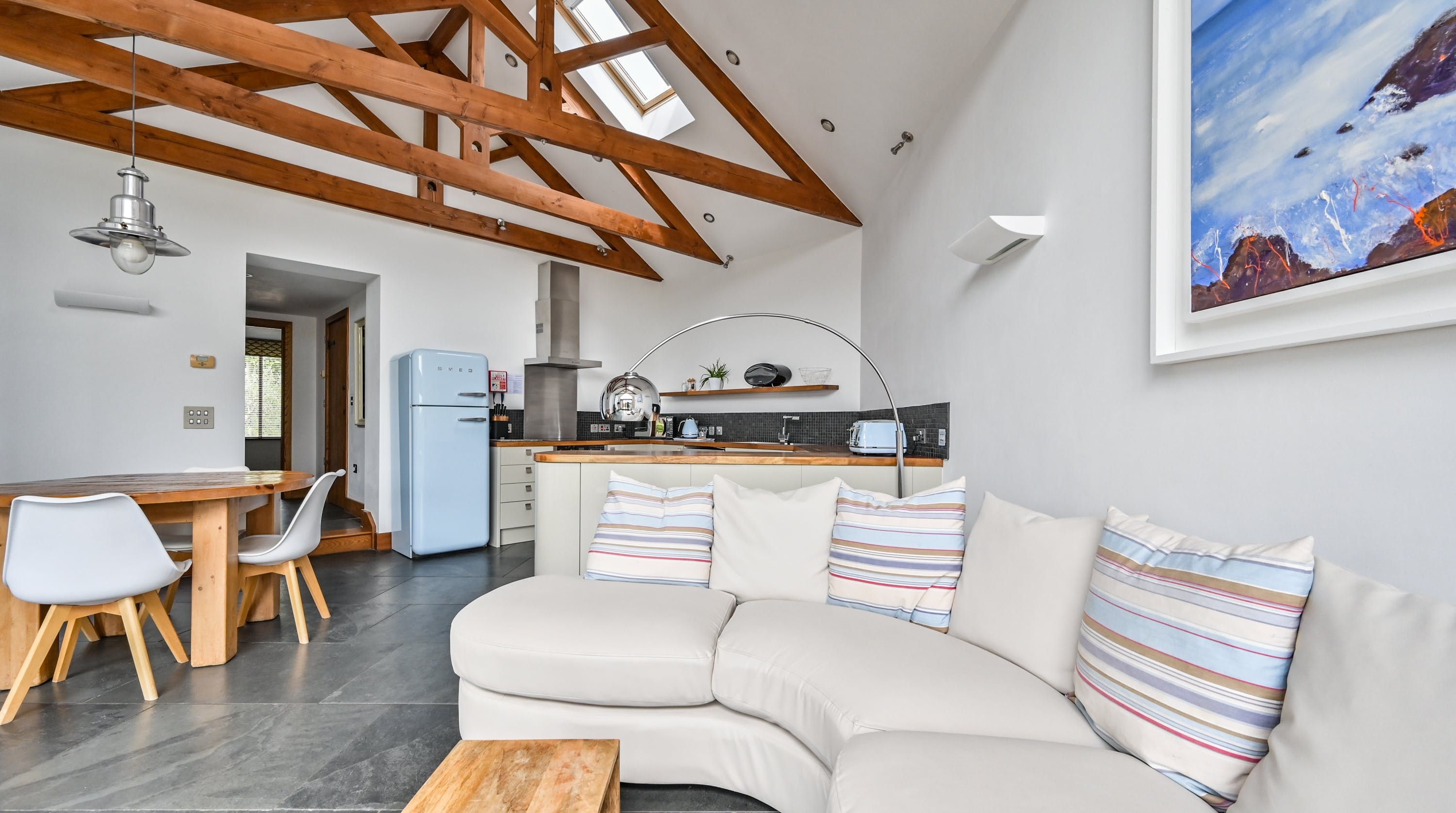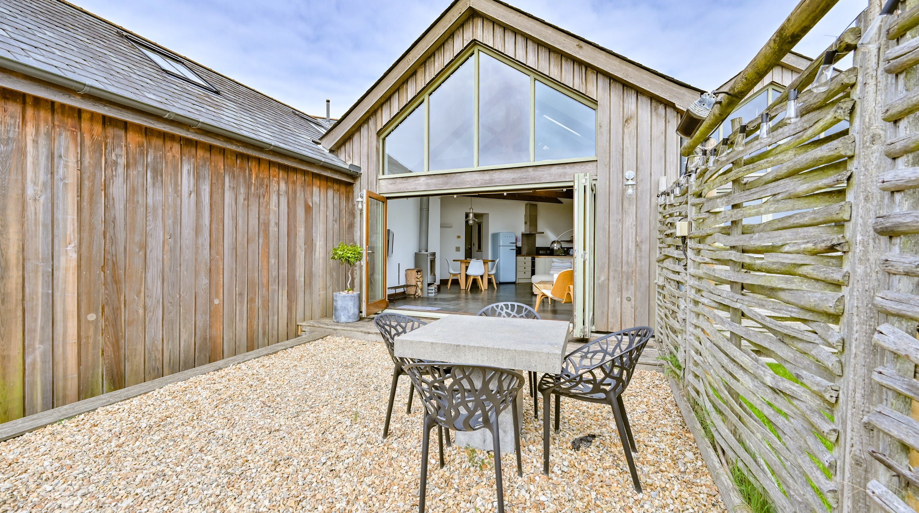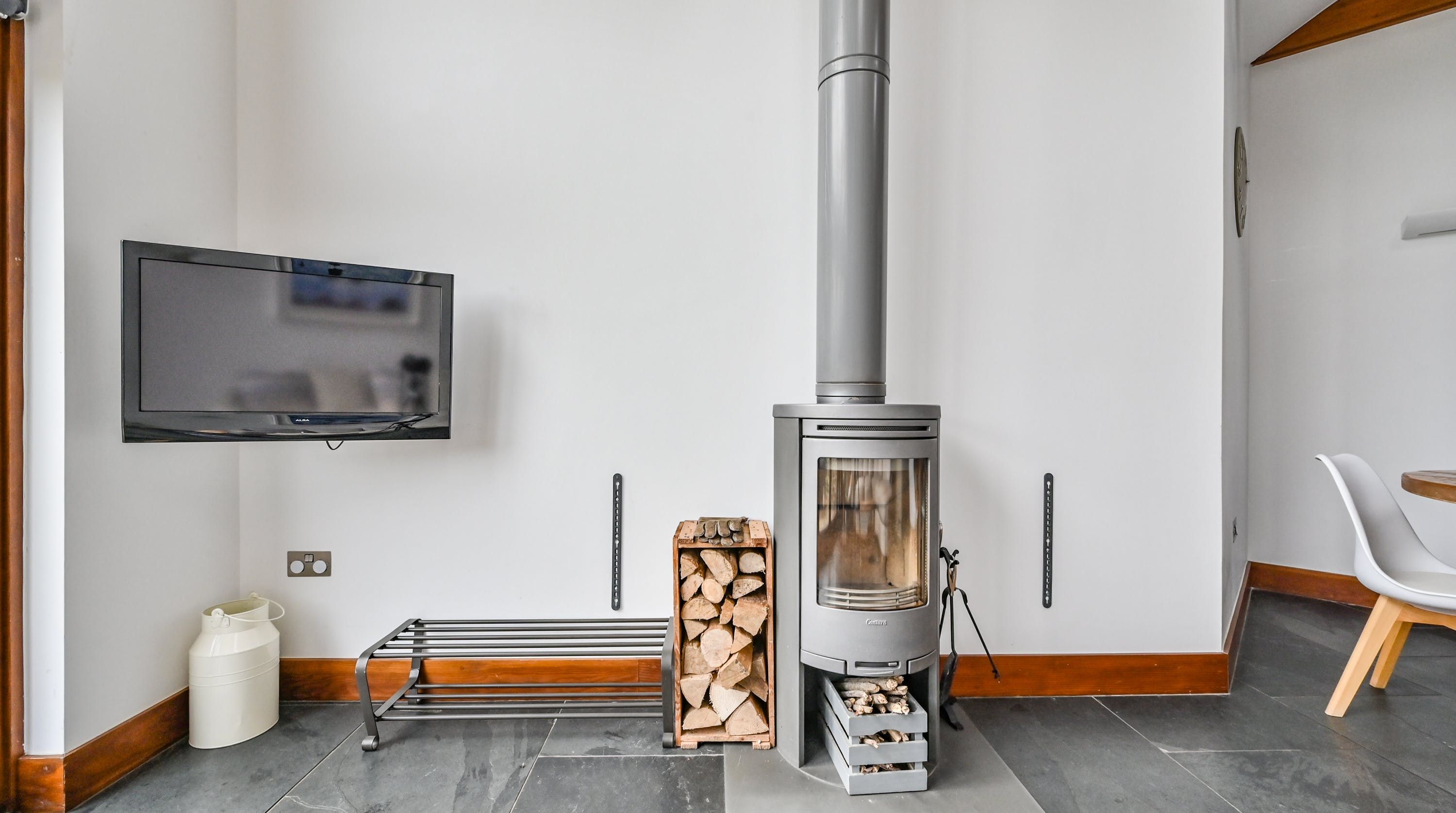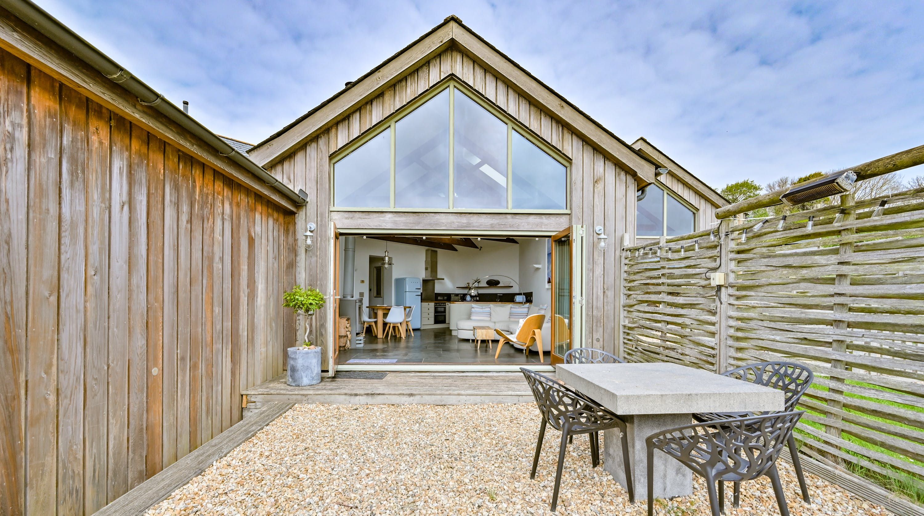 Step inside, and your eyes will instantly be drawn to the vaulted ceiling and double-height window framing the gorgeous rural views outside. On chilly evenings you can light up the wood-burning stove and get cosy with a good movie, while in the summer months, you can head outside to the patio for an alfresco meal in the sunshine.