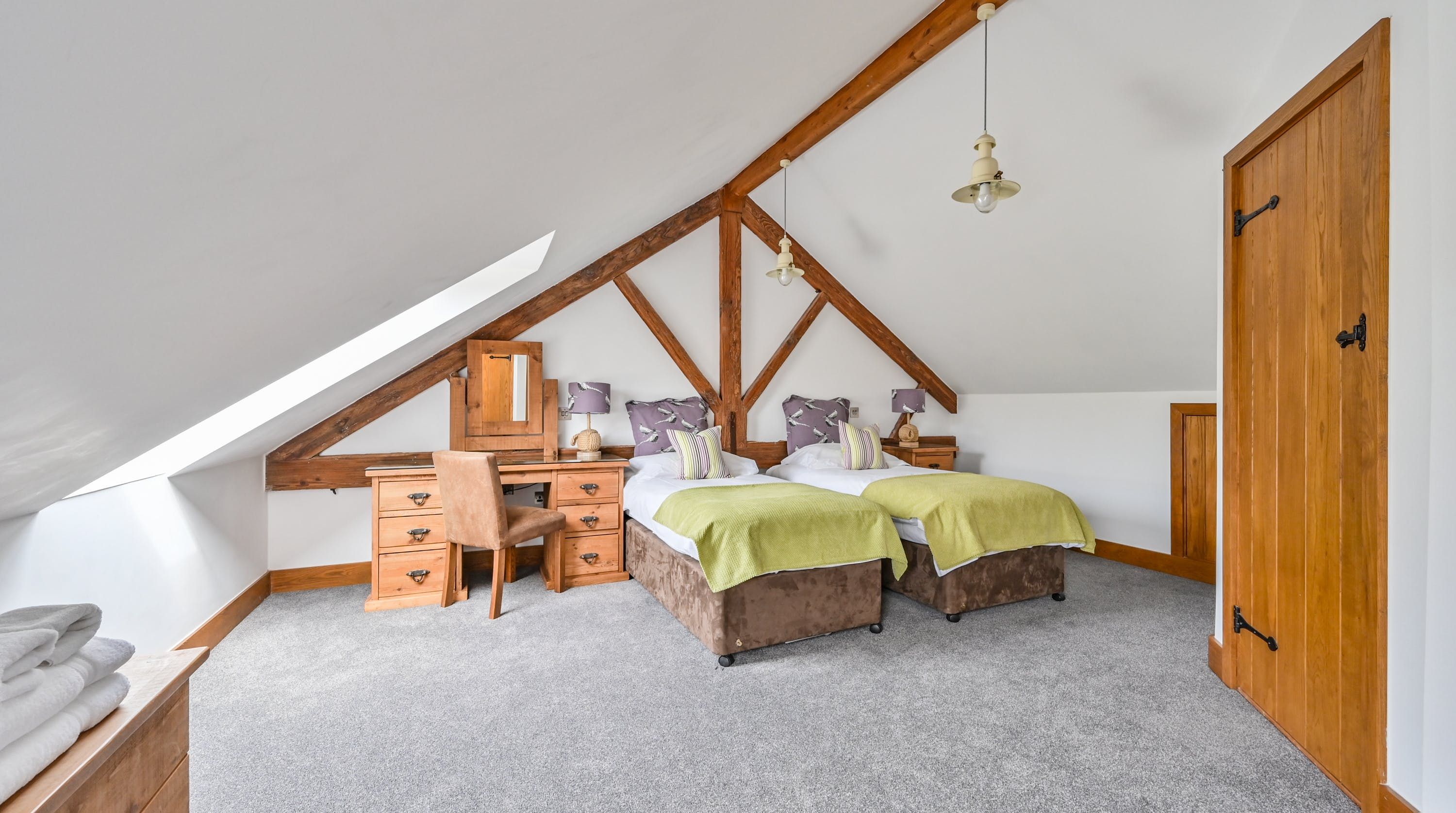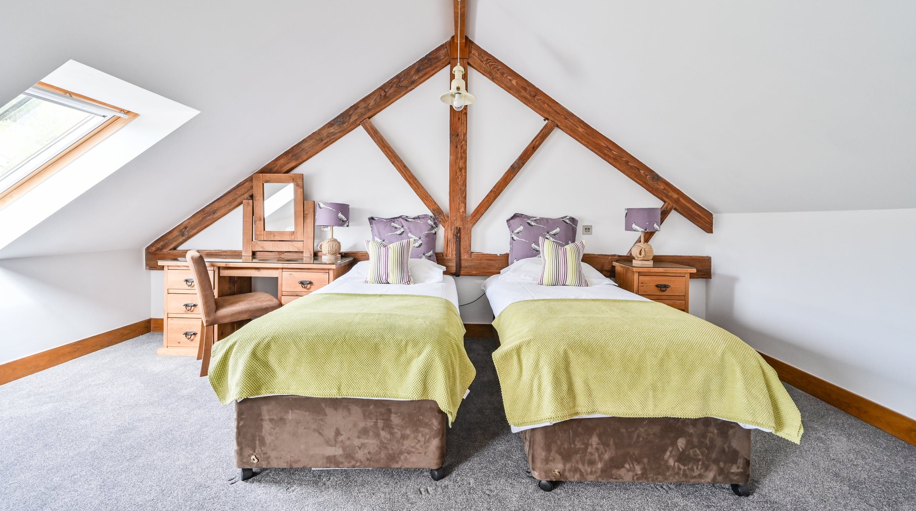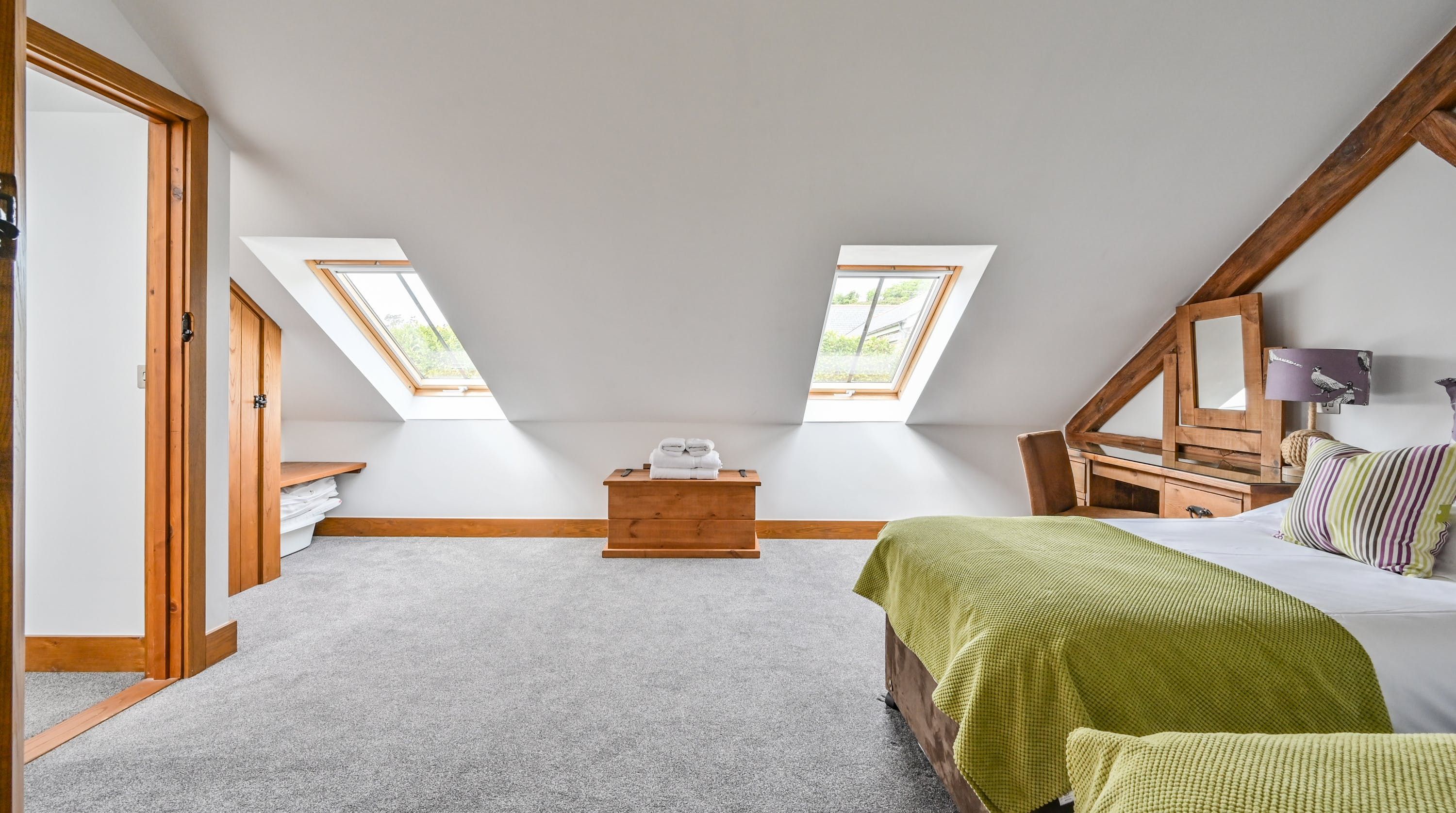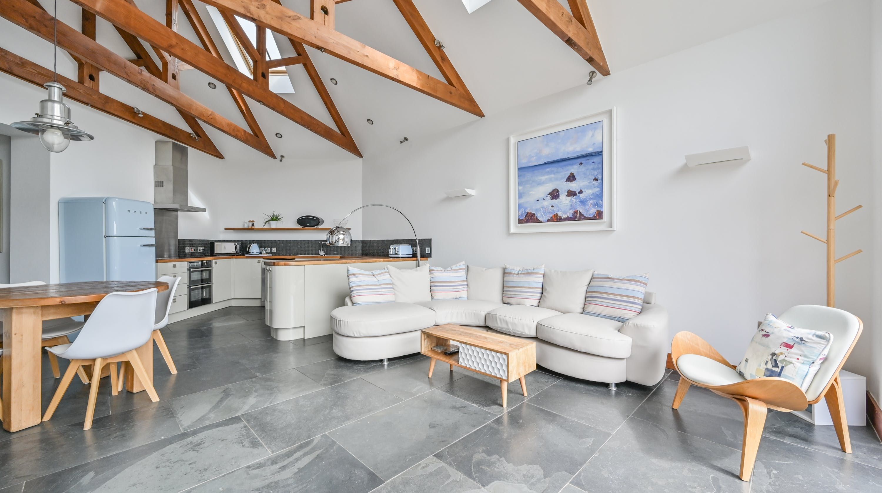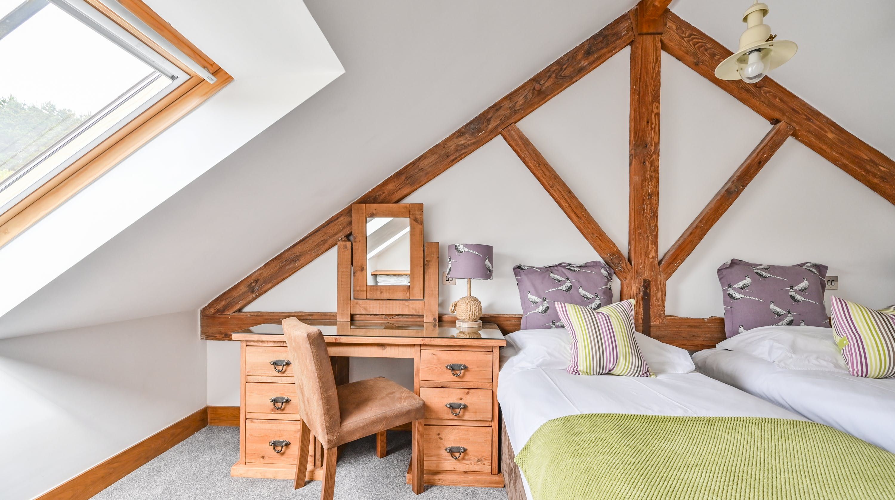 Step inside, and your eyes will instantly be drawn to the vaulted ceiling and double-height window framing the gorgeous rural views outside. On chilly evenings you can light up the wood-burning stove and get cosy with a good movie, while in the summer months, you can head outside to the patio for an alfresco meal in the sunshine.
