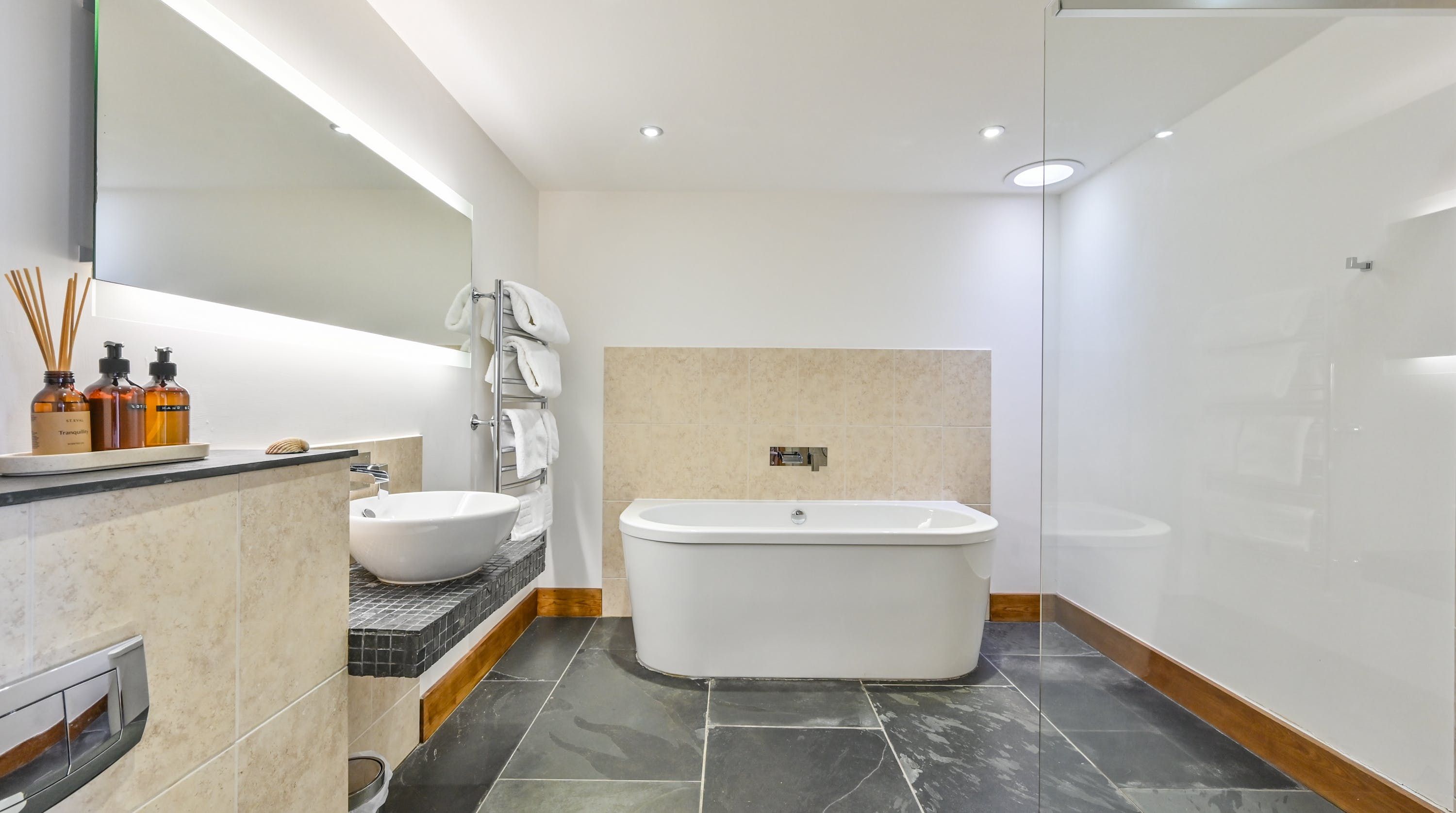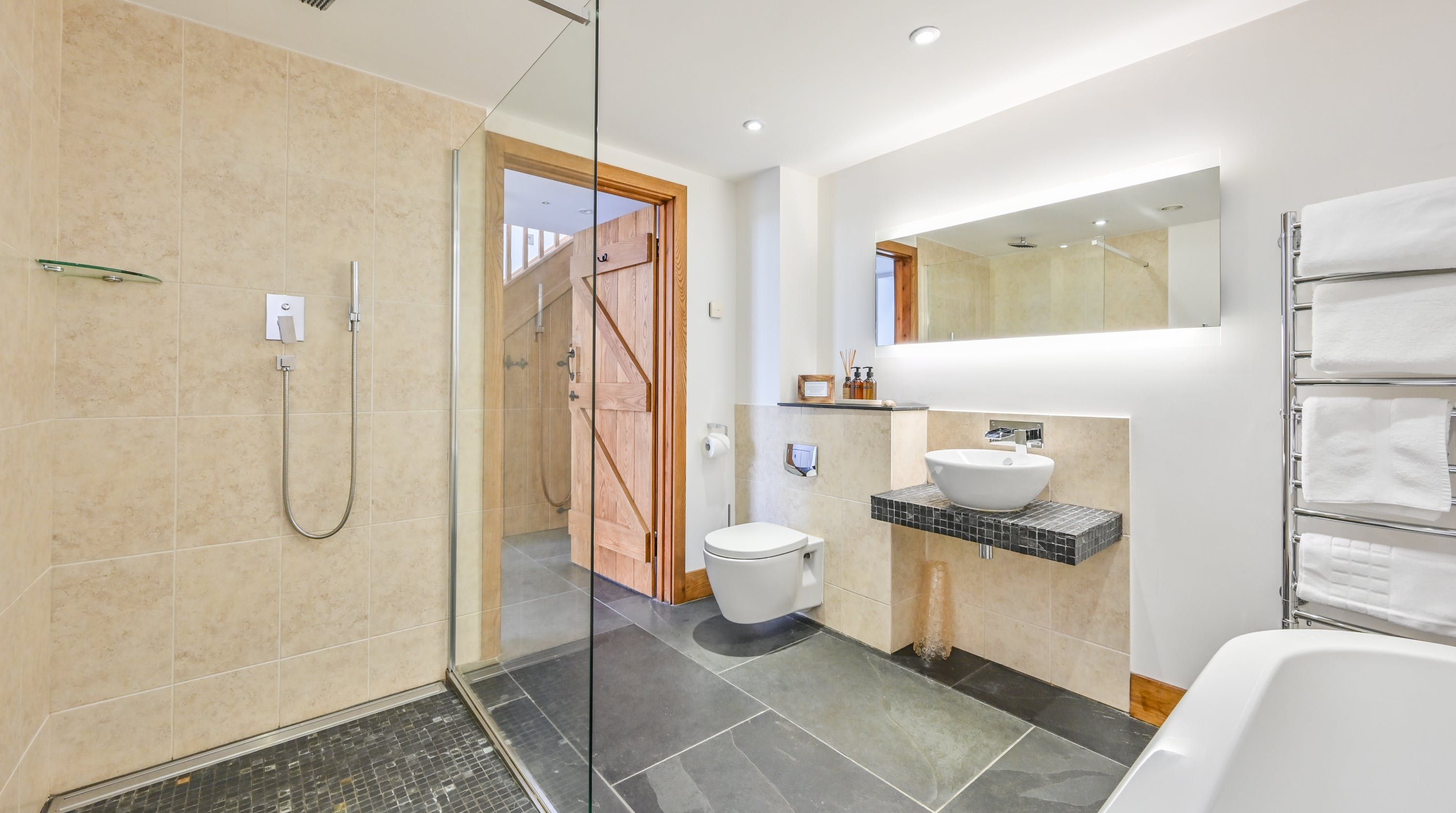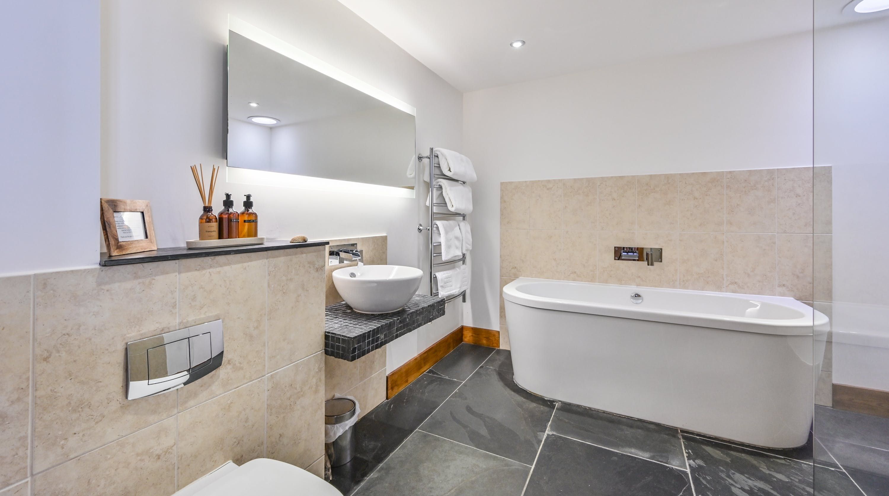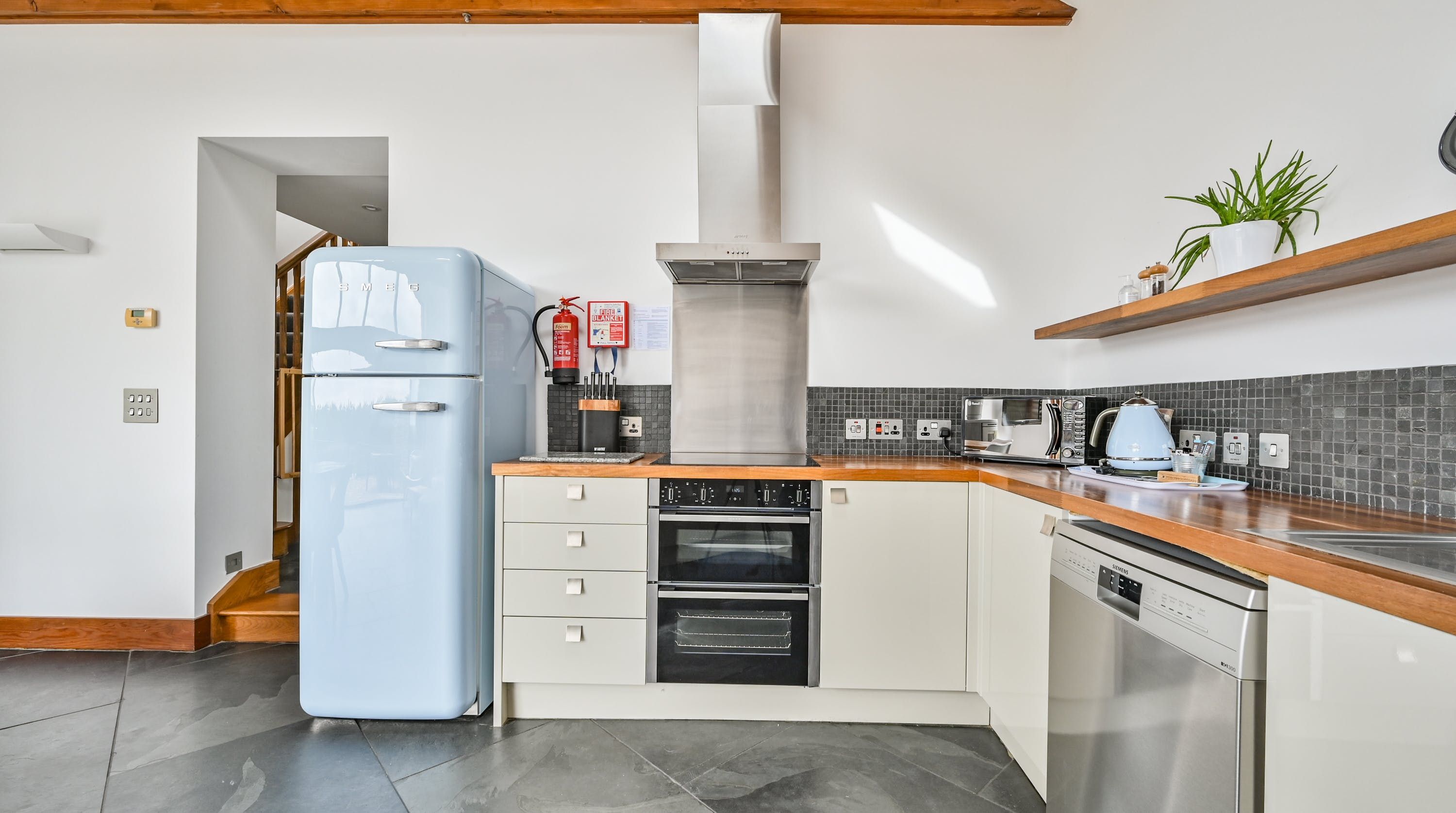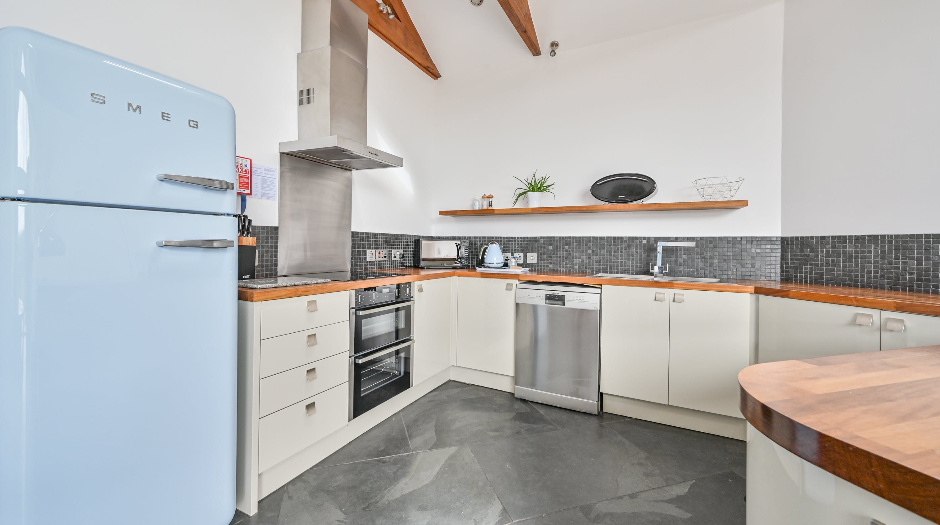 Step inside, and your eyes will instantly be drawn to the vaulted ceiling and double-height window framing the gorgeous rural views outside. On chilly evenings you can light up the wood-burning stove and get cosy with a good movie, while in the summer months, you can head outside to the patio for an alfresco meal in the sunshine.