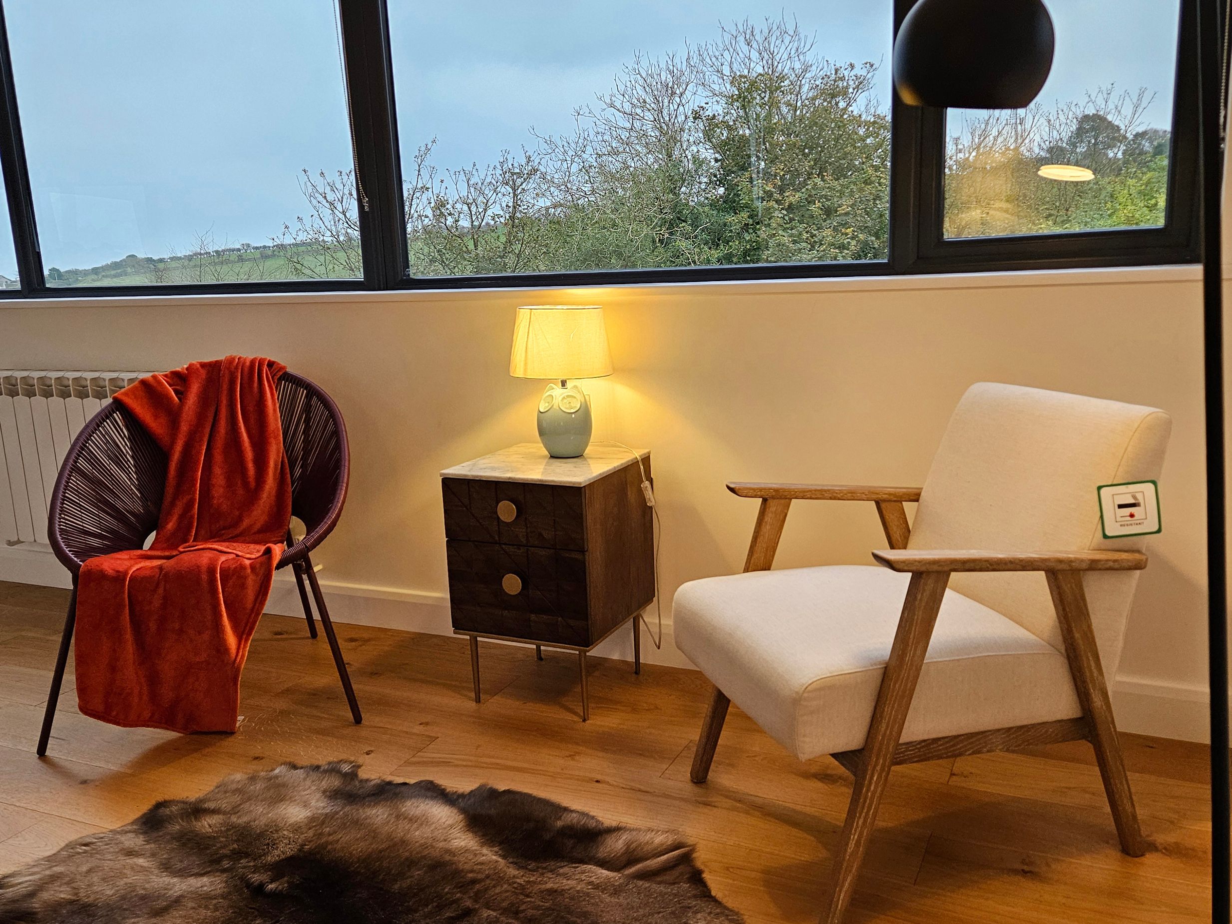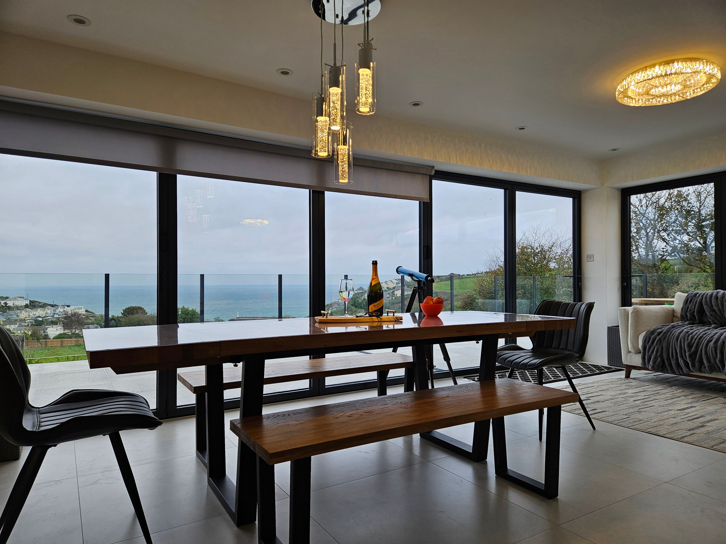 Accomodation Details Five bedrooms: 1 x super king-size with coffee station, fridge and en-suite walk-in shower, basin, heated towel rail, and WC as well as dazzling sea and valley views and Smart TV, 1 x king-size with Smart TV and en-suite walk-in shower, basin, and WC, 1 x twin with Smart TV and en-suite walk-in shower, basin, and WC, 1 x ground-floor super king-size with Smart TV, 1 x ground-floor king-size with 1 x Smart TV. Ground-floor bathroom with corner bath, shower over, basin, and WC. Open-plan living area with kitchen, dining area, and sitting area. Utility.