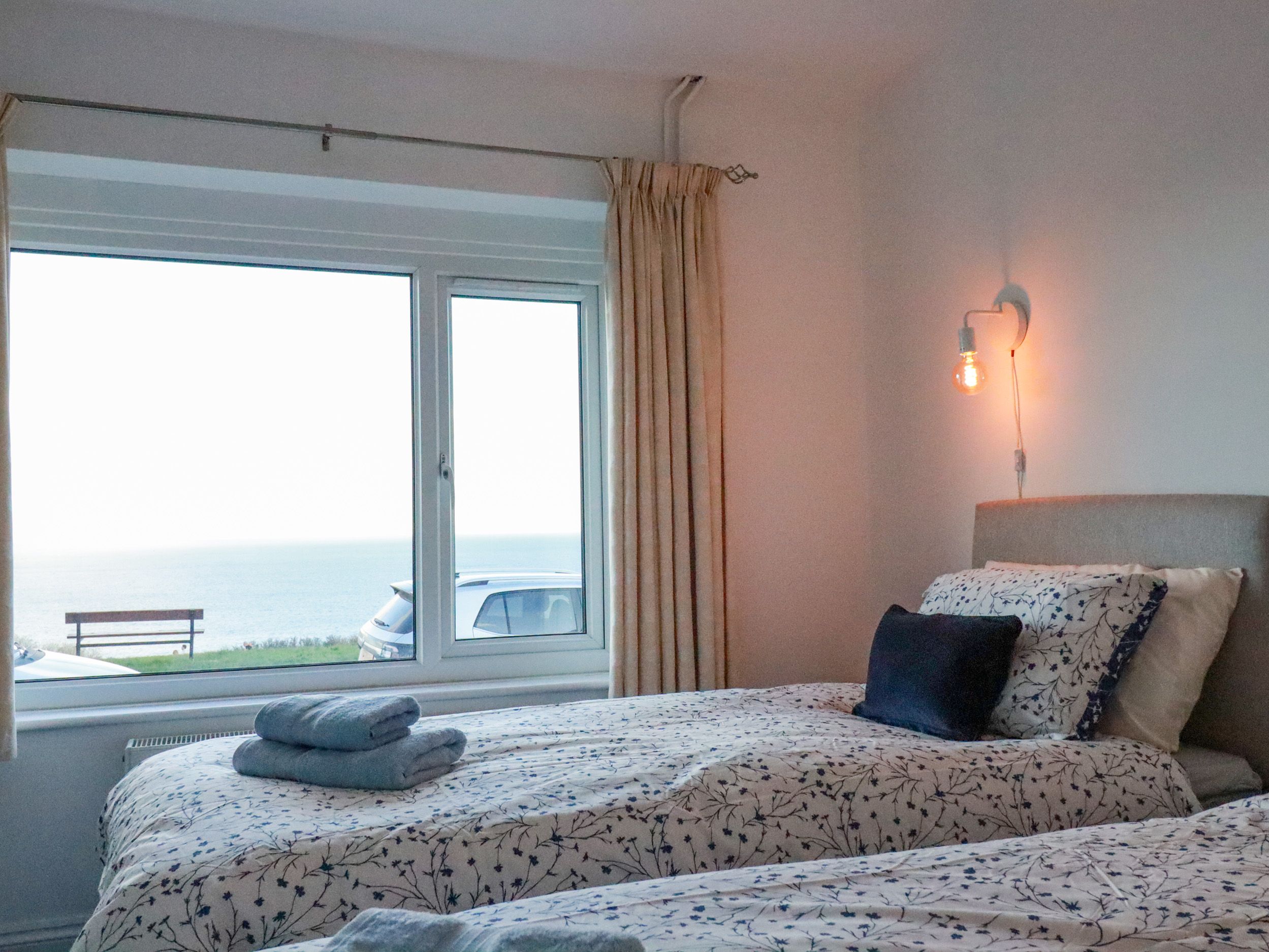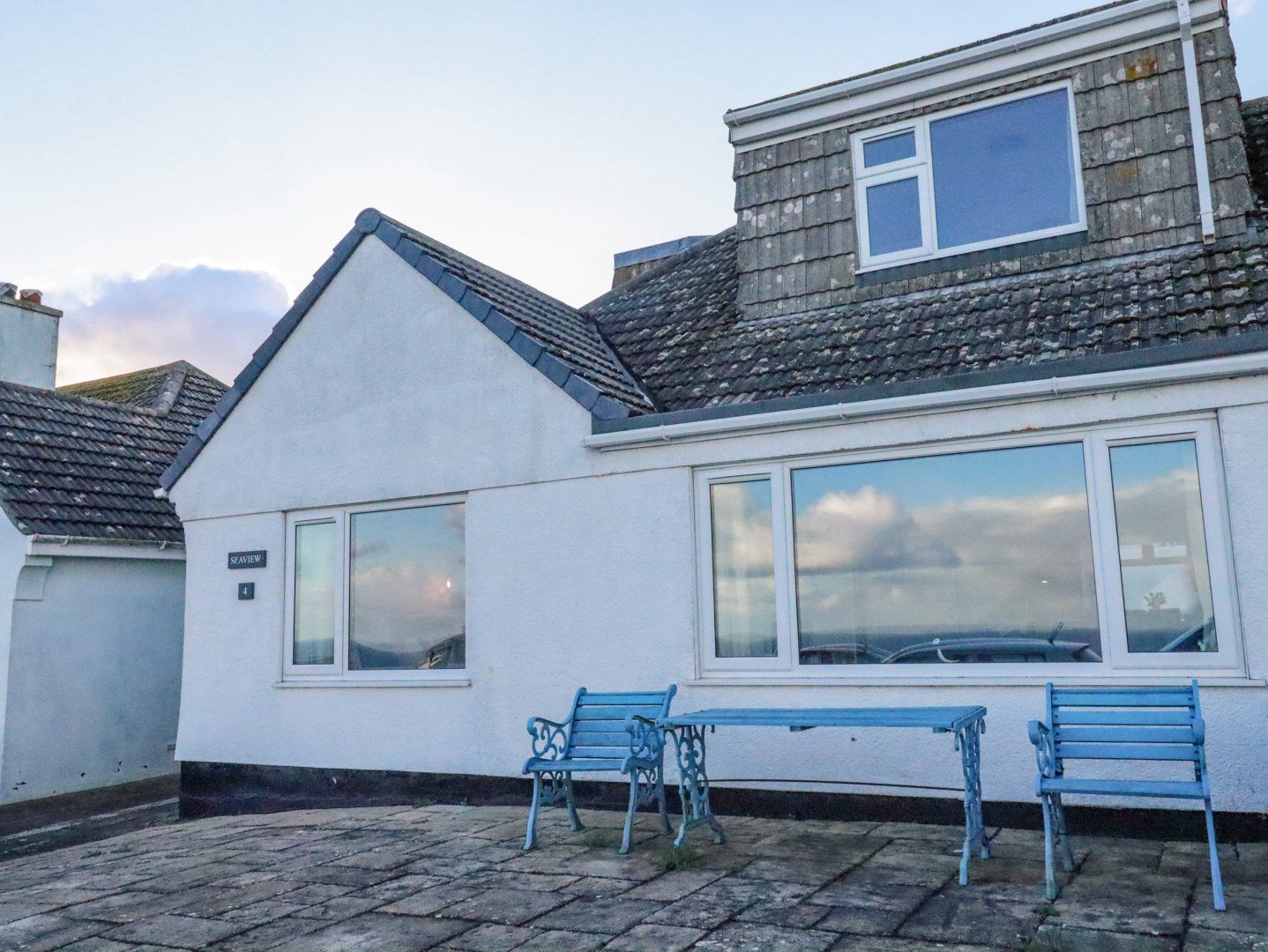 Holiday home The living areas in this property consist of an open-plan kitchen, dining area and sitting area with an electric oven and hob, microwave, fridge/freezer, washing machine, dishwasher, and TV. The bedrooms consist of a king-size with en-suite, a ground-floor twin, and a ground-floor bunk room, both serviced by a ground-floor bathroom. Outside there is an enclosed rear patio with furniture, and ample roadside parking. Two well-behaved dogs welcomed, but sorry, no smoking. You'll find a shop in 0.4 miles, a pub in 0.3 miles, and the beach in 0.2 miles. WiFi, fuel, power, bed linen and towels are all included in the price. Highchair and travel cot available. Sea View is well-positioned to enjoy a seascape to Cornwall. Note: There is a communal children's play area on the green opposite the property.