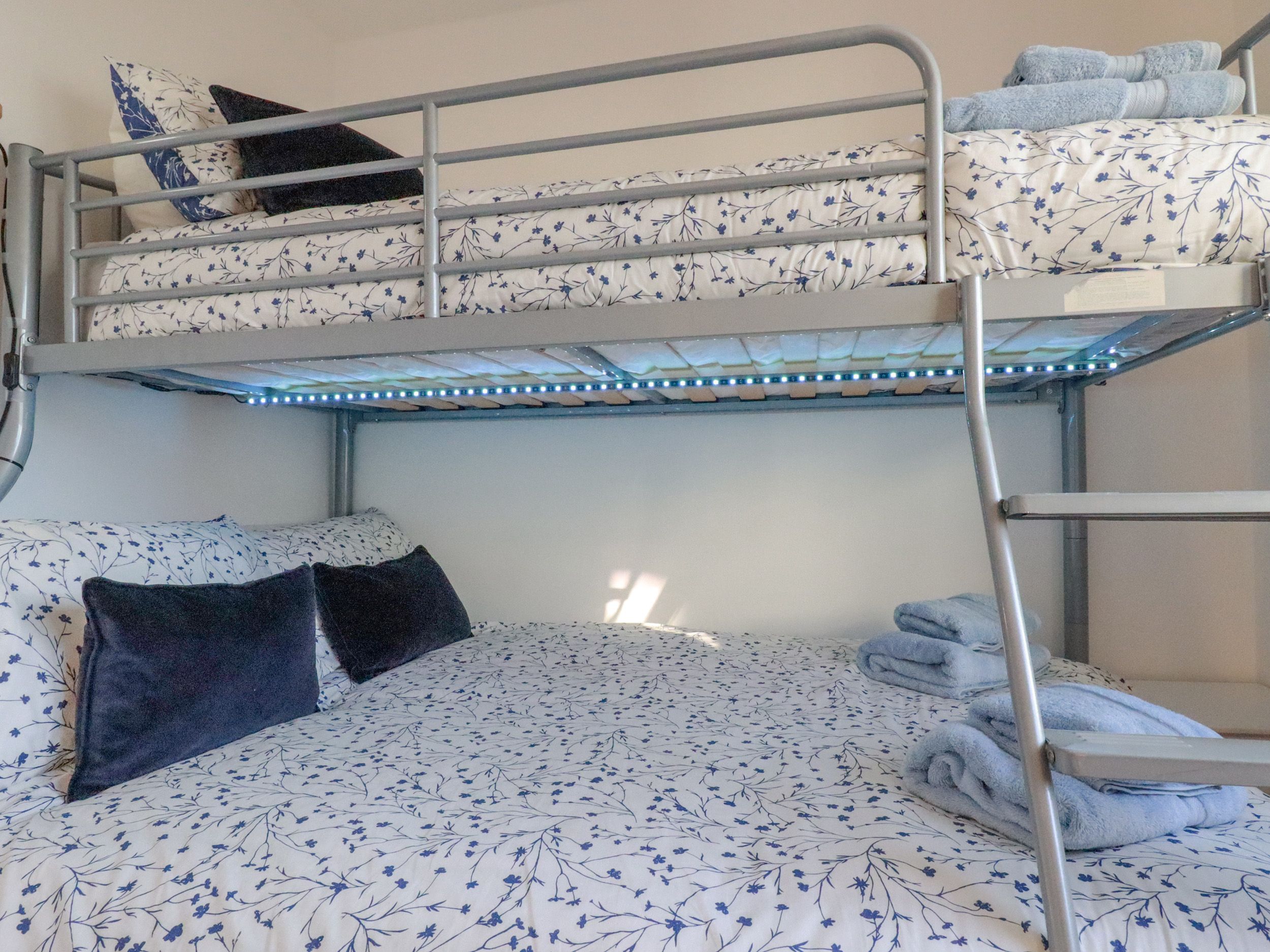 Accomodation Details Three bedrooms: 1 x king-size with en-suite bathroom with bath, handheld shower, walk-in shower, basin, and WC, 1 x ground-floor twin, 1 x ground-floor bunk. Ground-floor bathroom with bath, shower over, basin, and WC. Open-plan living space with kitchen, dining area and sitting area