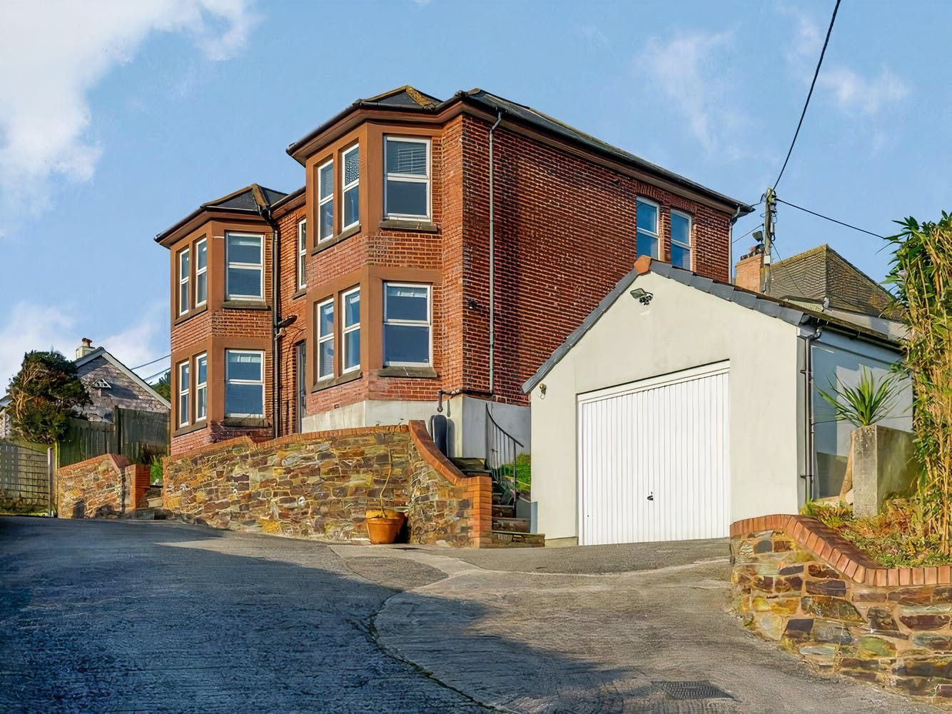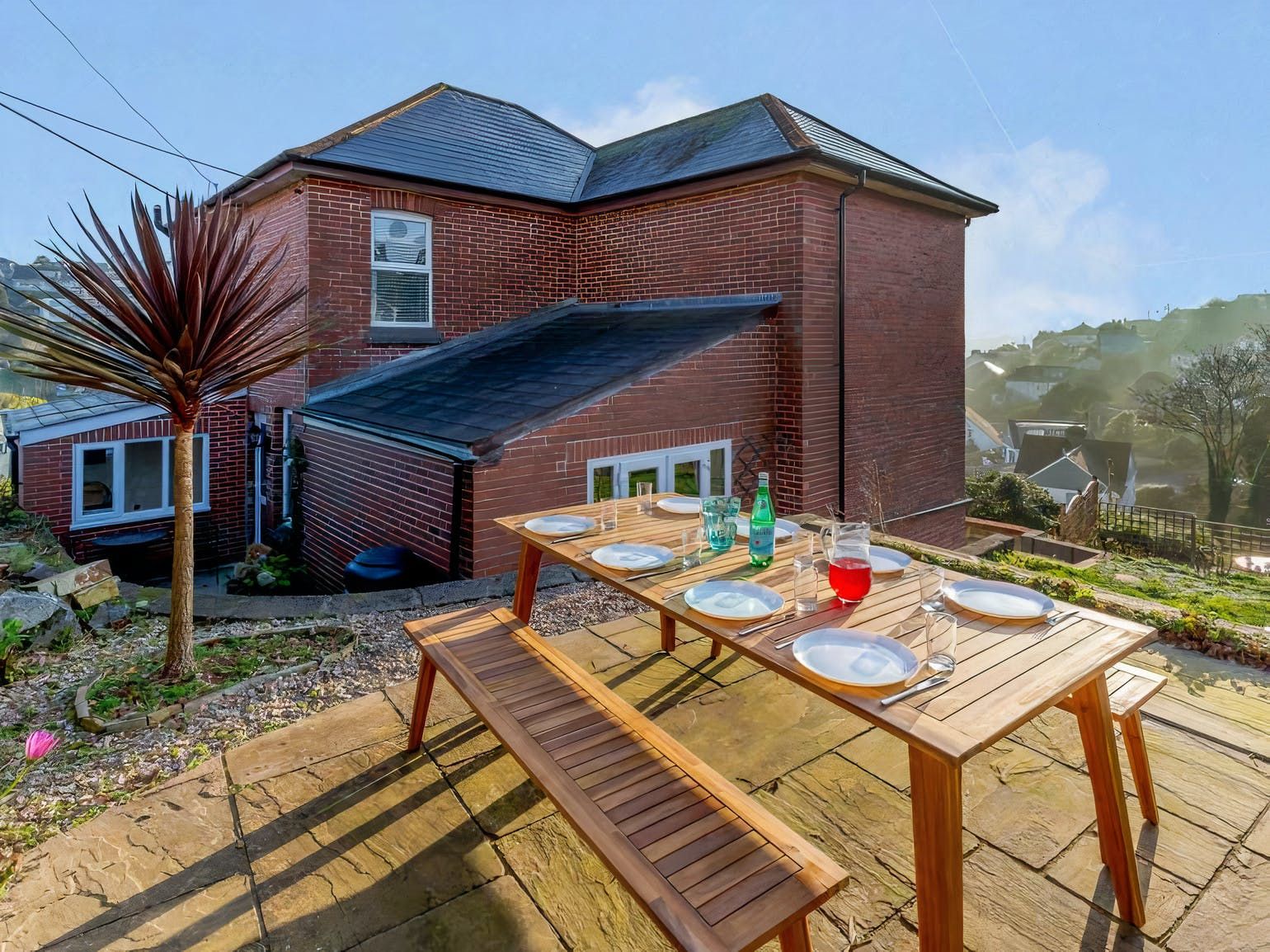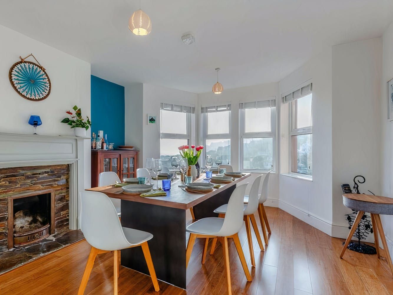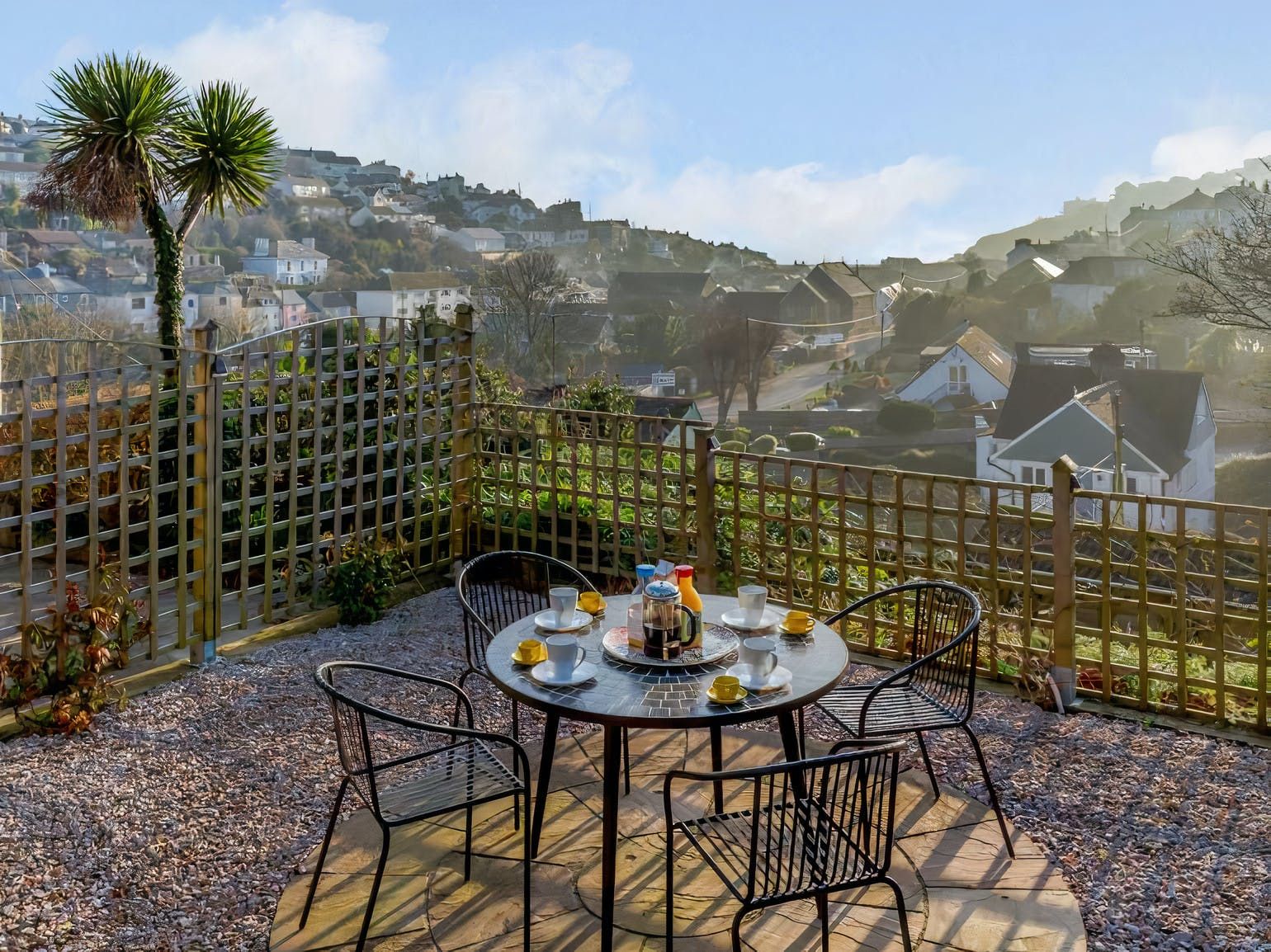 Perched just above the quaint fishing village of Mevagissey and the sparkling English Channel, this Edwardian home treats guests to gorgeous views of the landscape through the large bay windows — not to mention from the tables on the terraces.