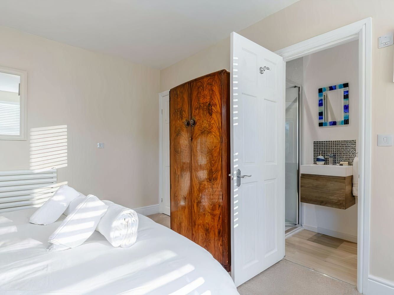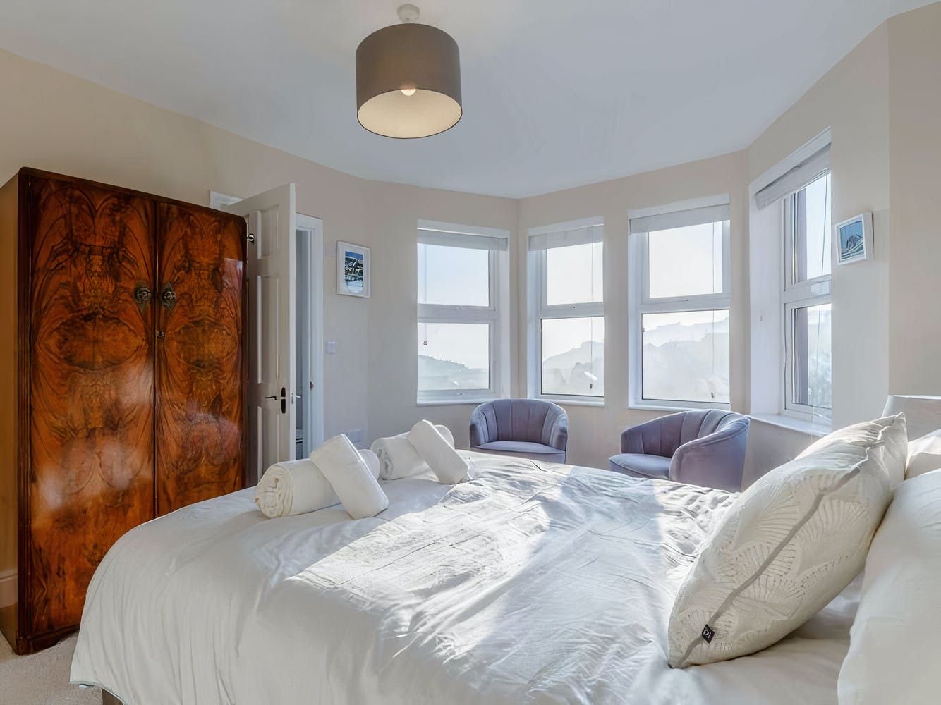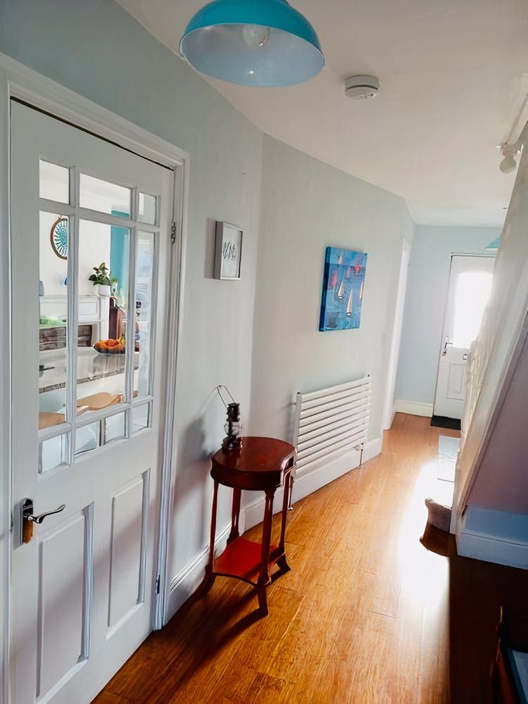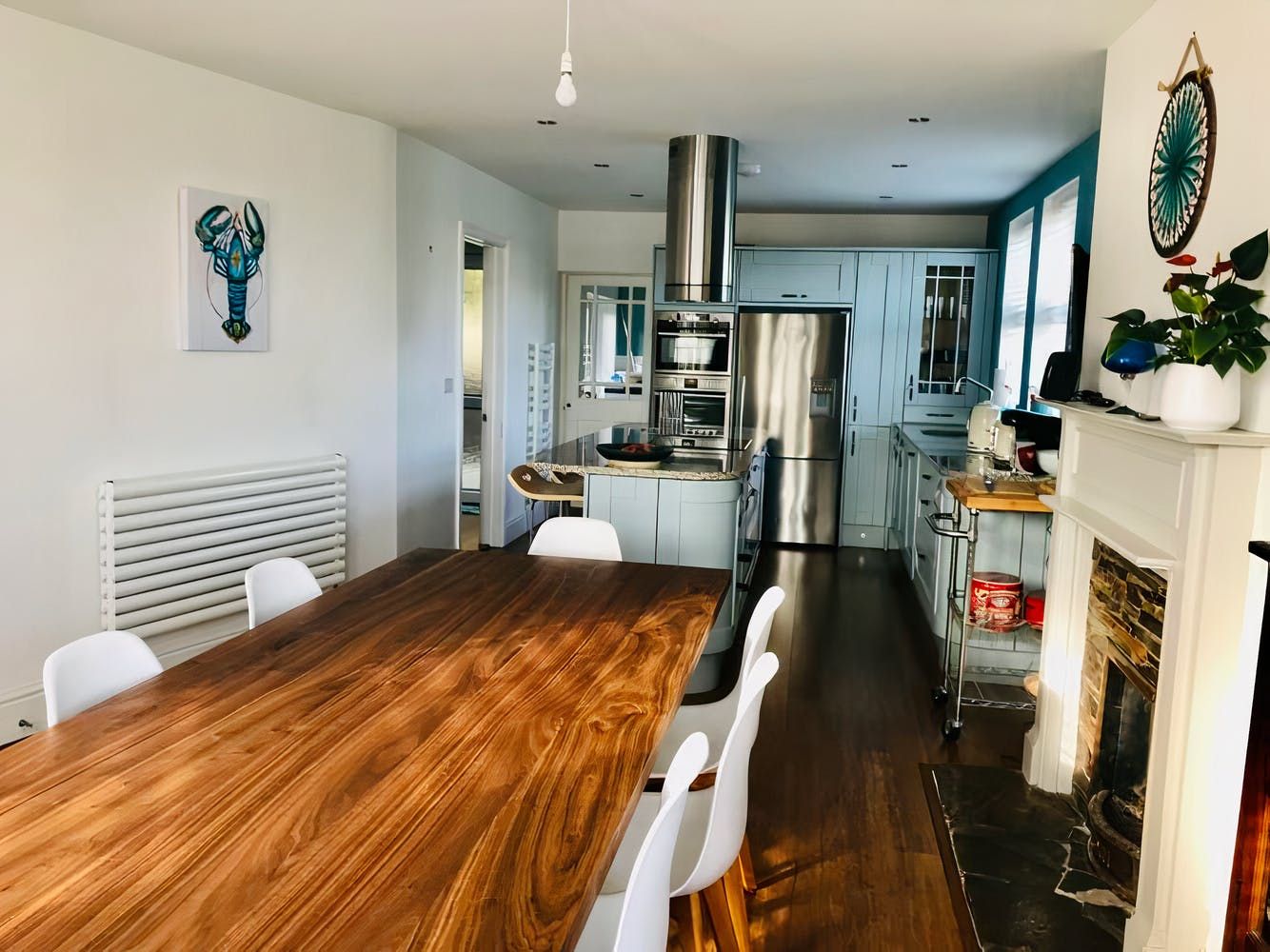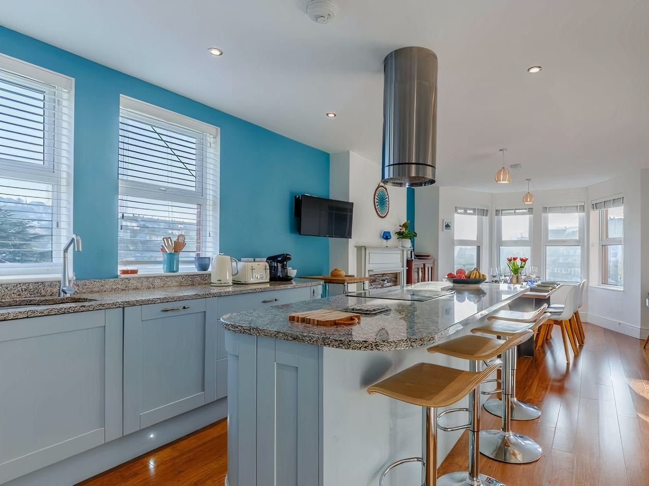 Don't be fooled into thinking that the address is nothing more than a vantage point, however. Despite the property's history, the design is contemporary in flavour, with pieces from local Cornish artists adorning some walls and boldly patterned wallpaper covering others. Those with musical talents will melt at the sight of the walnut Art Deco piano in the hallway, while the sleek kitchen is a thing of beauty as well, particularly with the spaceship-esque extractor fan and chic breakfast bar seating.