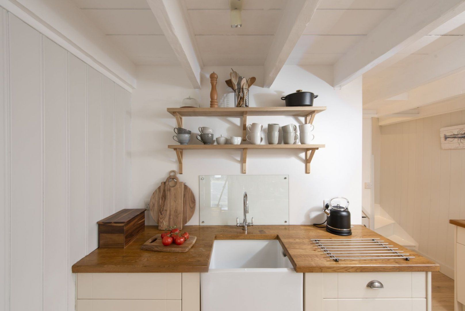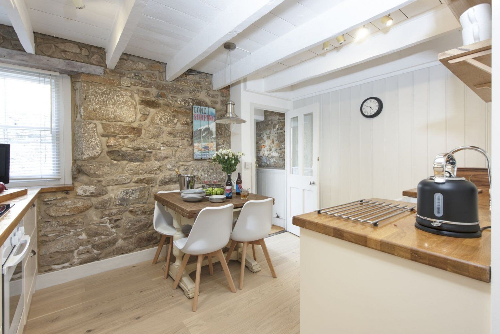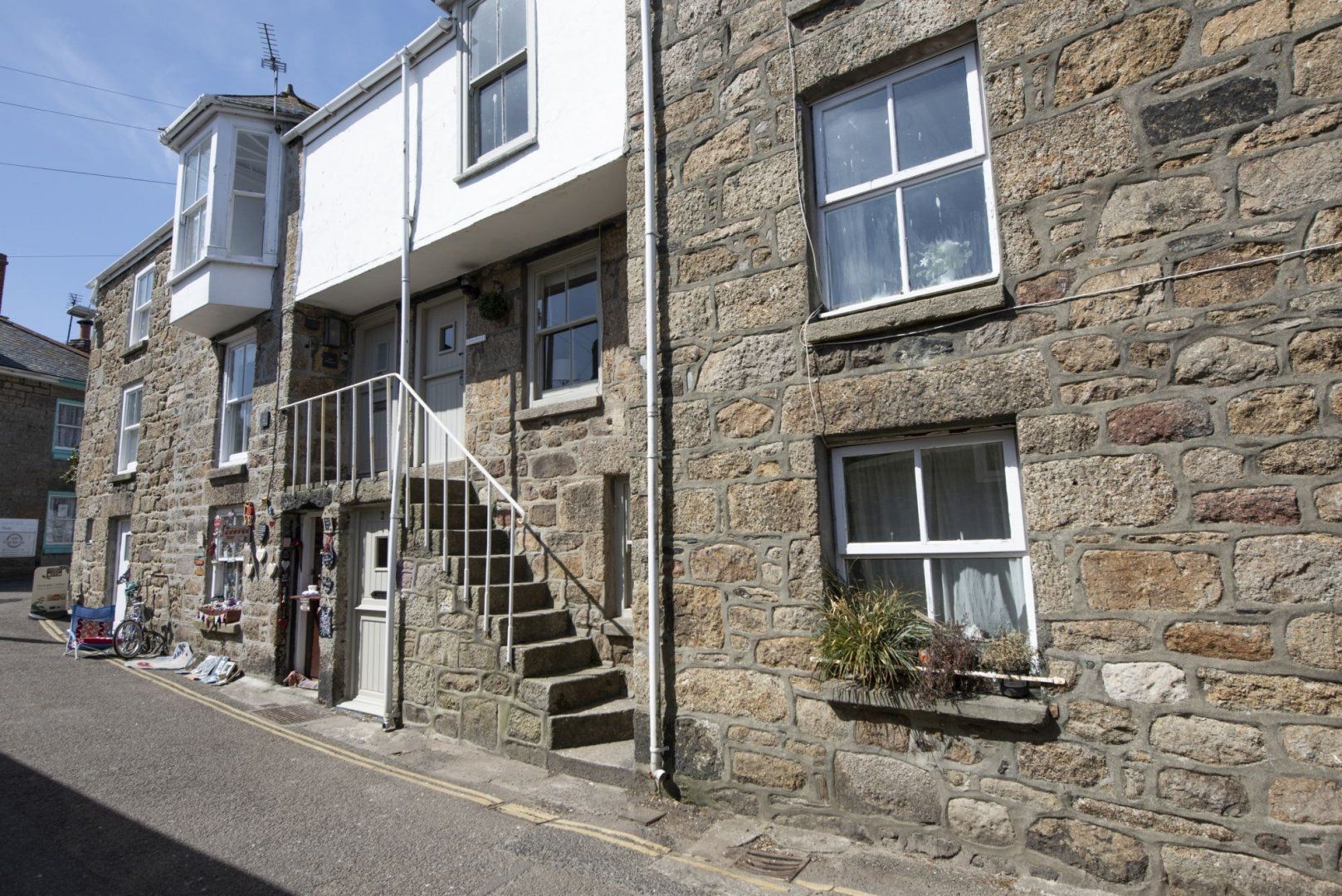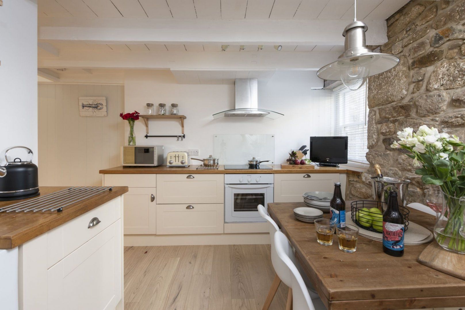 A short walk from the pretty harbour, this home couldn't be more typical of Mousehole if it tried. Once declared 'the loveliest village in England' by Dylan Thomas, 'Mowzul' is an ever-popular place to visit with narrow streets lined with historic cottages. Set over three floors, this former fisherman's loft is Grade II listed and has just the right balance of character features and modern, coastal-inspired styling. On the ground floor, a modern, eat-in kitchen provides everything you'll need for cooking at home, while the comfortable living room upstairs has the home's main entrance, an electric fire and a charming window seat. The top floor bedrooms are pretty special and we particularly love the vaulted ceilings and clever internal porthole windows. From the master bedroom, you can even see across to St Clement's Isle and beyond – what could be better? Stroll to the nearby, shops, cafes and restaurants or drive to Lamorna Cove (ten minutes) or Penzance (fifteen minutes).