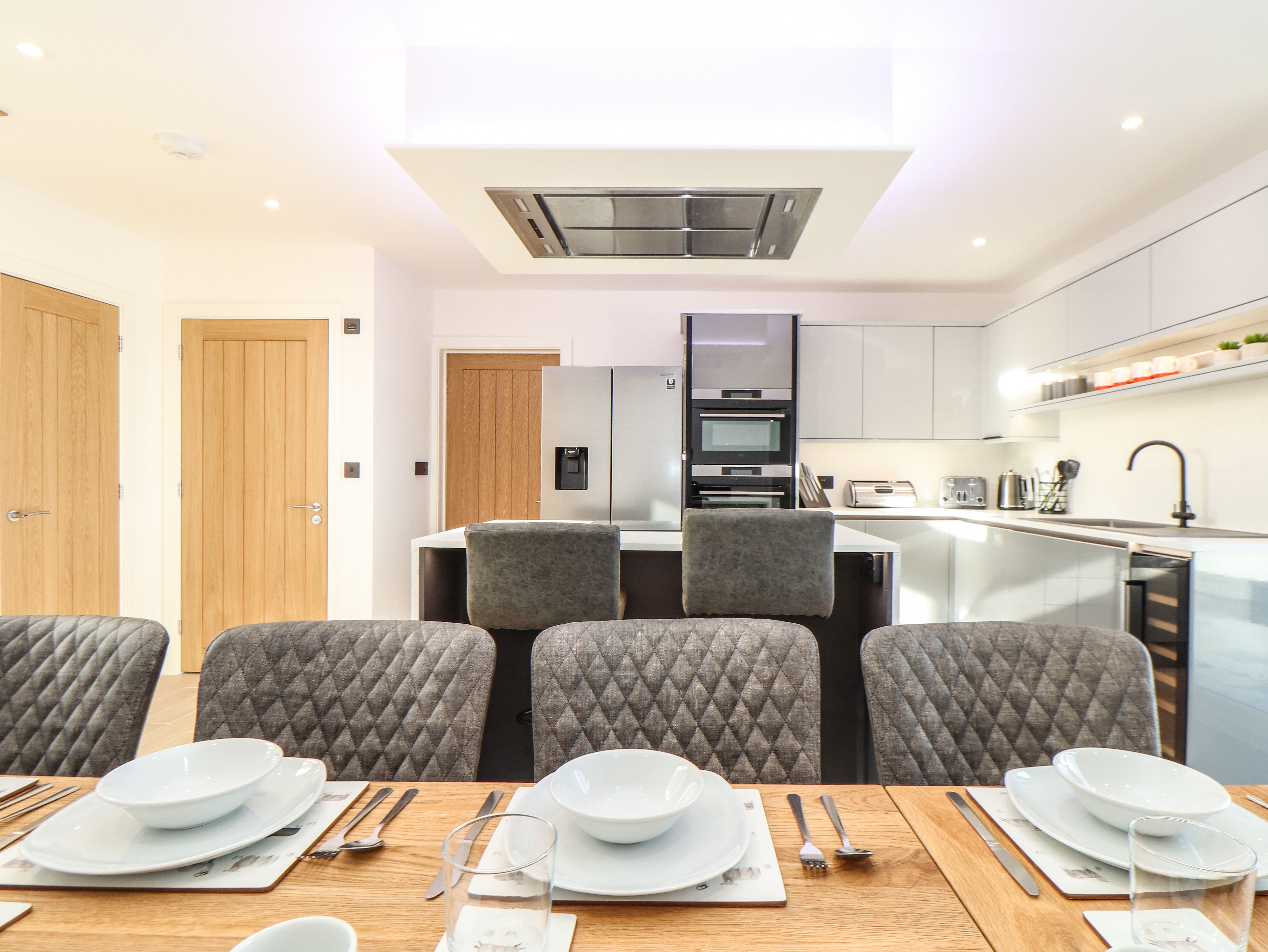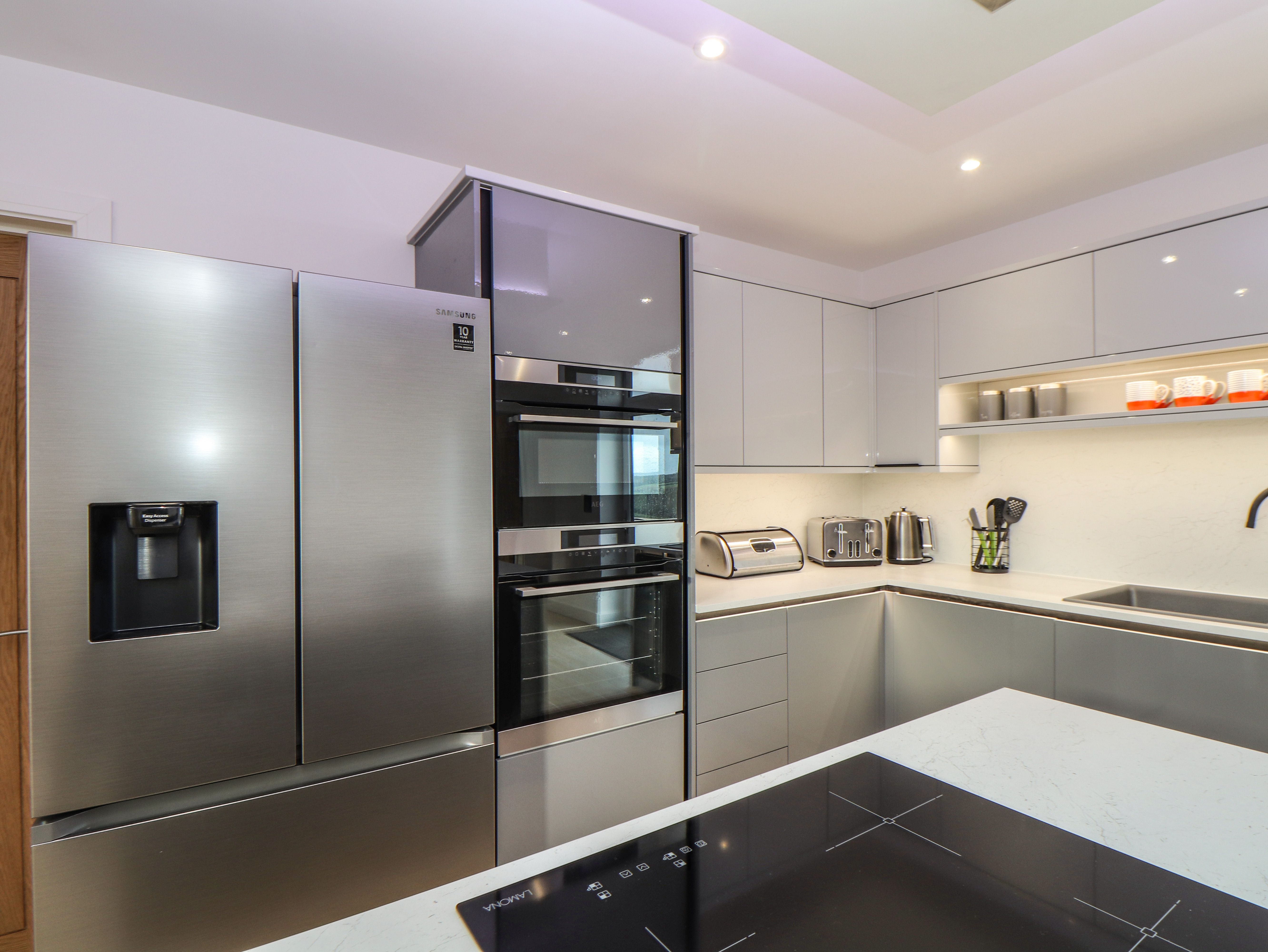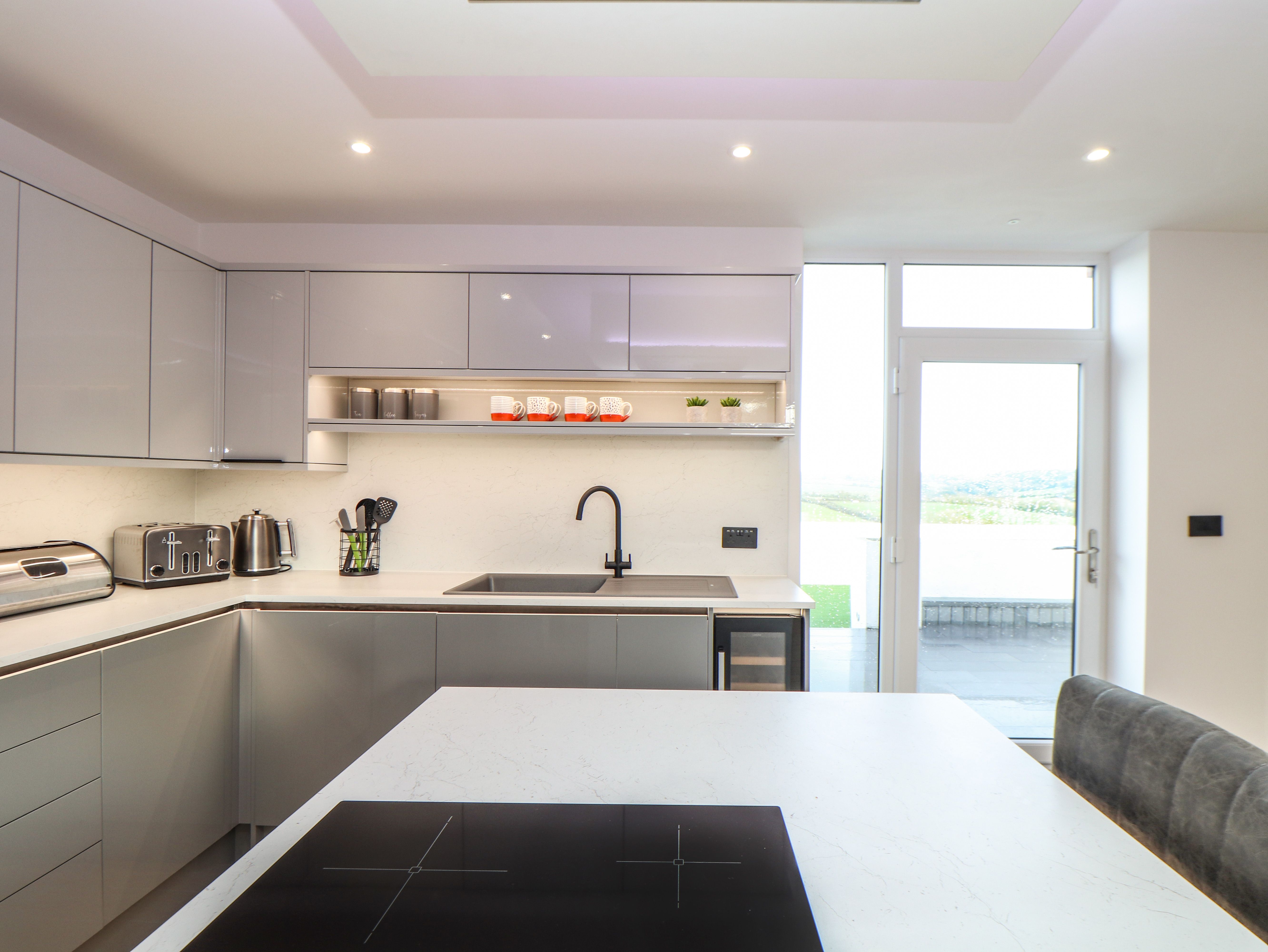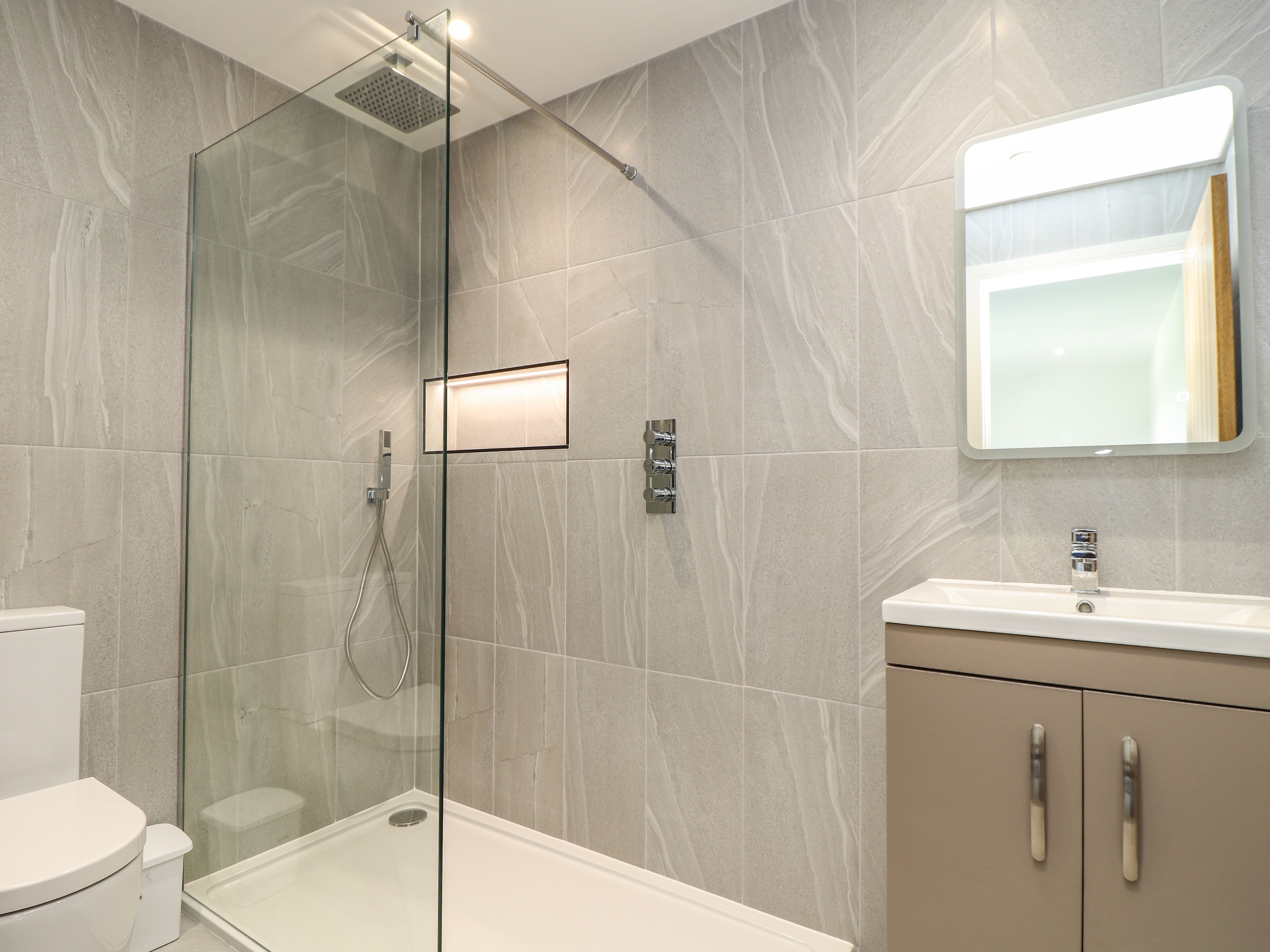 Accomodation Details Four bedrooms: 1 x super king bed with Smart TV and en-suite bath, walk-in shower, hand-held shower, basin, heated towel rail and WC with a TV, 2 x super king (zip/link, can be twin on request) with Smart TV and walk-in shower, basin and WC, 1 x ground-floor king size bedroom with Smart TV and en-suite walk-in shower, basin and WC. Cloakroom/utility with basin and WC. Kitchen/diner. Sitting room with wood burning stove. External shared games room. External shared table tennis room. Shared summerhouse