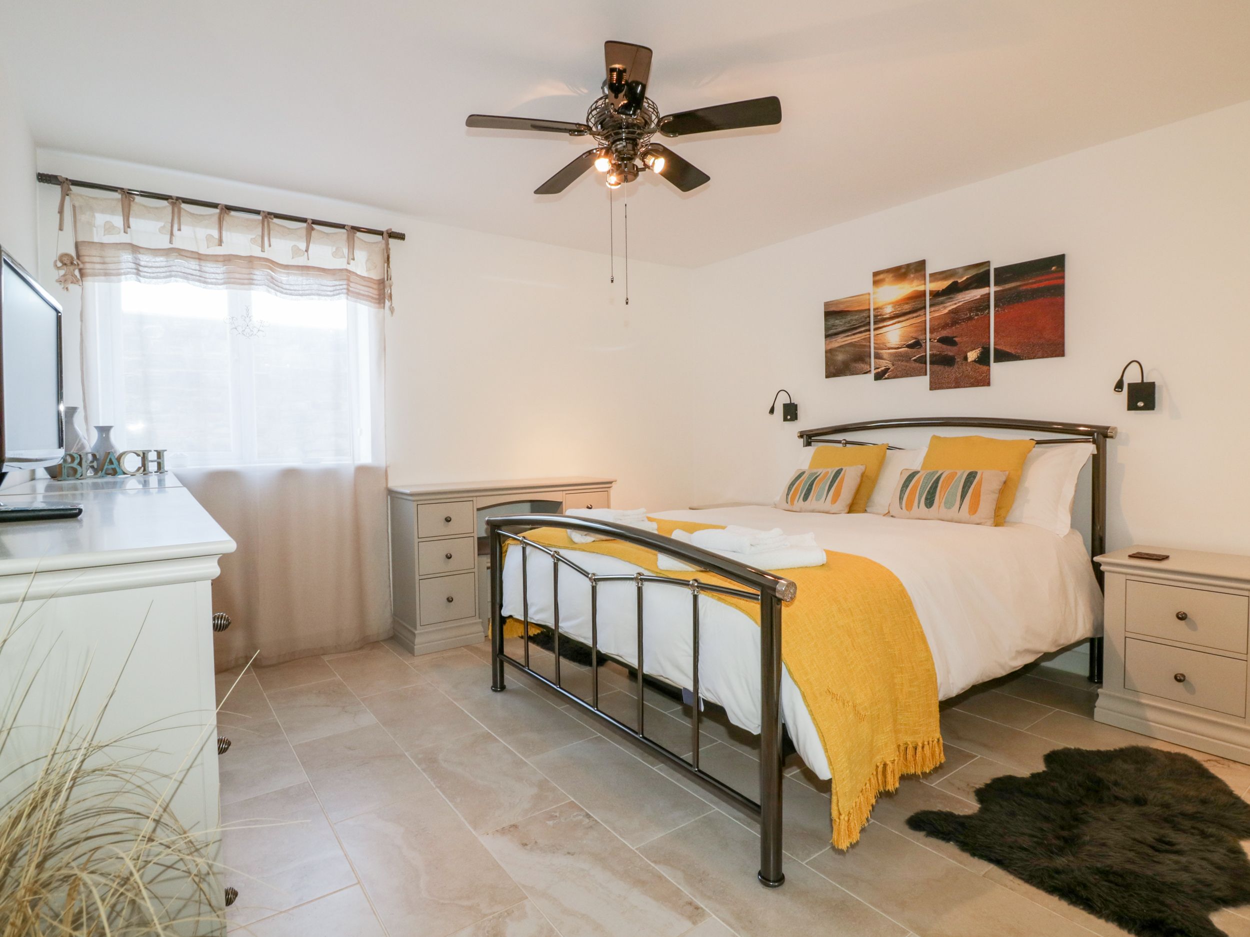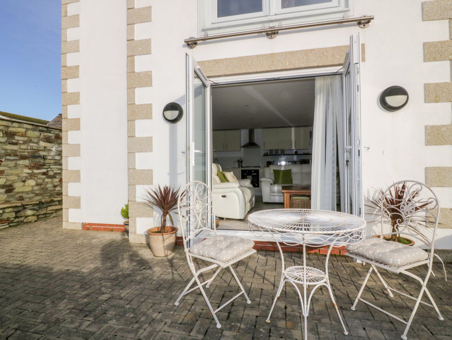 Holiday home 3 Spyrys Heyl is a delightful apartment situated on the outskirts of Newquay, in Cornwall. Set all on the ground floor, the property hosts one king-size bedroom with a TV, supported by a shower room with a 'rain forest' shower. There is an open-plan living room with a kitchen, dining area and sitting area. Outside there is a south-facing patio terrace with furniture, as well as private parking for one car. 3 Spyrys Heyl is an excellent base for couples looking to explore Newquay. 55 inch Smart TV, DVD player, CD player, a selection of DVDs and Fibre optic broadband. Fuel and power inc. in rent. Bed linen and towels inc. in rent. Storage locker for two surfboards or angling rods. and extra outside shower head also available for guests returning from the beach etc.There is also an outside shower for guests who need to shower down when returning from the beach.. Sorry, no pets and no smoking. Shop 0.6 miles and pub 0.8 miles