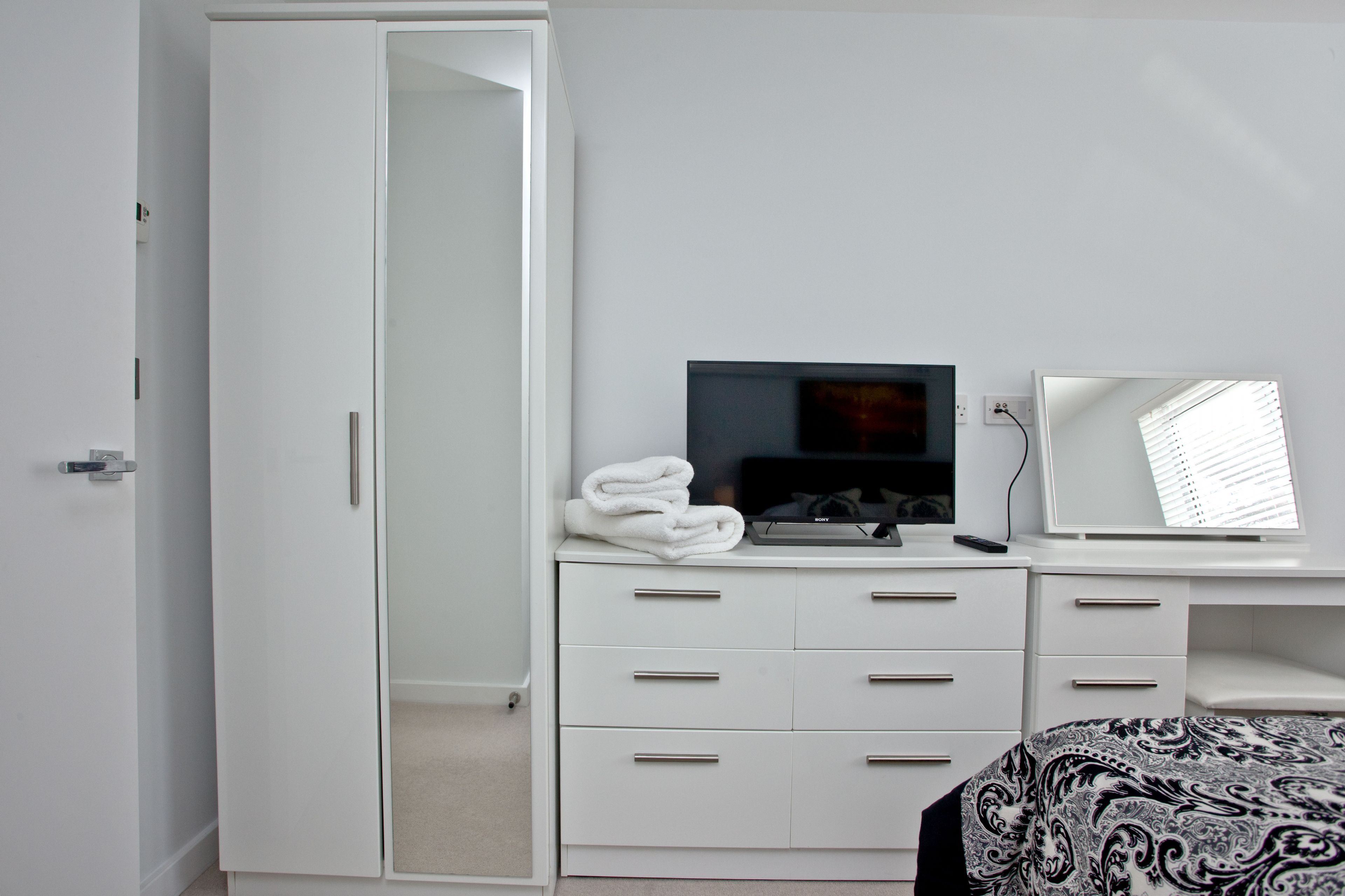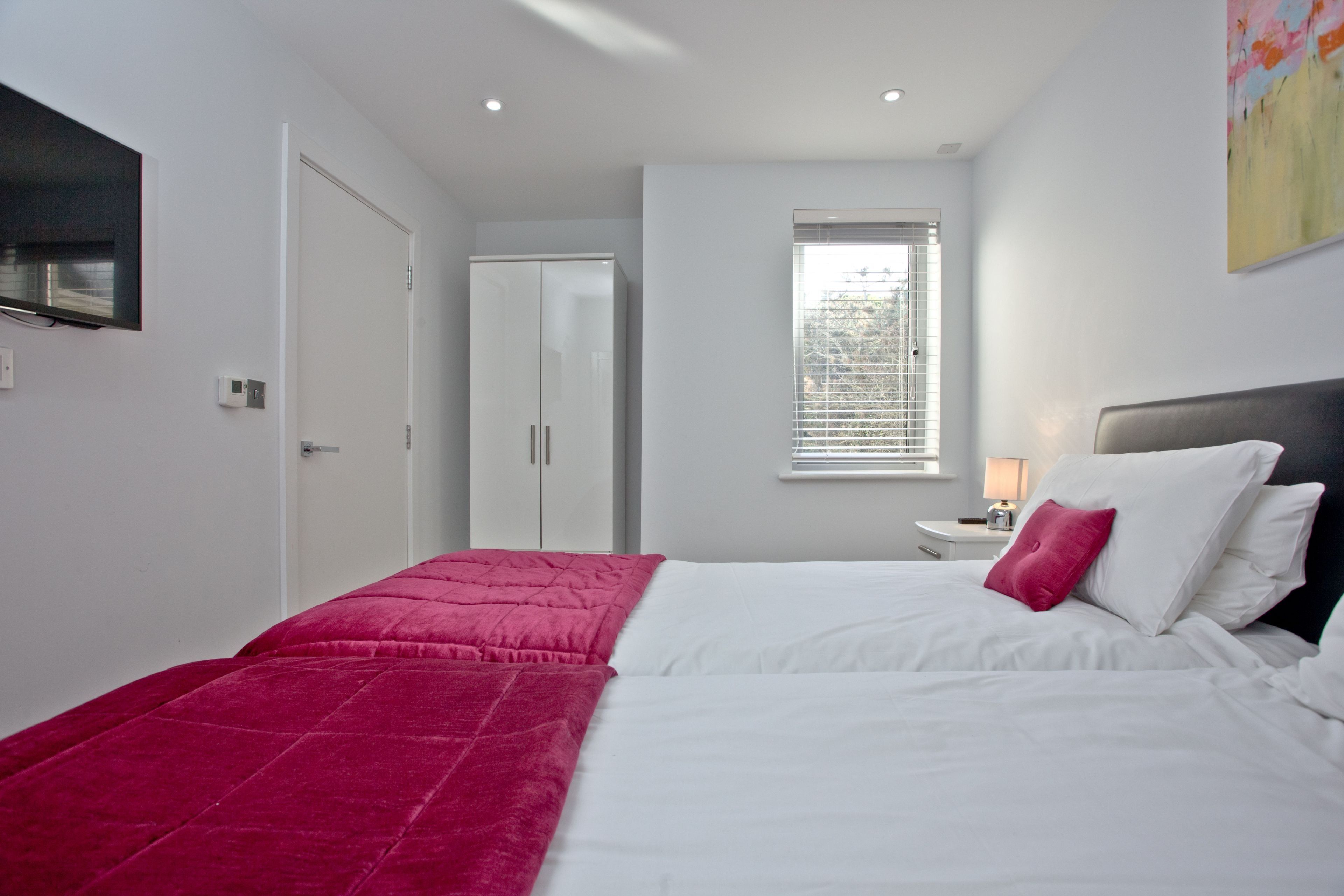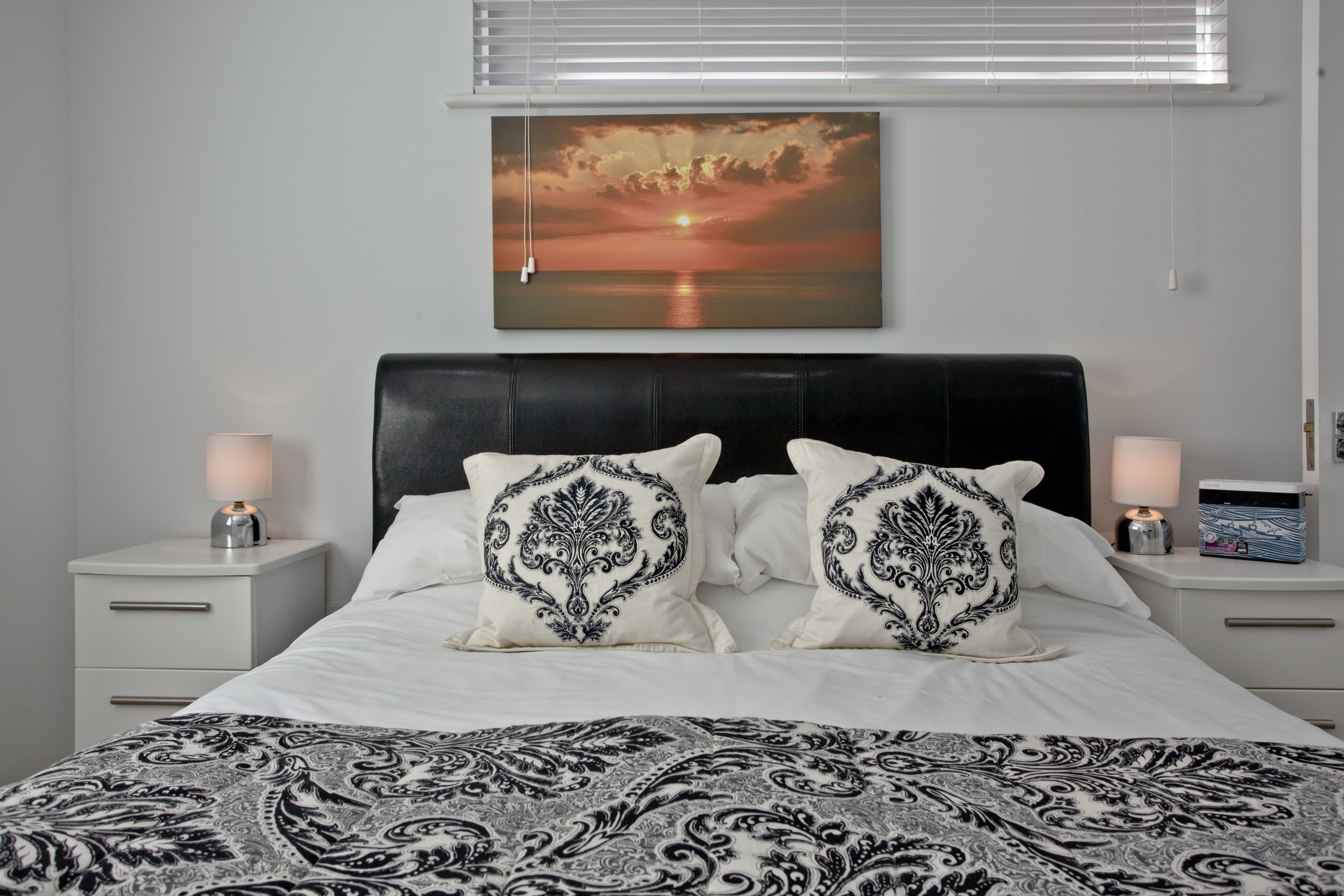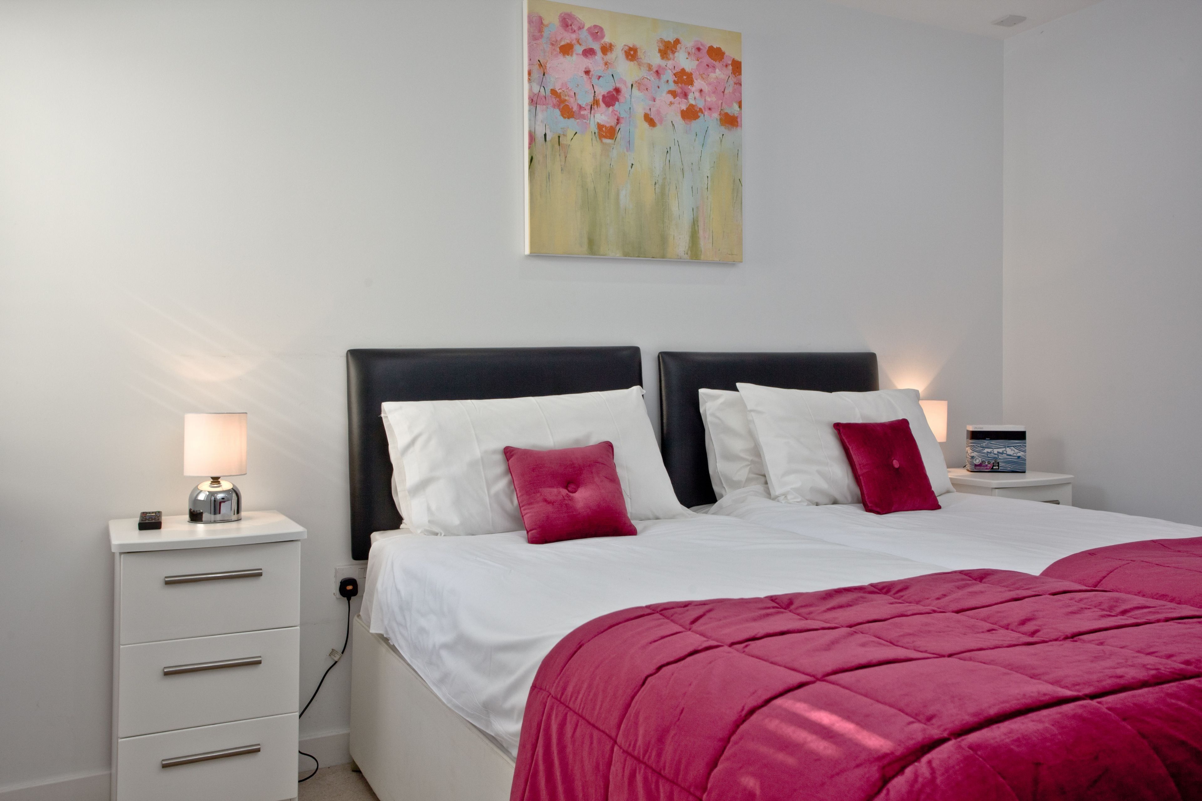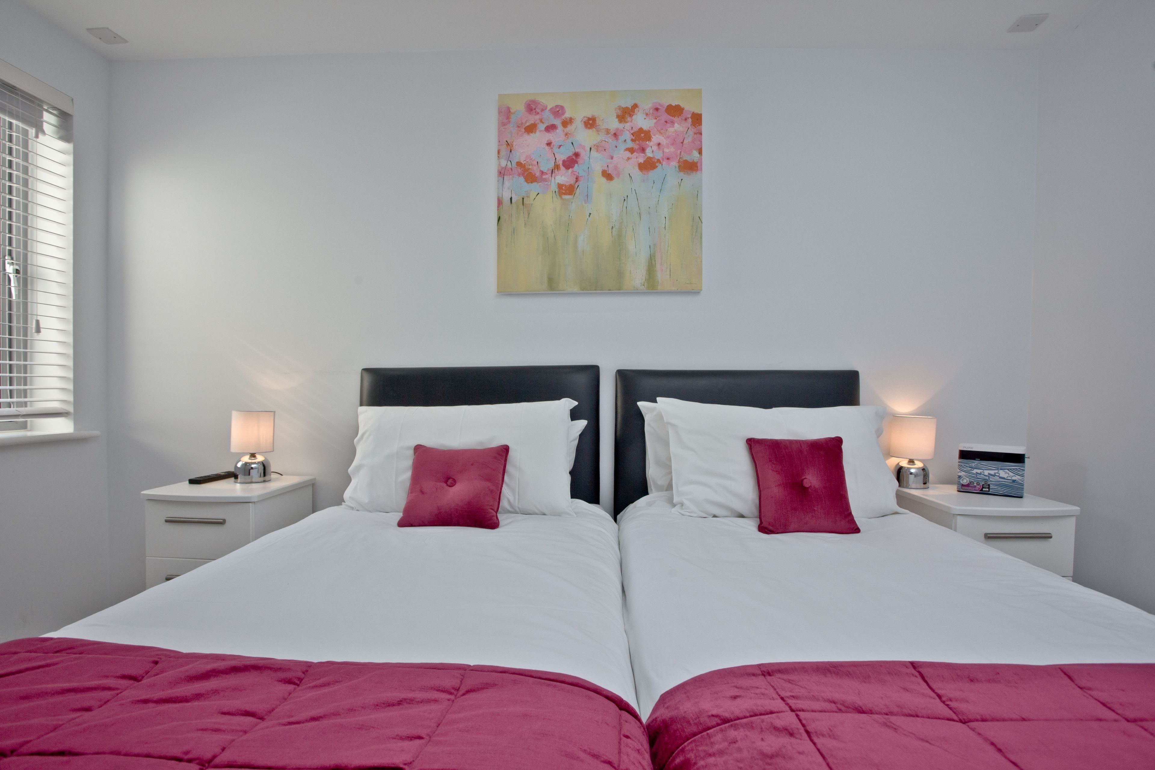 ‘Zip and link’ twin beds that can be arranged as super king size if requested at the time of booking, double wardrobe and bedside cabinets with lamps
