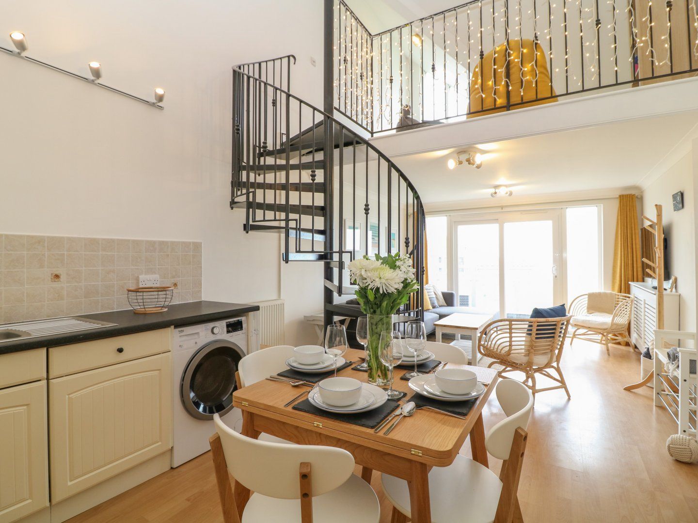 Second floor apartment. Three bedrooms; 1 x king-size with en-suite shower room with walk-in shower, basin and WC, 1 x double, 1 x twin. Bathroom with bath and shower over, basin and WC. Open-plan living room with kitchen area, dining area and sitting area. Mezzanine with seating area.