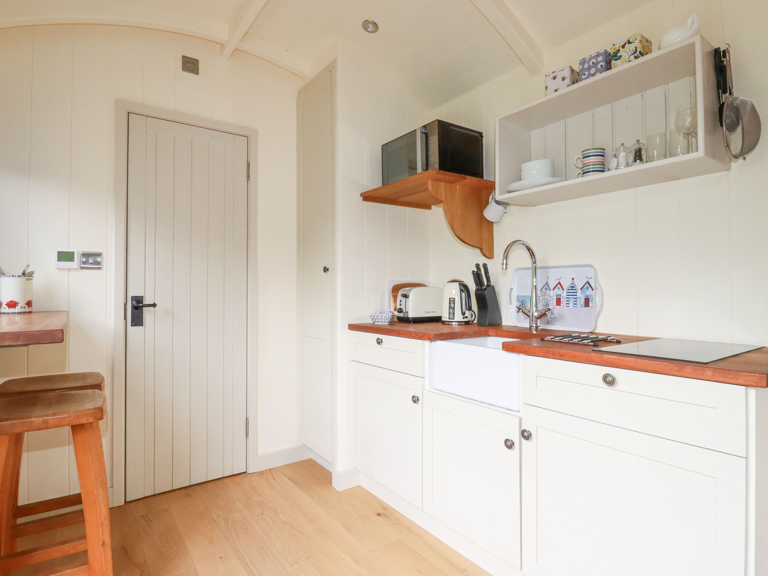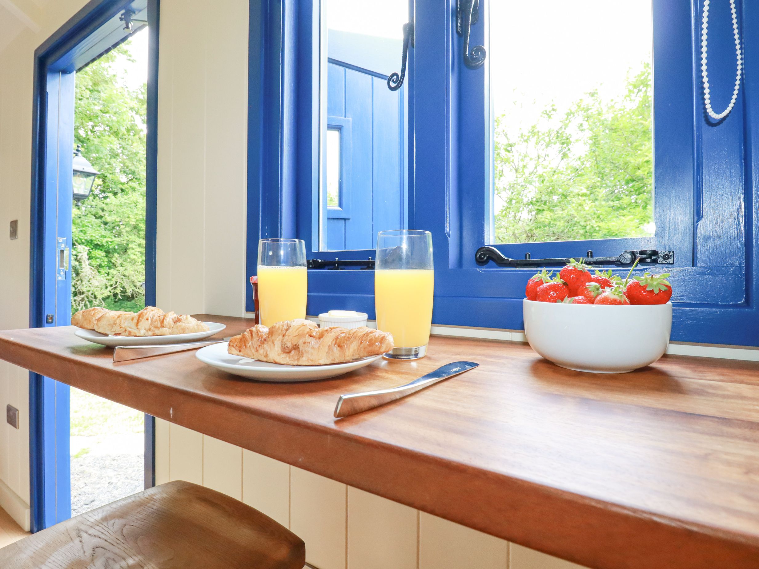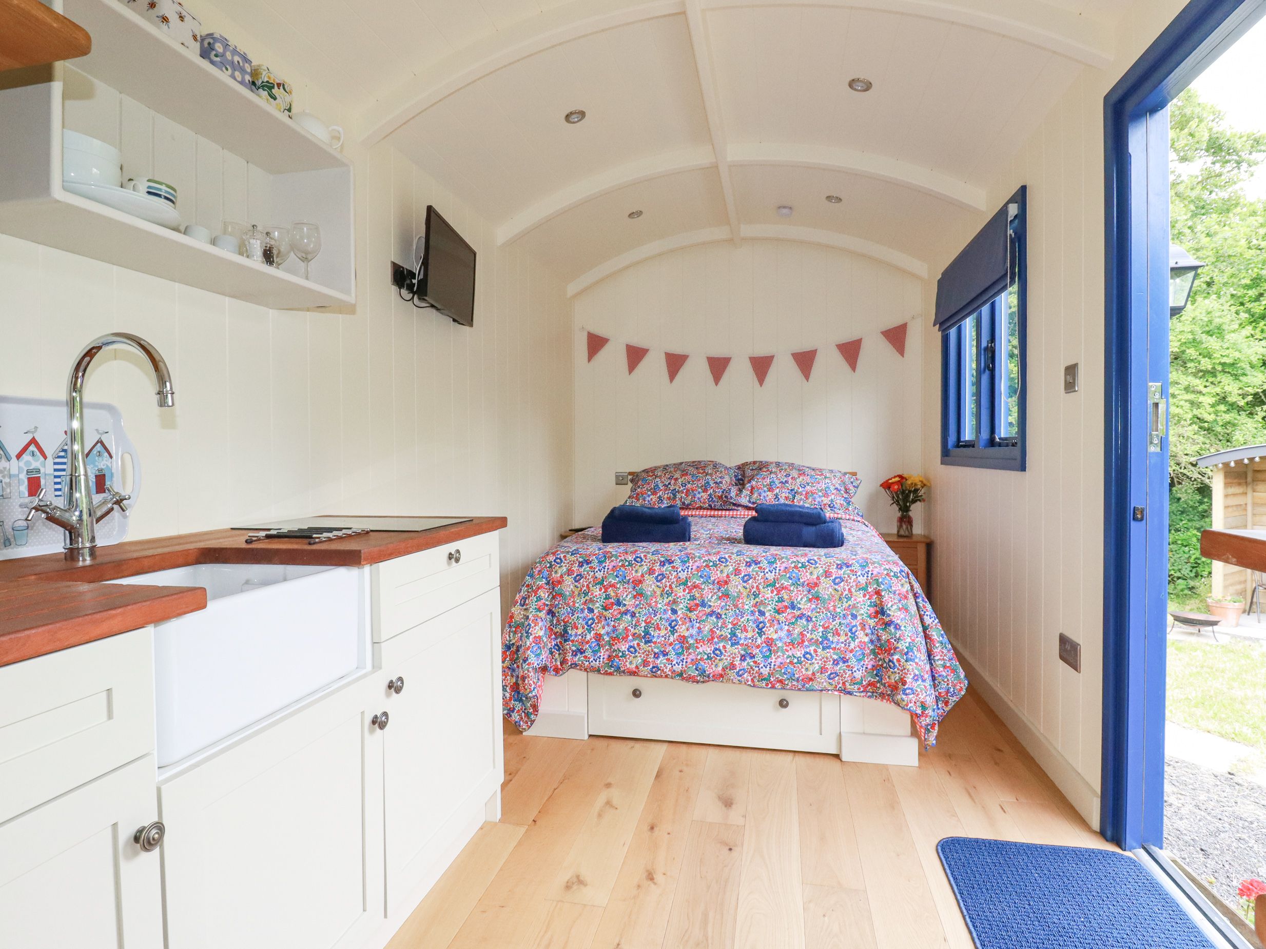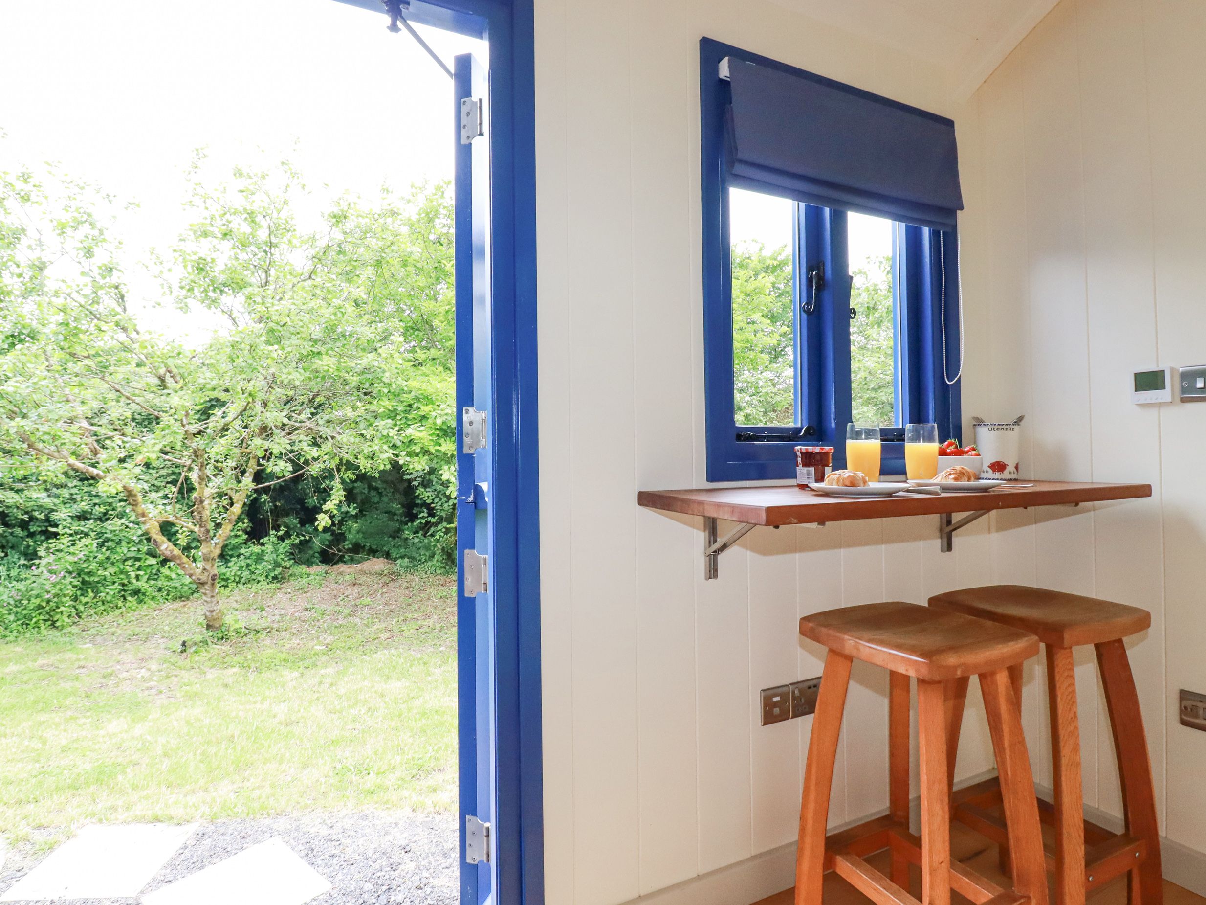Holiday home Pippin has a studio-style layout with a double bed with a TV, a kitchenette equipped with an electric hob, microwave, fridge with ice box, kettle and toaster, and a dining area. There’s a shower room with walk-in shower, basin, heated towel rail and WC. Underfloor heating, fuel and power, bed linen and towels are included in the rent. Outside there’s an enclosed woodland garden with patio, furniture and barbecue, lawned area and sun loungers. Sorry, no pets and no smoking. Shop 2.3 miles, pub 2.7 miles, beach 4.2 miles. Your romantic getaway at Pippin is just a click away. Note: There is no WiFi in this property. Note: There are steps up to the entrance. Note: There is a 150 meter walk from the parking area to the property. Note: During wetter months there's a stream running through the garden which should not affect your stay but please take care. Note: This property has a £50 Good Housekeeping Bond