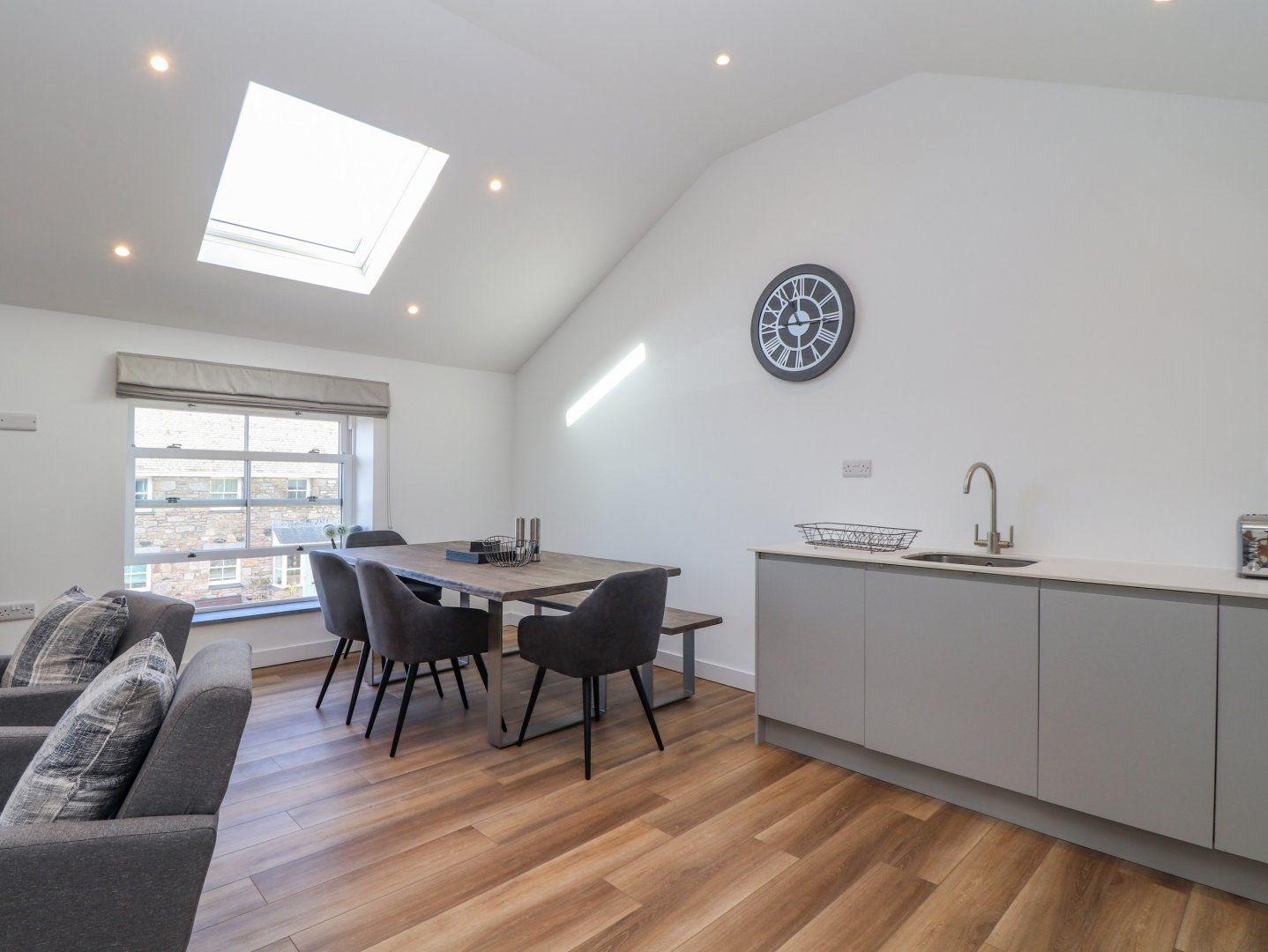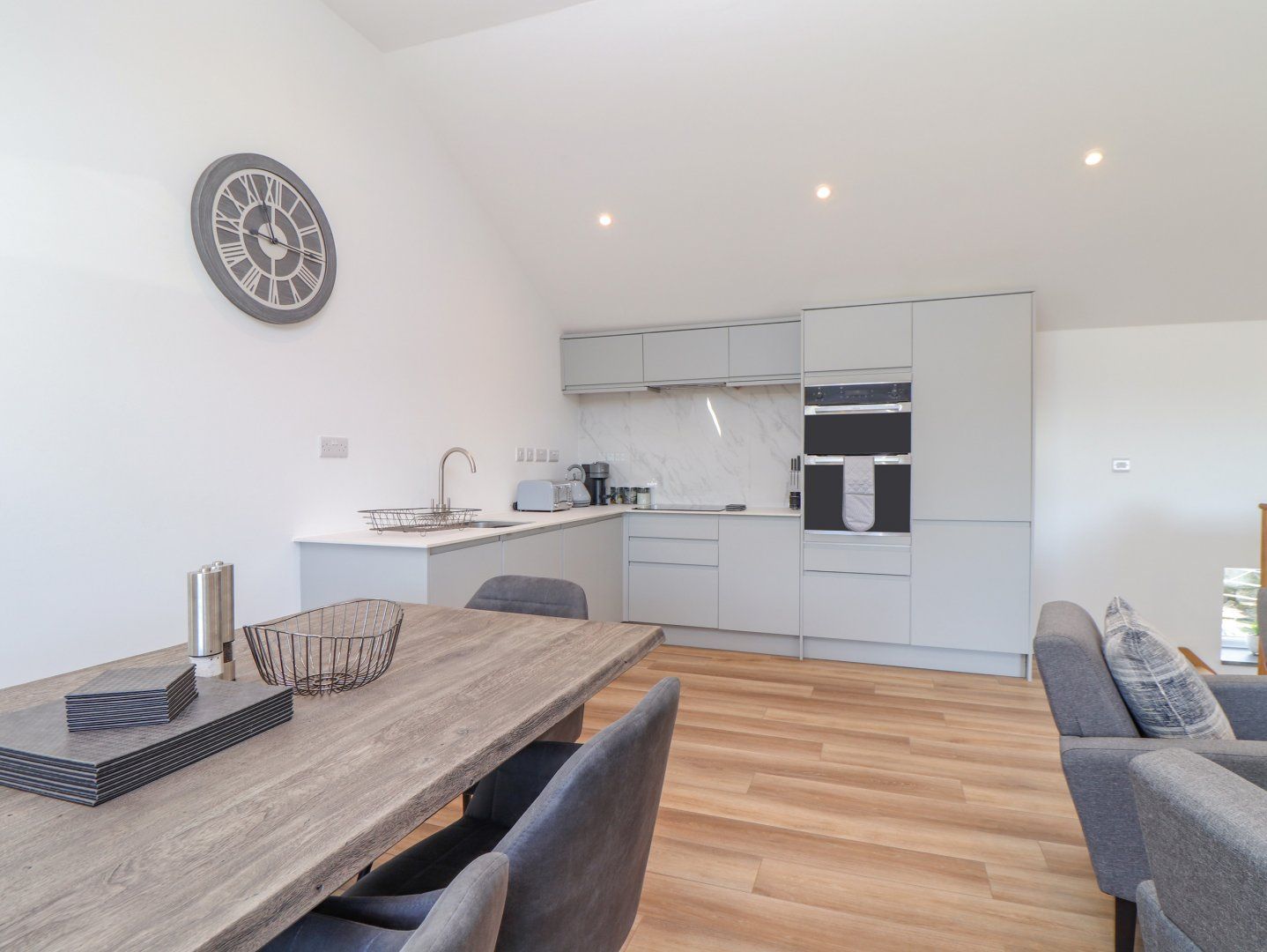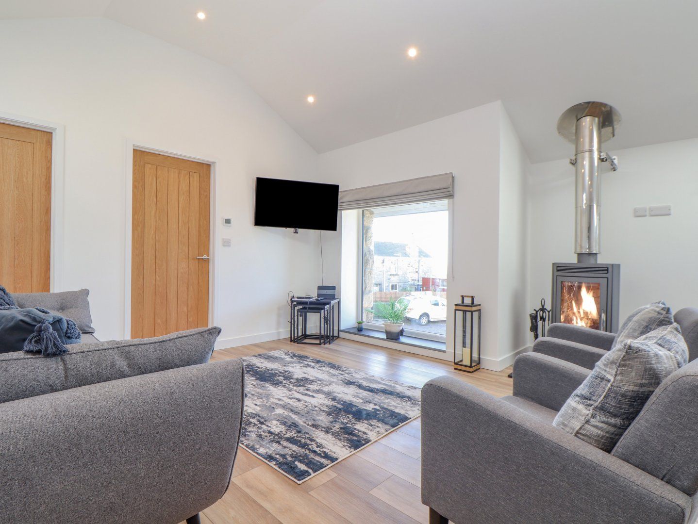 Accomodation Details Reverse-level. Three bedrooms: 2 x ground-floor super-king-size (zip/link, can be twin on request) with Smart TV and en-suite walk-in shower, basin, and WC, 1 x king-size with en-suite walk-in shower, basin and WC. First-floor cloakroom. First-floor open-plan living space with kitchen, dining area and sitting area with woodburning stove. Utility