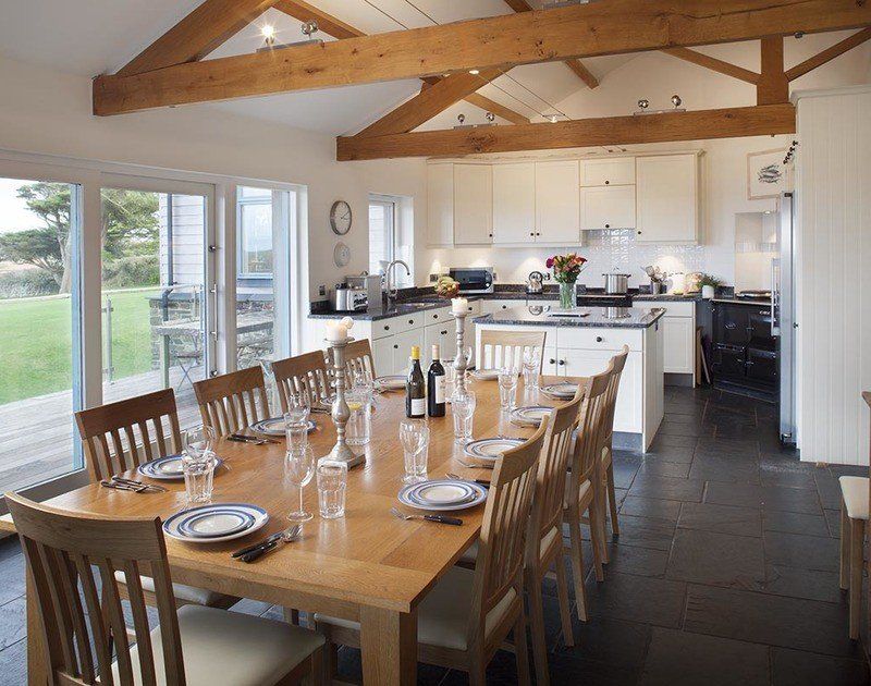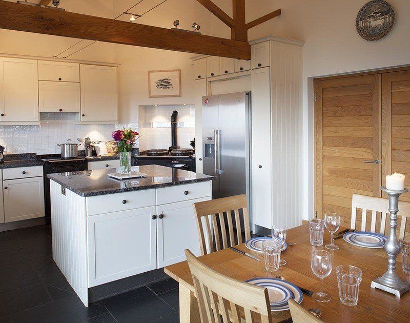 Kitchen/Dining Room with slate floor and French windows to Decking and Garden, Large open plan Sitting Room with Wood Burning Stove leading to Snug/TV Room.