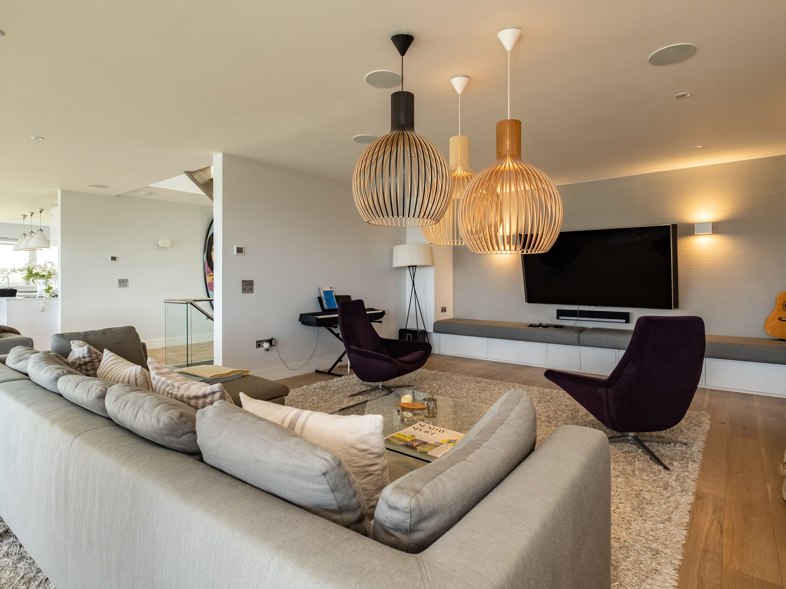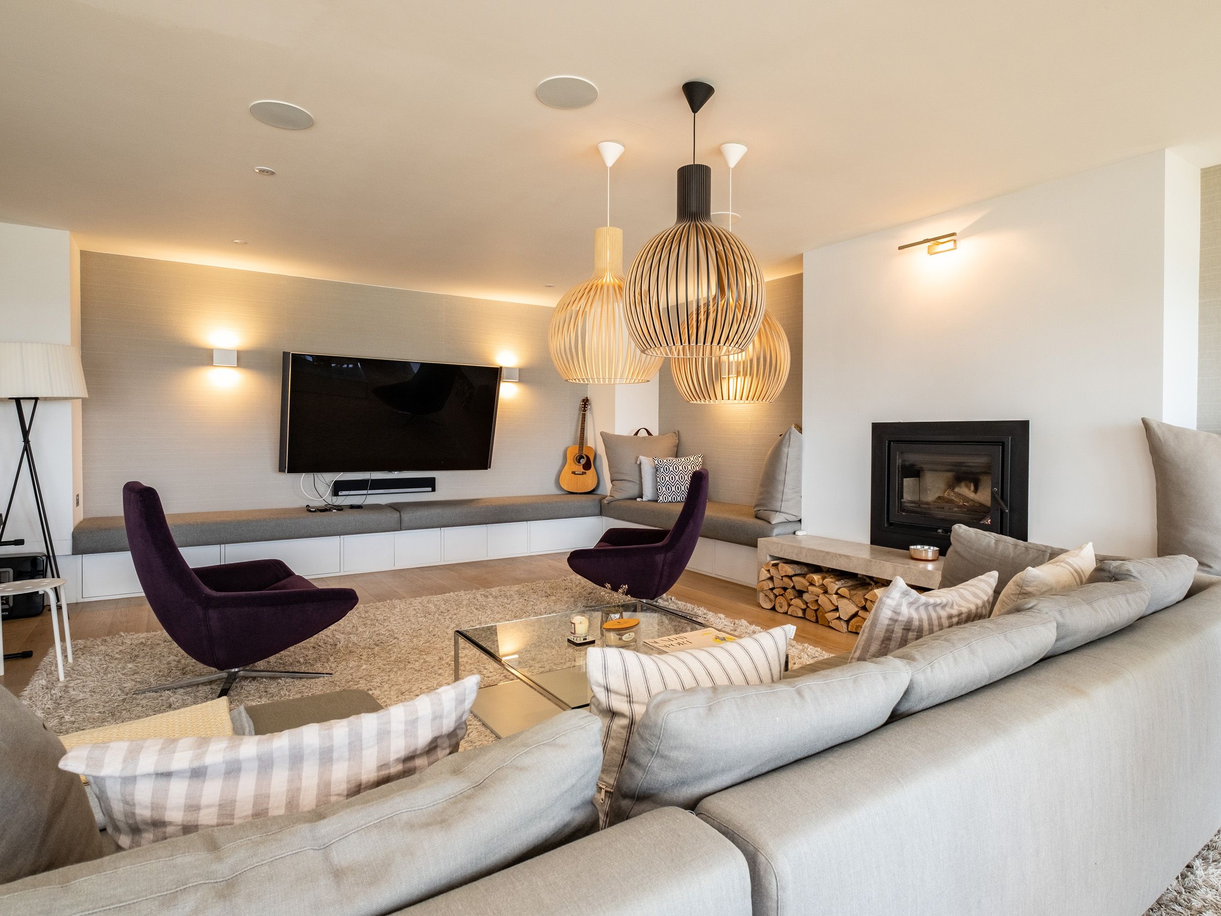 Accomodation Details Over three floors. Six bedrooms: 1 x emperor size, freestanding bath and en-suite walk-in shower, double basin and WC, 1 x king-size with en-suite bath, shower over, basin and WC, 1 x double with balcony and en-suite walk-in shower, basin and WC, 1 x king-size and en-suite walk-in shower, basin, heated towel rail and WC, 2 x lower-ground-floor family rooms with twins (zip/link can be super-king-size on request at least one week before your booking). 2 x lower-ground-floor shower rooms with walk-in showers, basins and WCs. 2 x lower-ground-floor walk-in showers. 2 x cloakrooms with basins and WCs. Open-plan living space with kitchen, dining area and sitting area with woodburning stove (logs not included) and balcony. Utility. Study. Lower-ground-floor games room. The bed configuration will be made up as per the description, If you require the beds to be made up differently, please inform us at least 7 days prior to your arrival date.