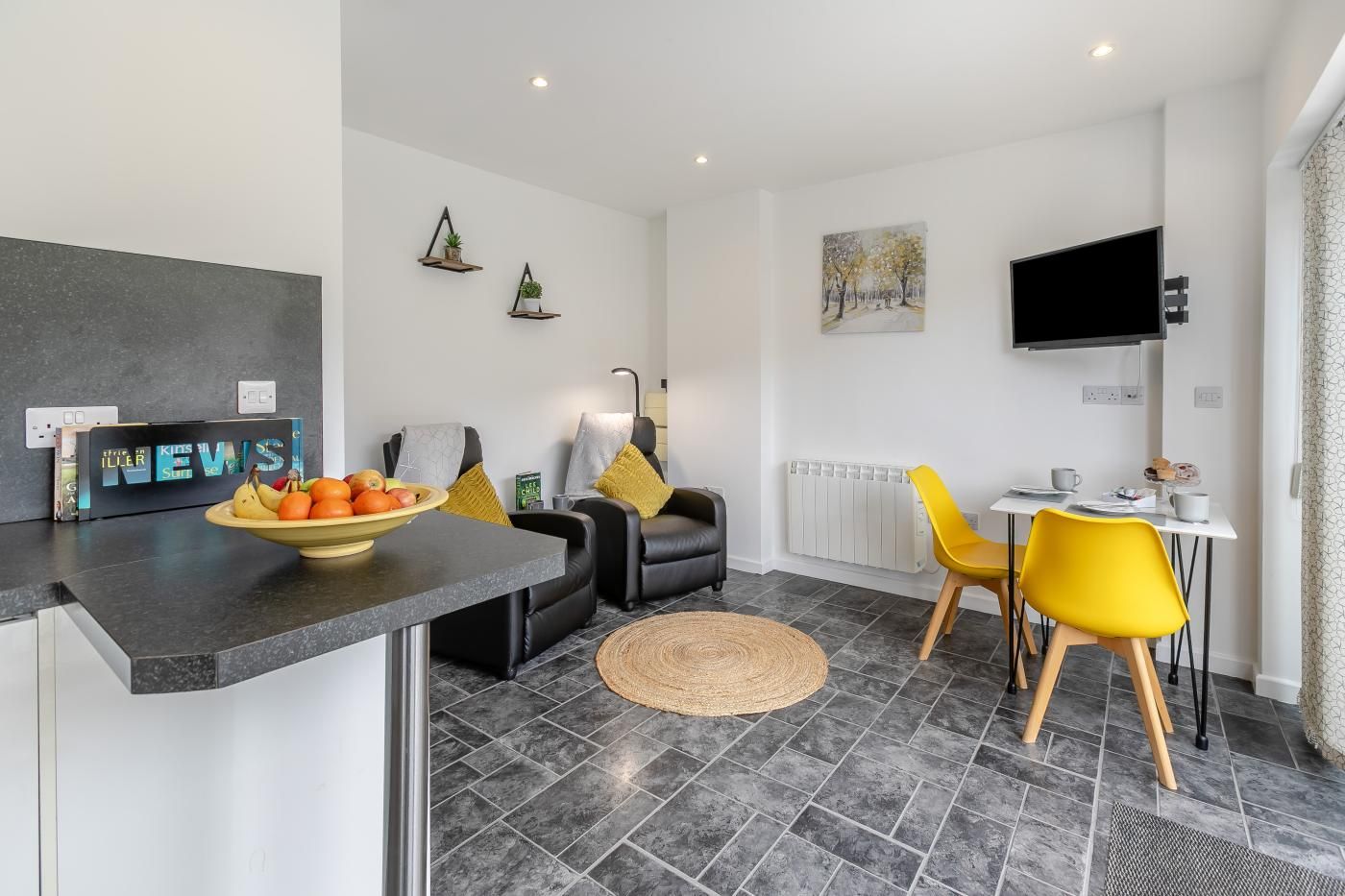 This single-storey wooden lodge has an open-plan living space with a sleek fitted kitchen.